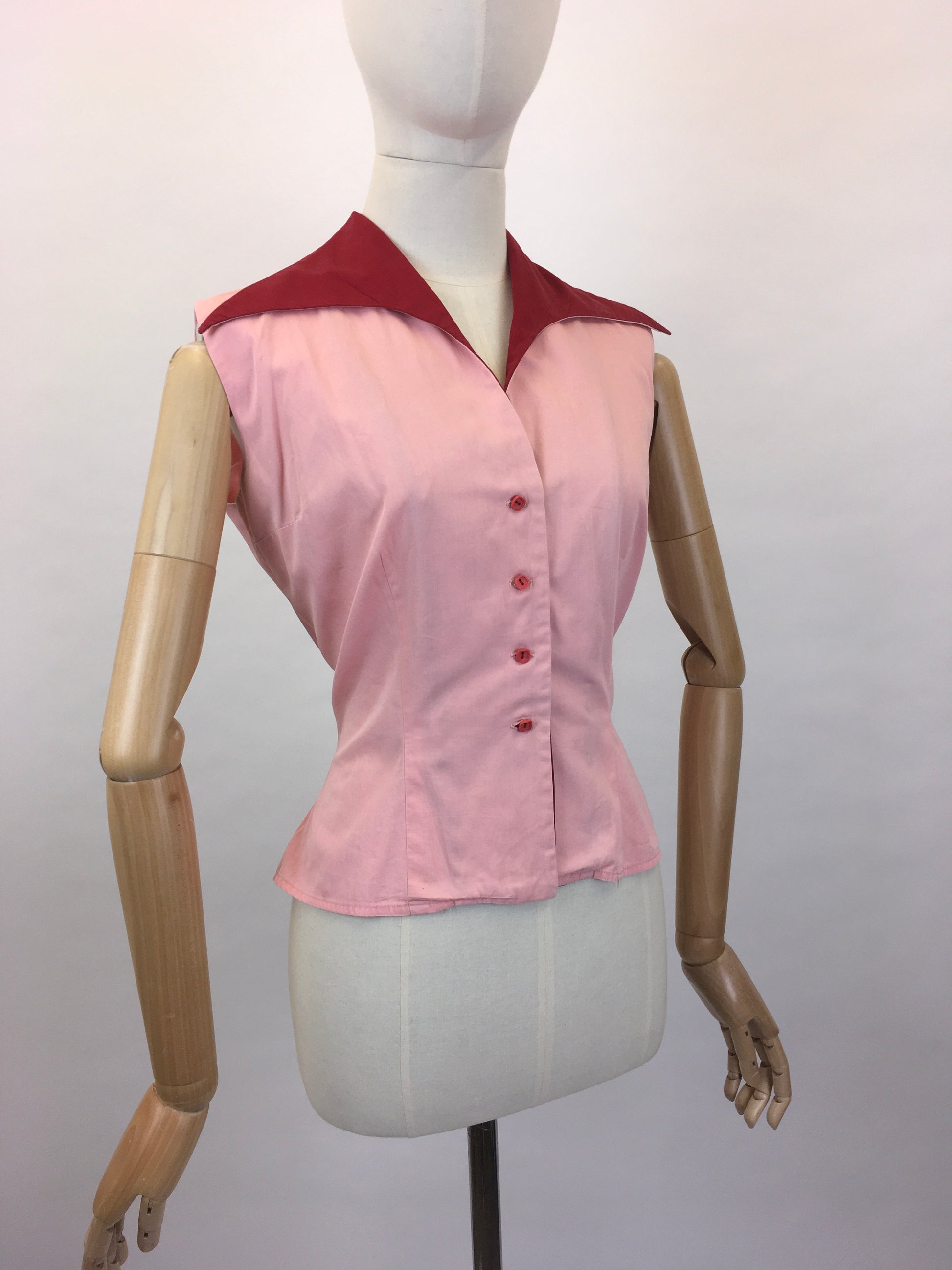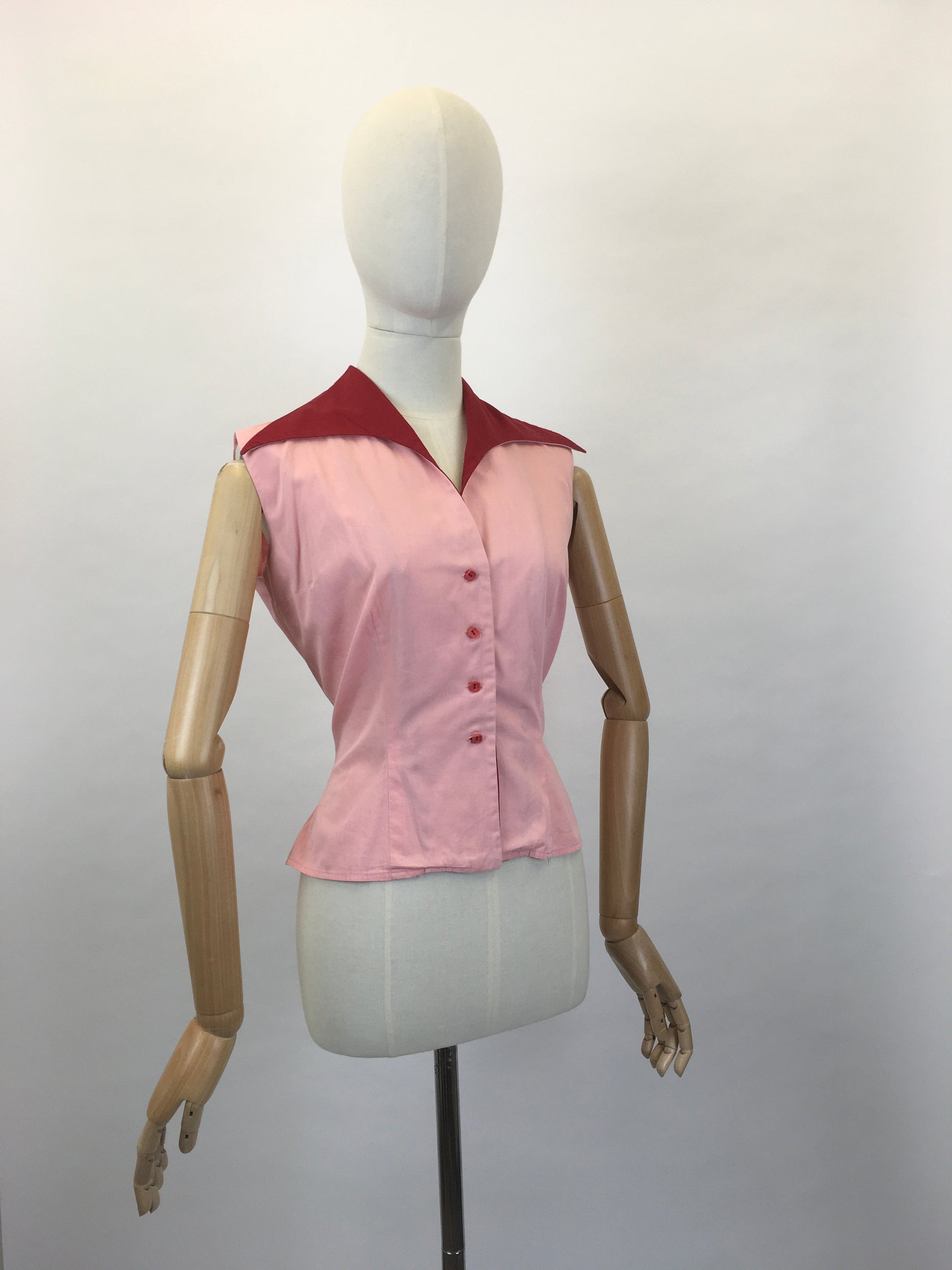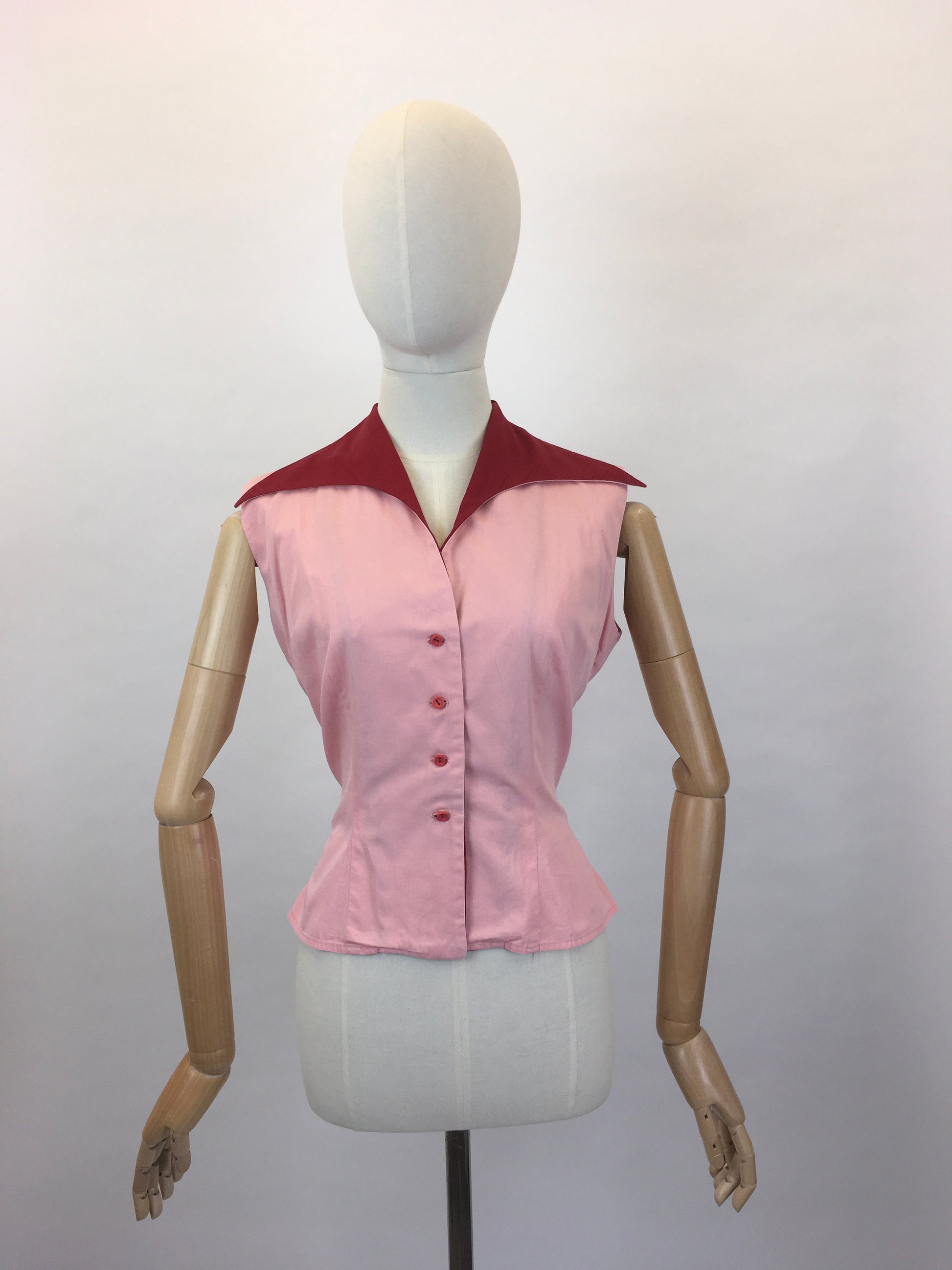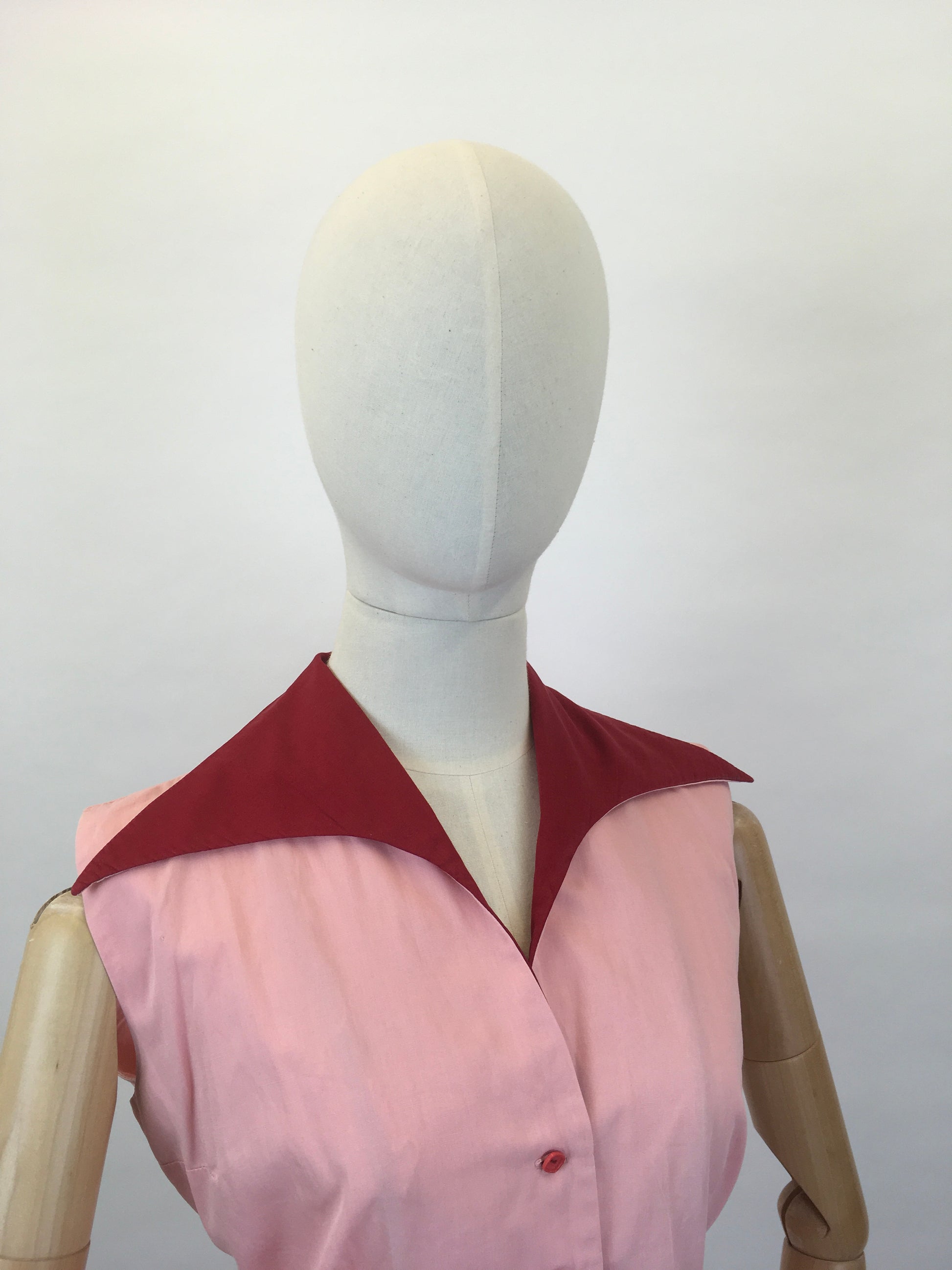 Vintage darling 1950s Cotton Day Blouse made by ‘ Johnathon Logan’. In a lovely contrasting deep burgundy and Pink cotton with matching buttons. The shape is fabulous with an oversized pointed collar, button front, nipped waist with dart shaping and sleeveless design. Great worn tucked in or out of 50’s capris / wing pants or shorts and skirts. A lovely piece to wear with or without layering with a cardigan or jacket in the cooler months.