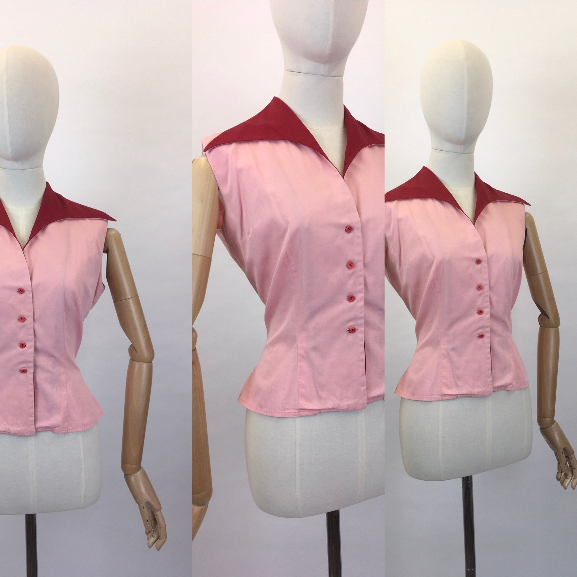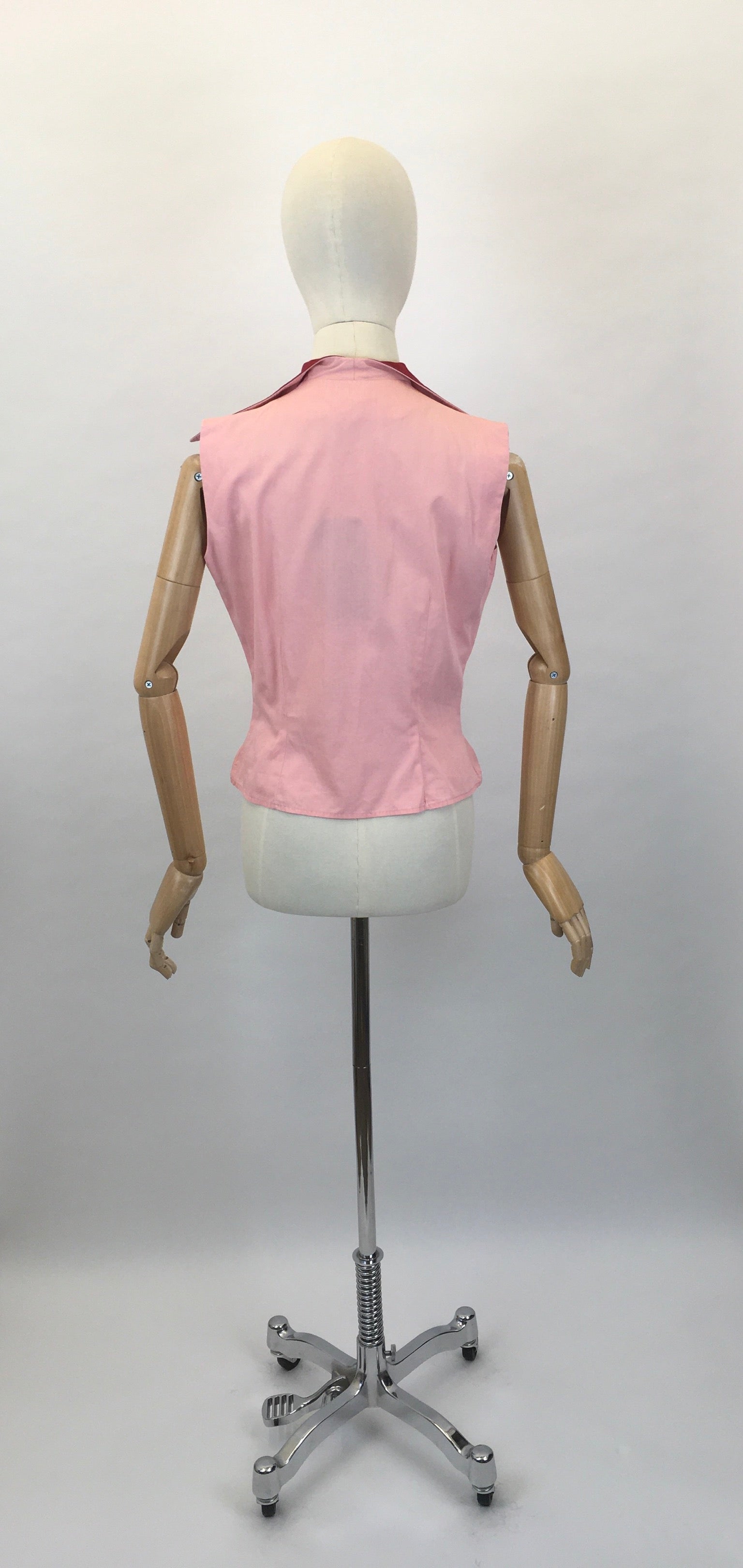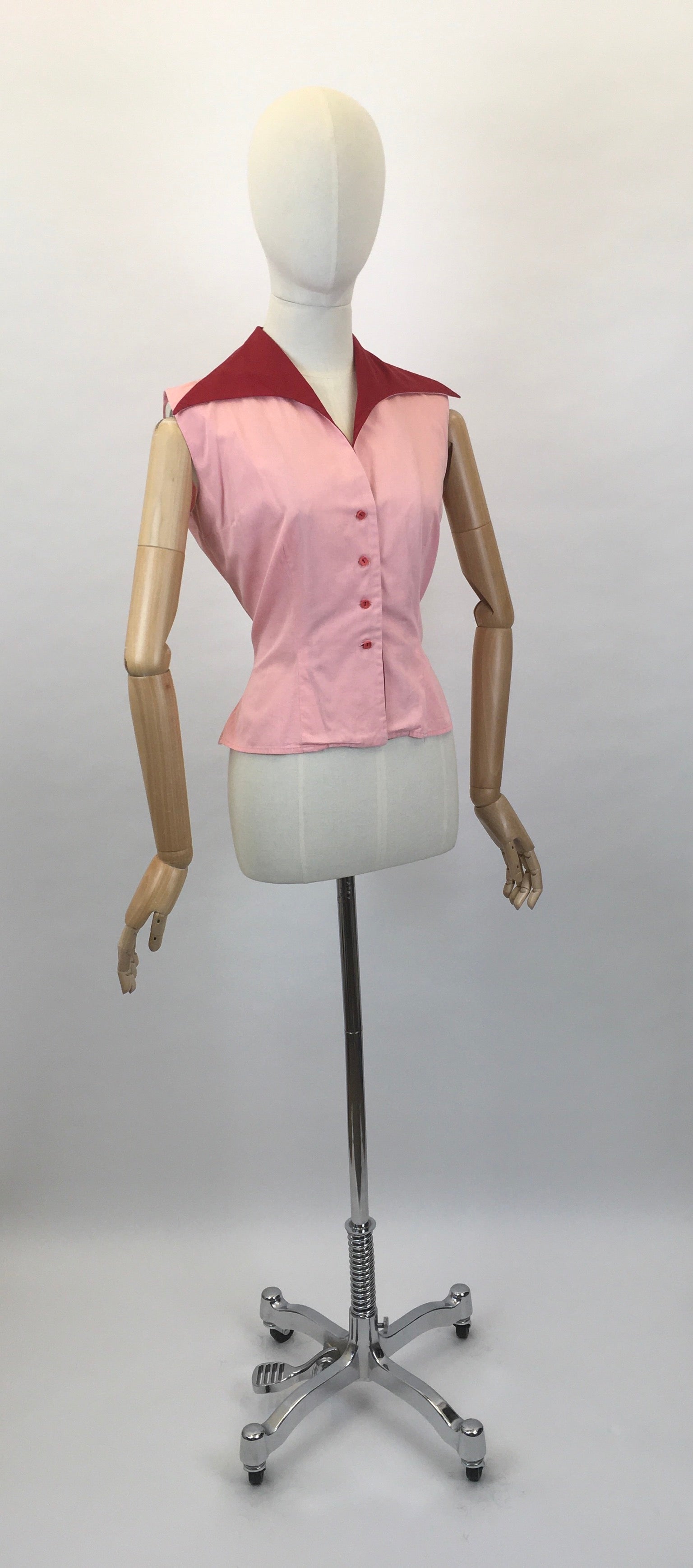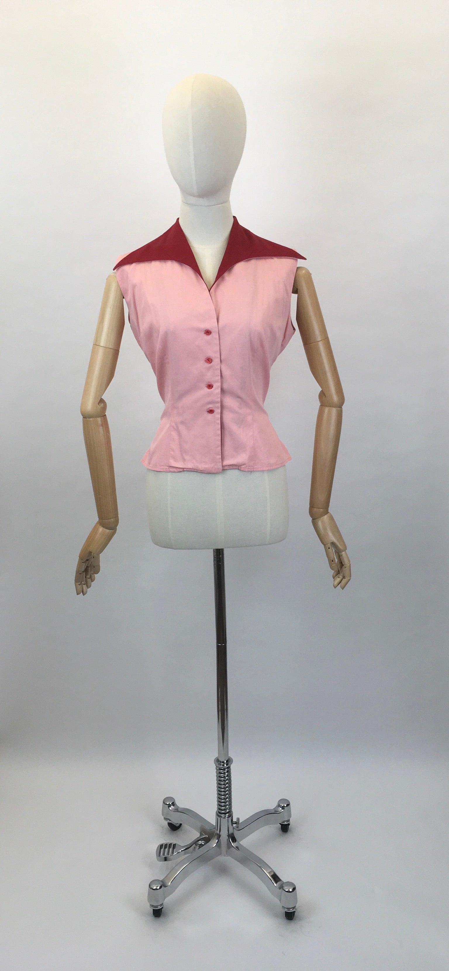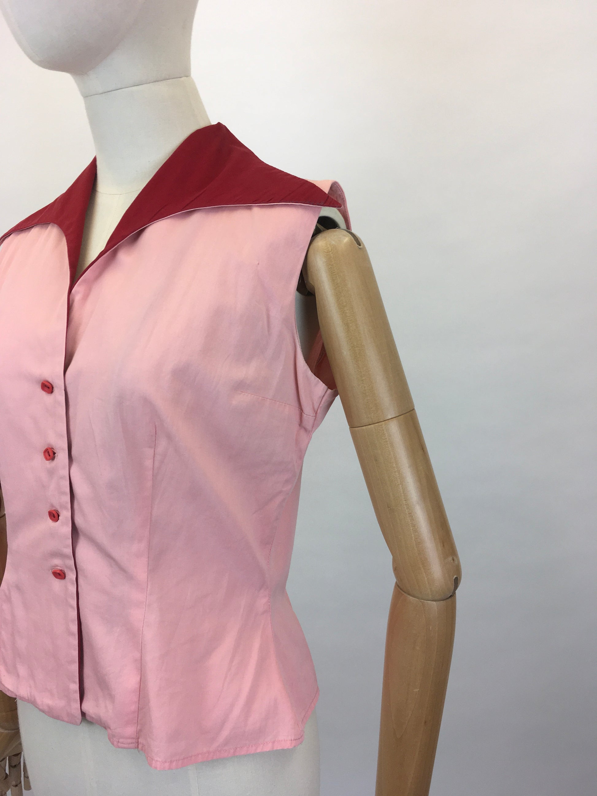 Vintage darling 1950s Cotton Day Blouse made by ‘ Johnathon Logan’. In a lovely contrasting deep burgundy and Pink cotton with matching buttons. The shape is fabulous with an oversized pointed collar, button front, nipped waist with dart shaping and sleeveless design. Great worn tucked in or out of 50’s capris / wing pants or shorts and skirts. A lovely piece to wear with or without layering with a cardigan or jacket in the cooler months.