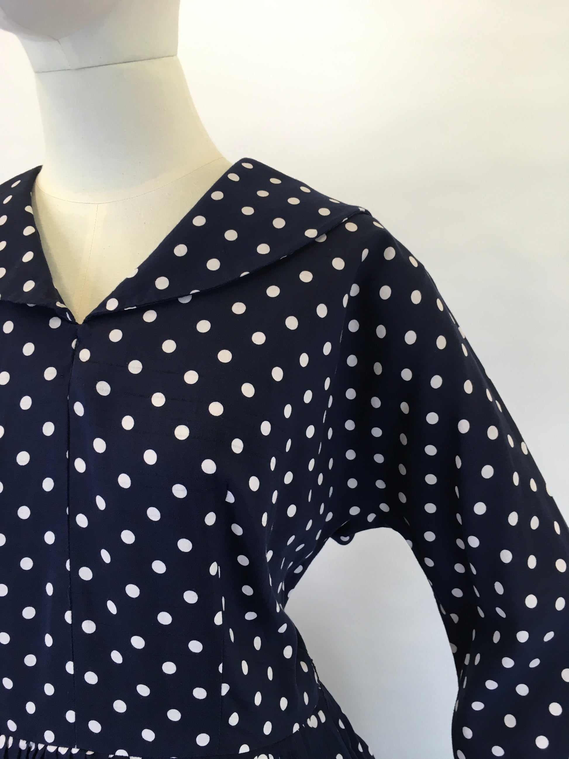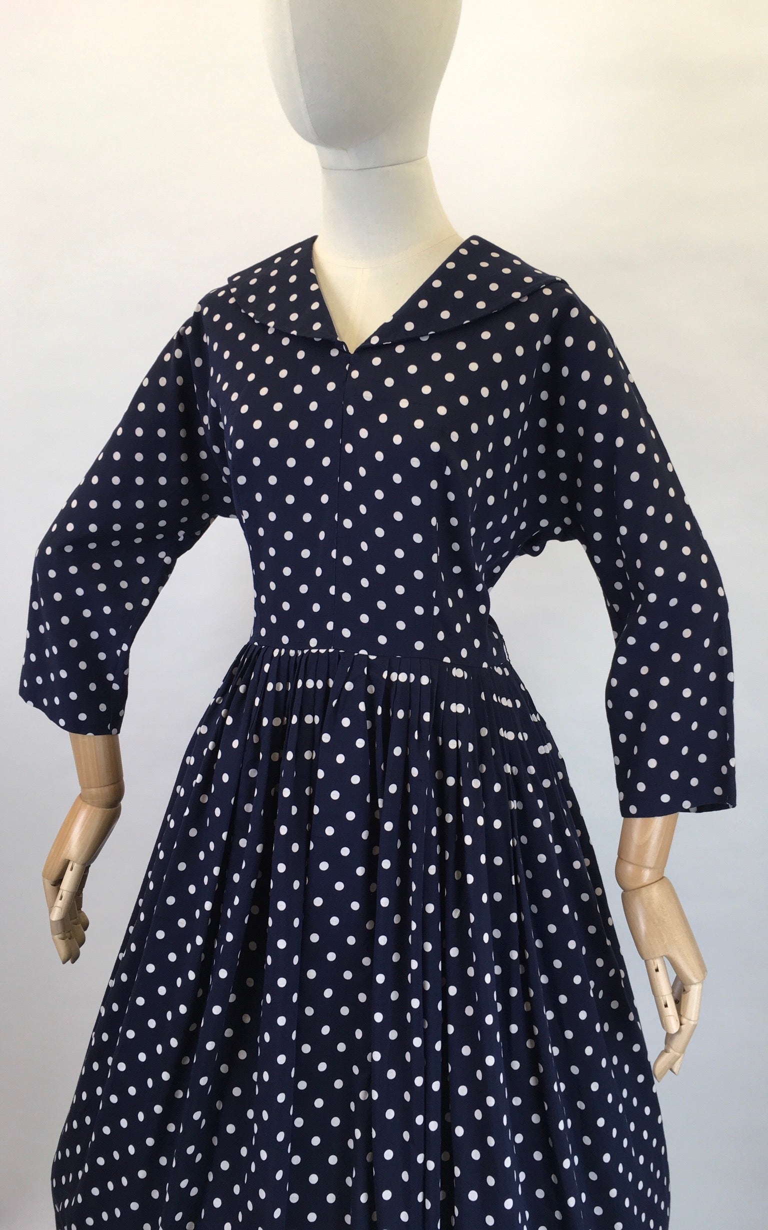 Vintage 1950s deep navy polka dot day dress made from a lightweight cotton. The dress has a very typical 50’s silhouette featuring dolman 3/4 length sleeves, v neckline, waist seam which falls into a pleated full skirt. Fastens with a back central metal zip. Shown with a petticoat for added fullness but looks equally as nice without. A great staple piece and great worn throughout different seasons with layering and varying accessories.