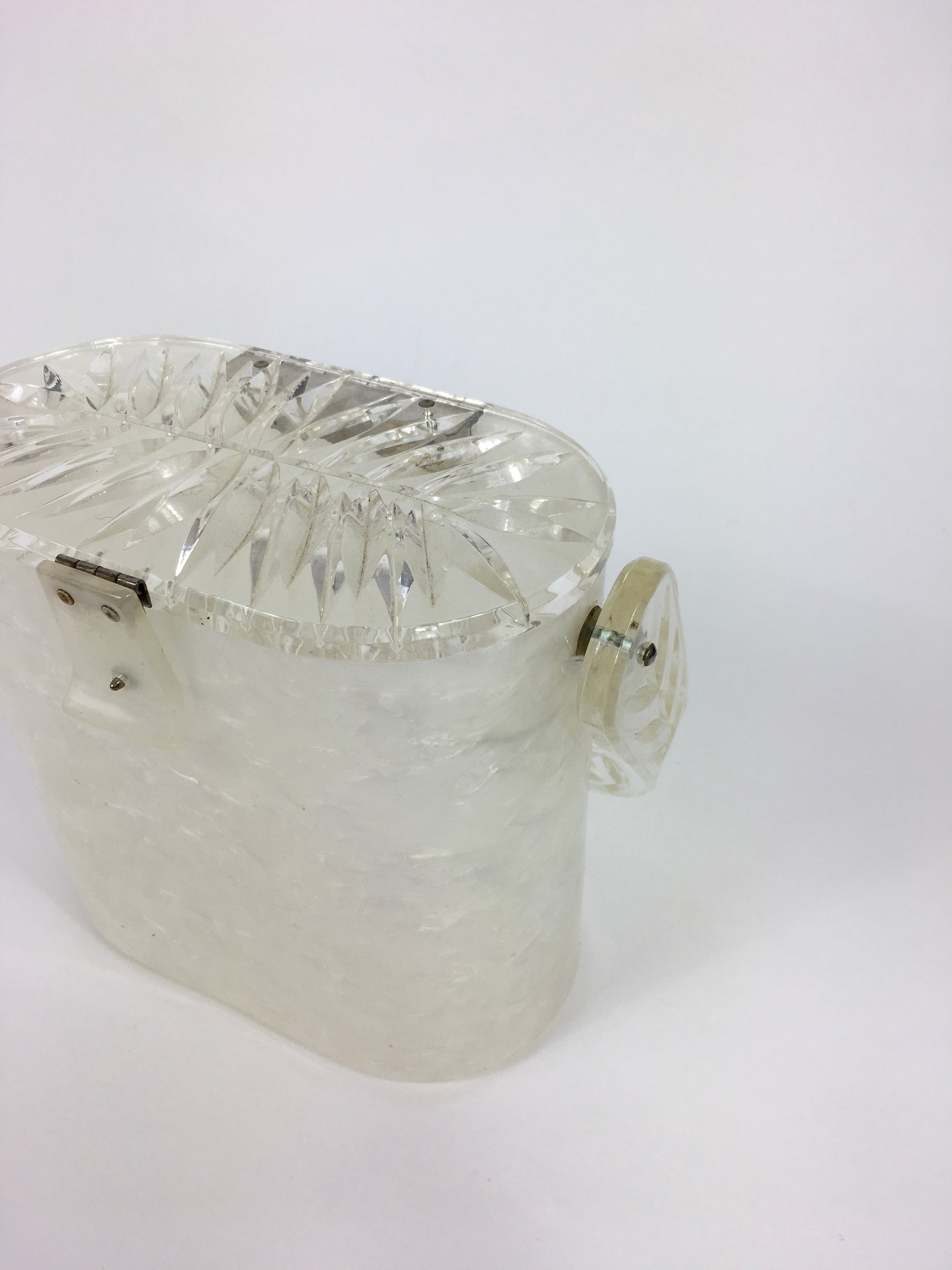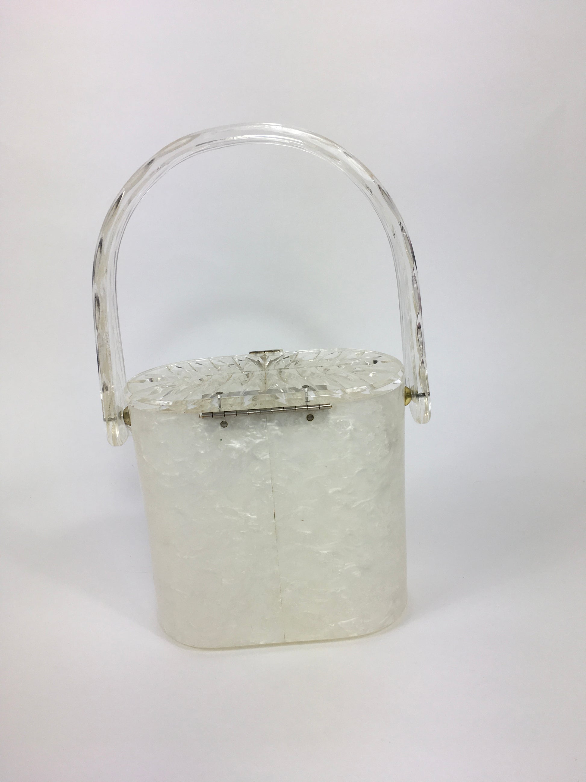 Vintage 1950’s lucite handbag in a marbled white base with carved clear lucite to the top and handle. The bag fastens with a clasp to the front. A fabulous piece which is great for modern use big enough to fit in a mobile phone, money and lipstick.