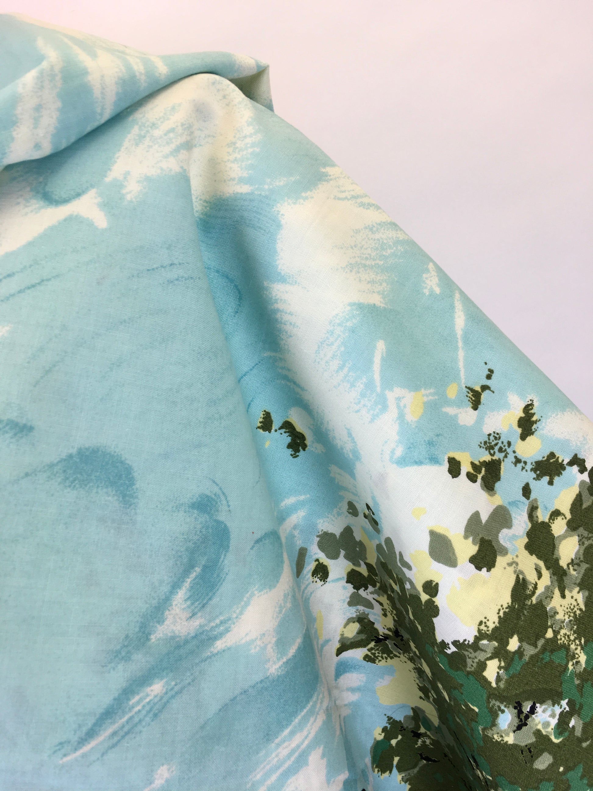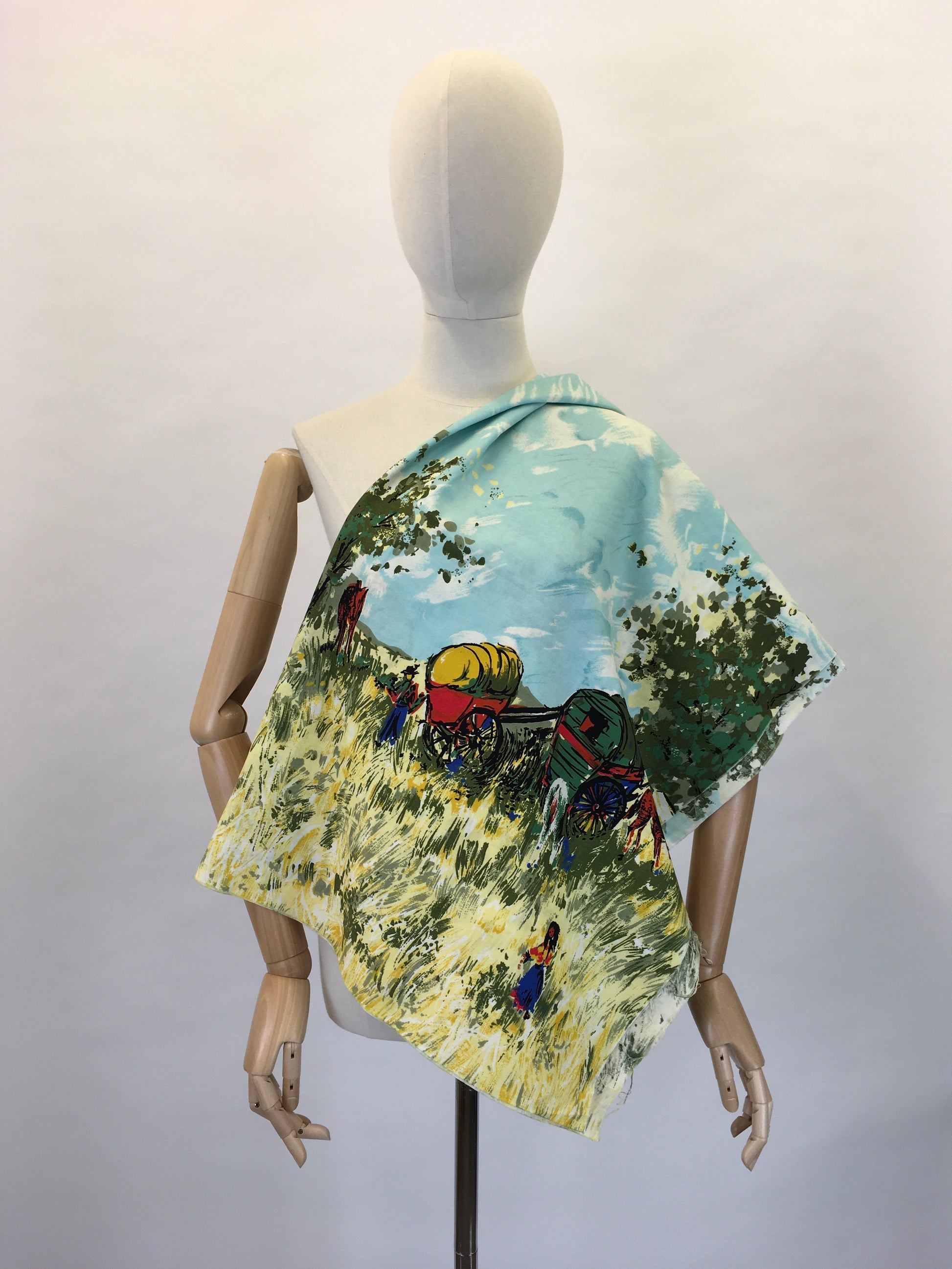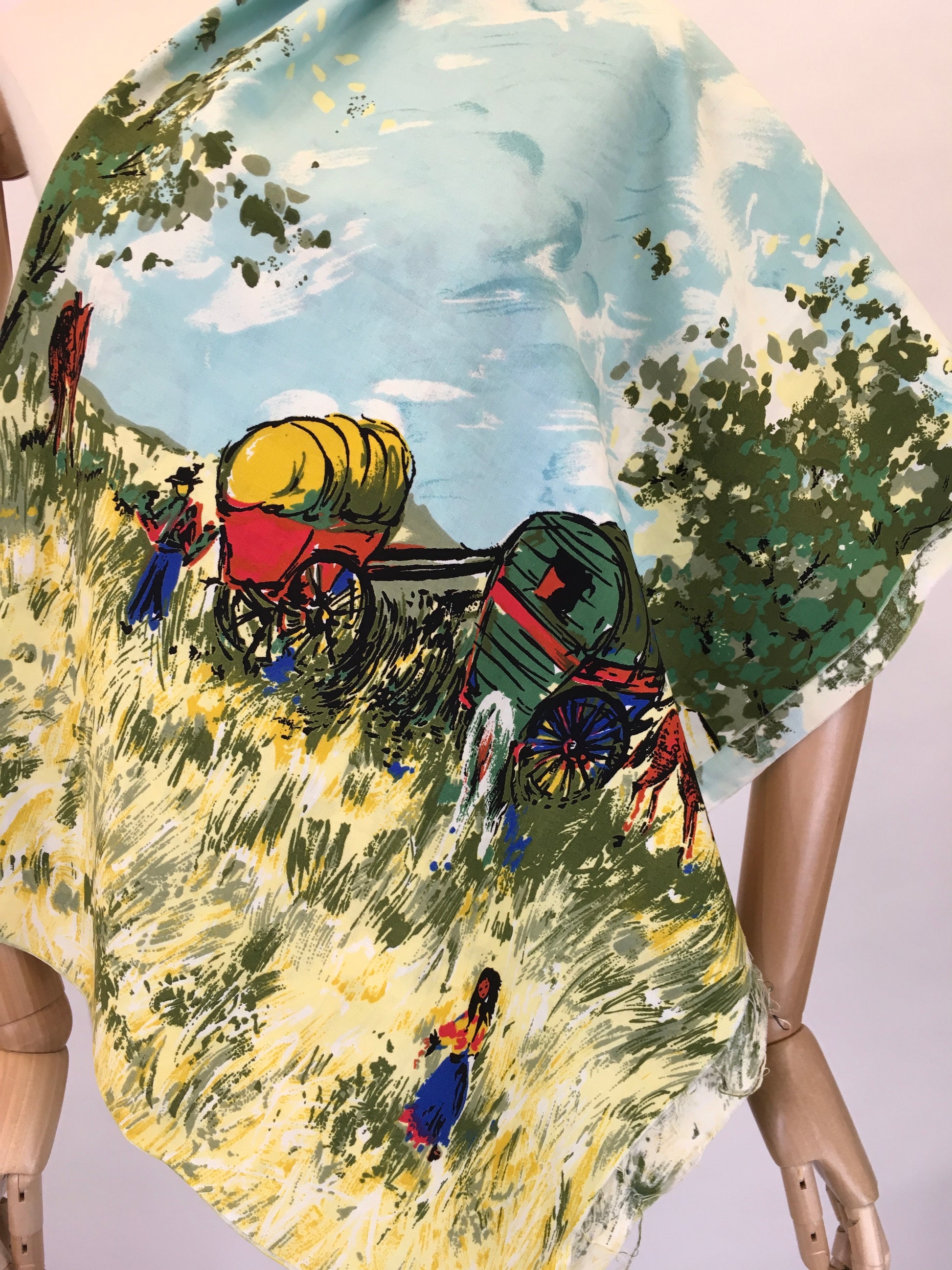 Vintage 1950s fabulous novelty border print cotton fabric featuring western Stagecoach’s, horses, people and landscape. Measuring just under 2m this is a fabulous piece to turn into a 50’s pleated skirt!