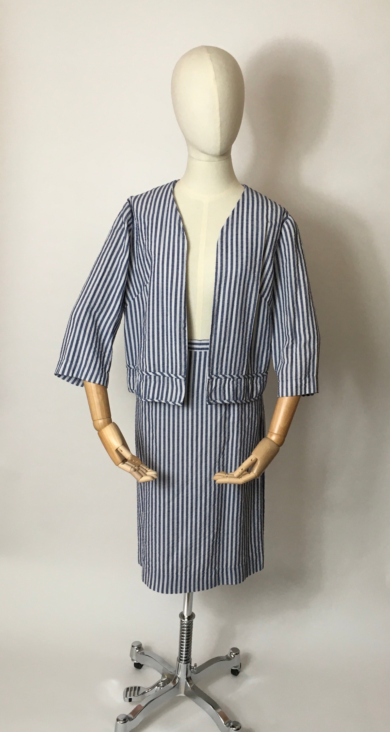 Vintage 1950's summer suit consisting of a simple jacket and skirt set. Simple but so easy to wear this set is made from a lovely lightweight seersucker fabric in a blue and white stripe. Perfect for keeping cool in the summer months this piece will look fabulous worn with an accompanying blouse and straw accessories.