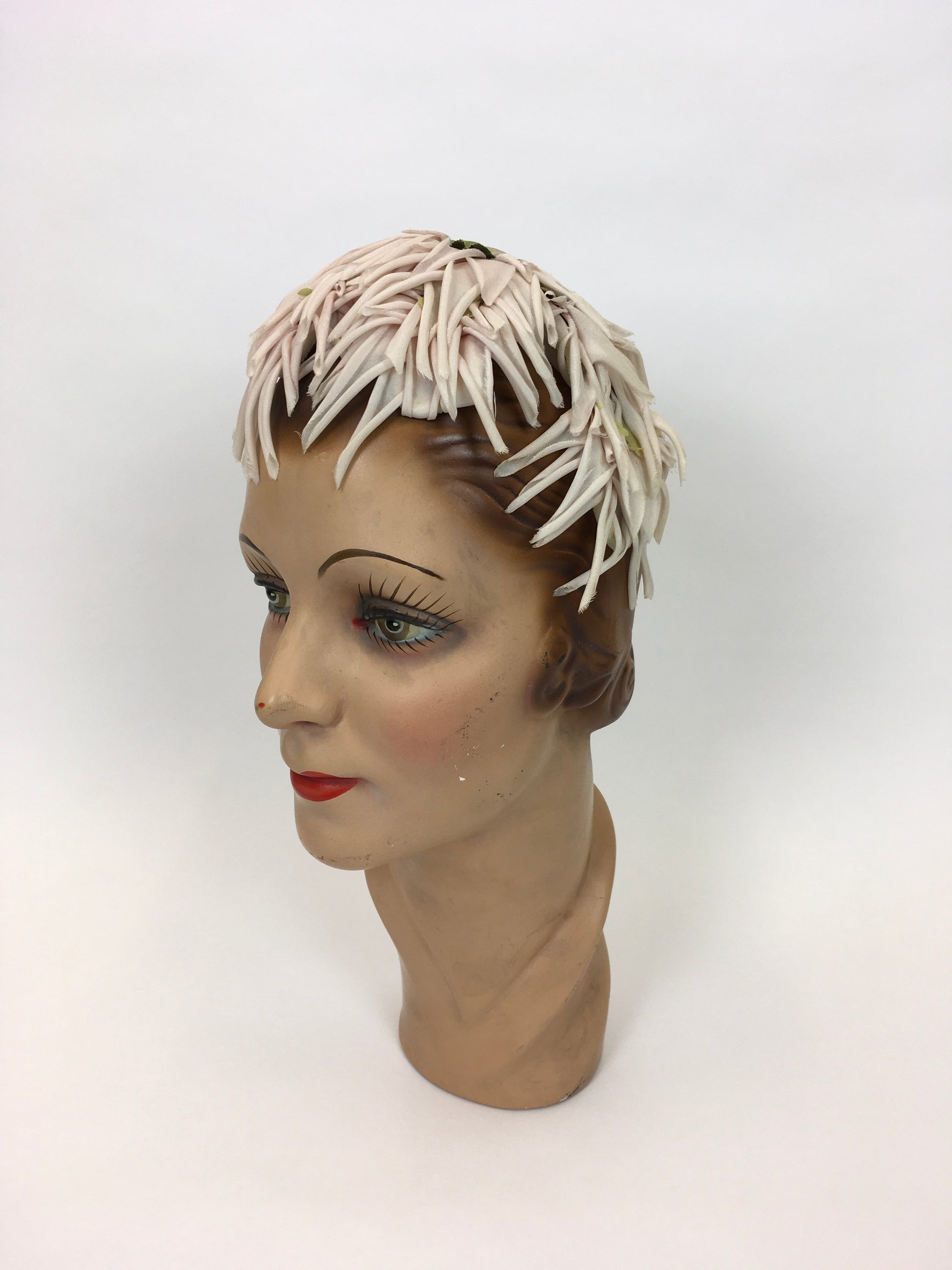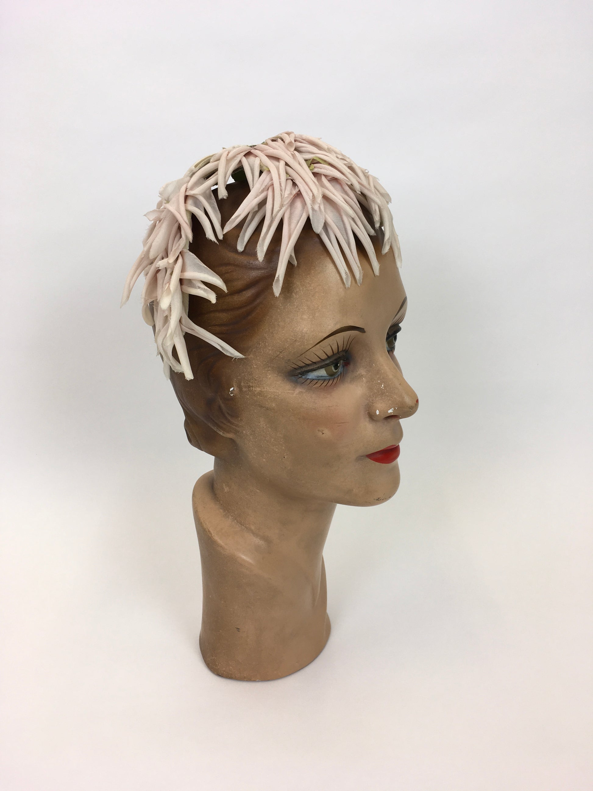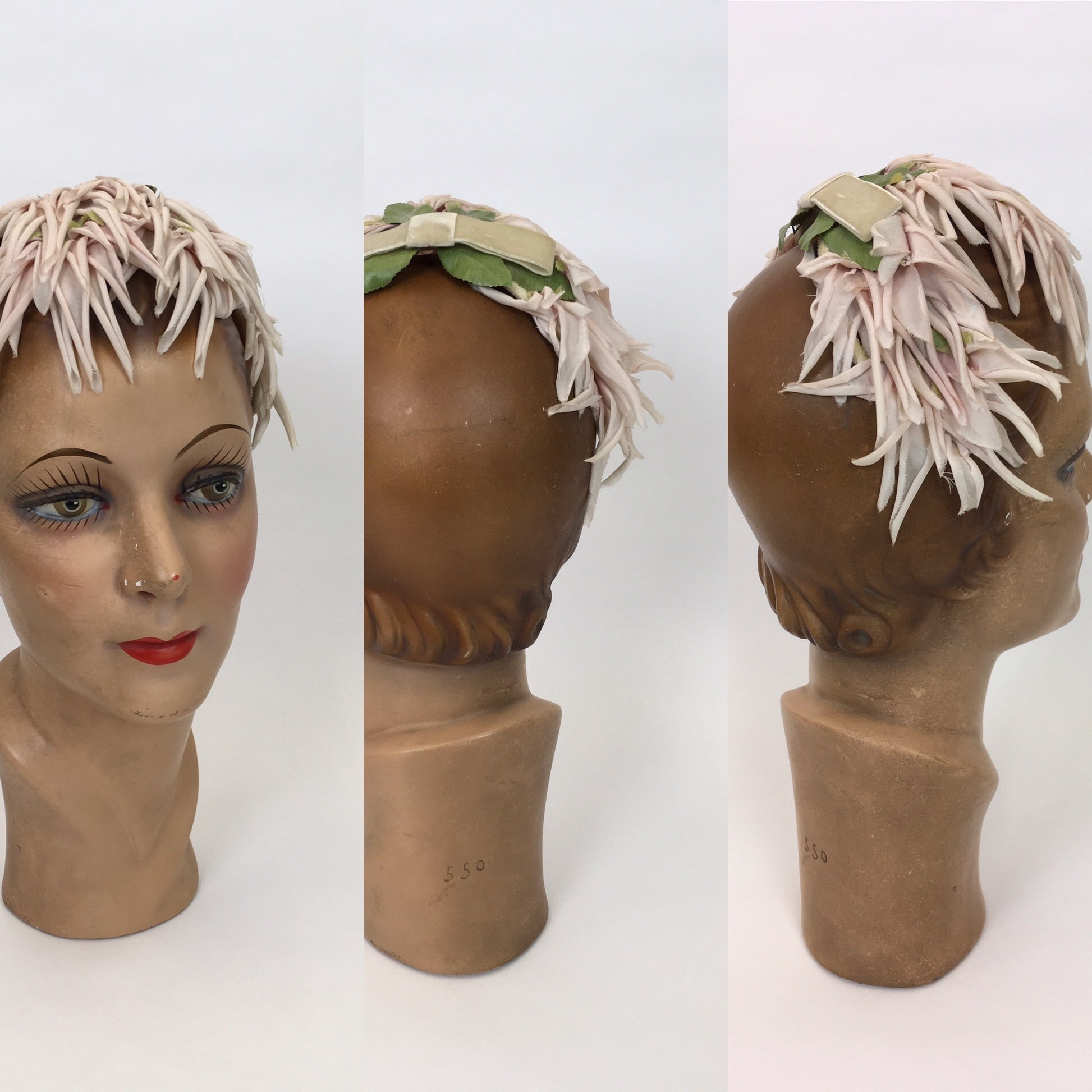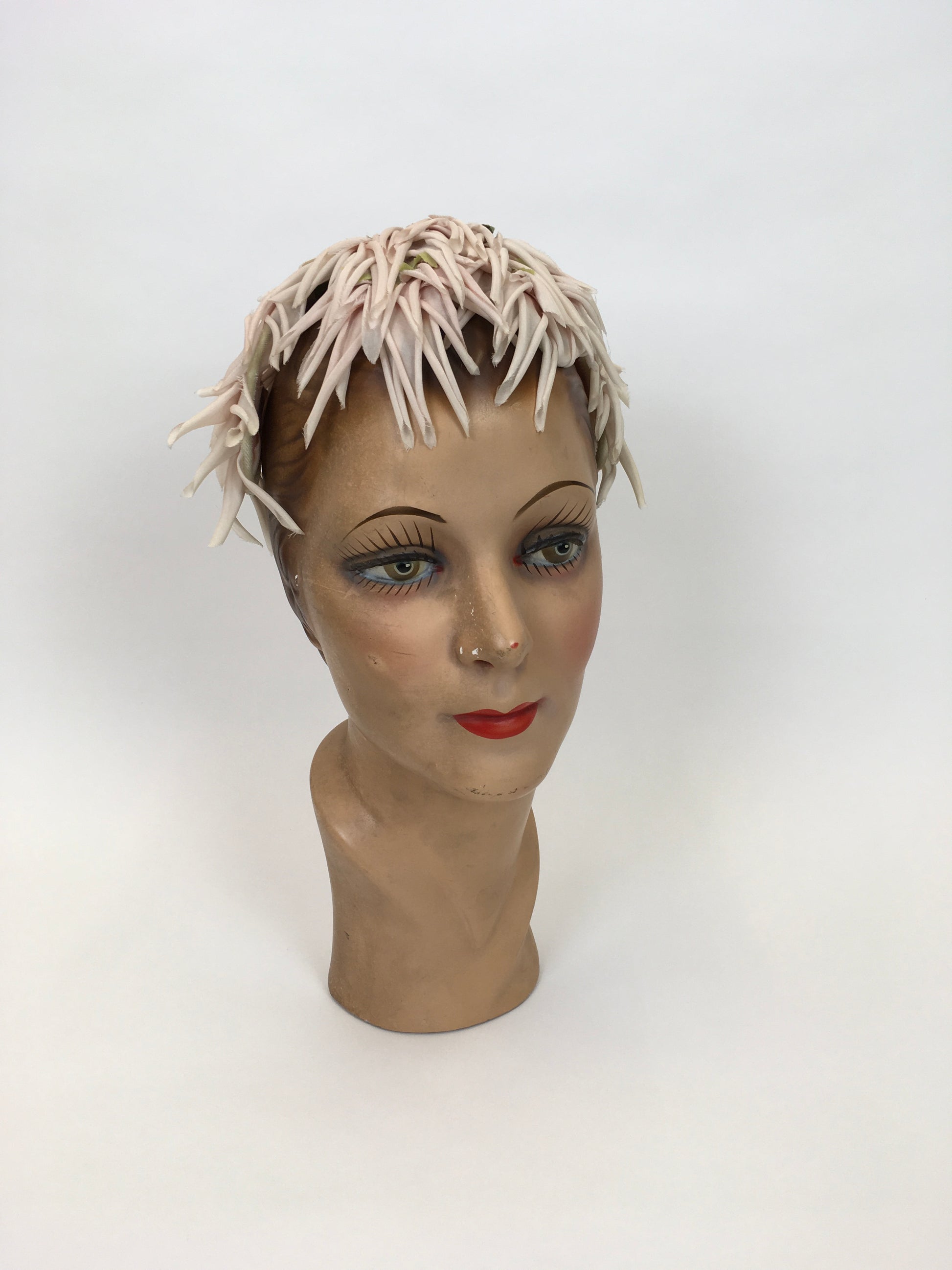 Vintage Darling 1950s headpiece in a beautiful dainty colour palette of soft powder pinks, Ivories and green foliage. Made from a velvet headband construction so moulds to your head for gripping and shaping. A classic piece from 50’s history, a lovely addition to any 50’s Dior style new look Suit or full circle evening dress !