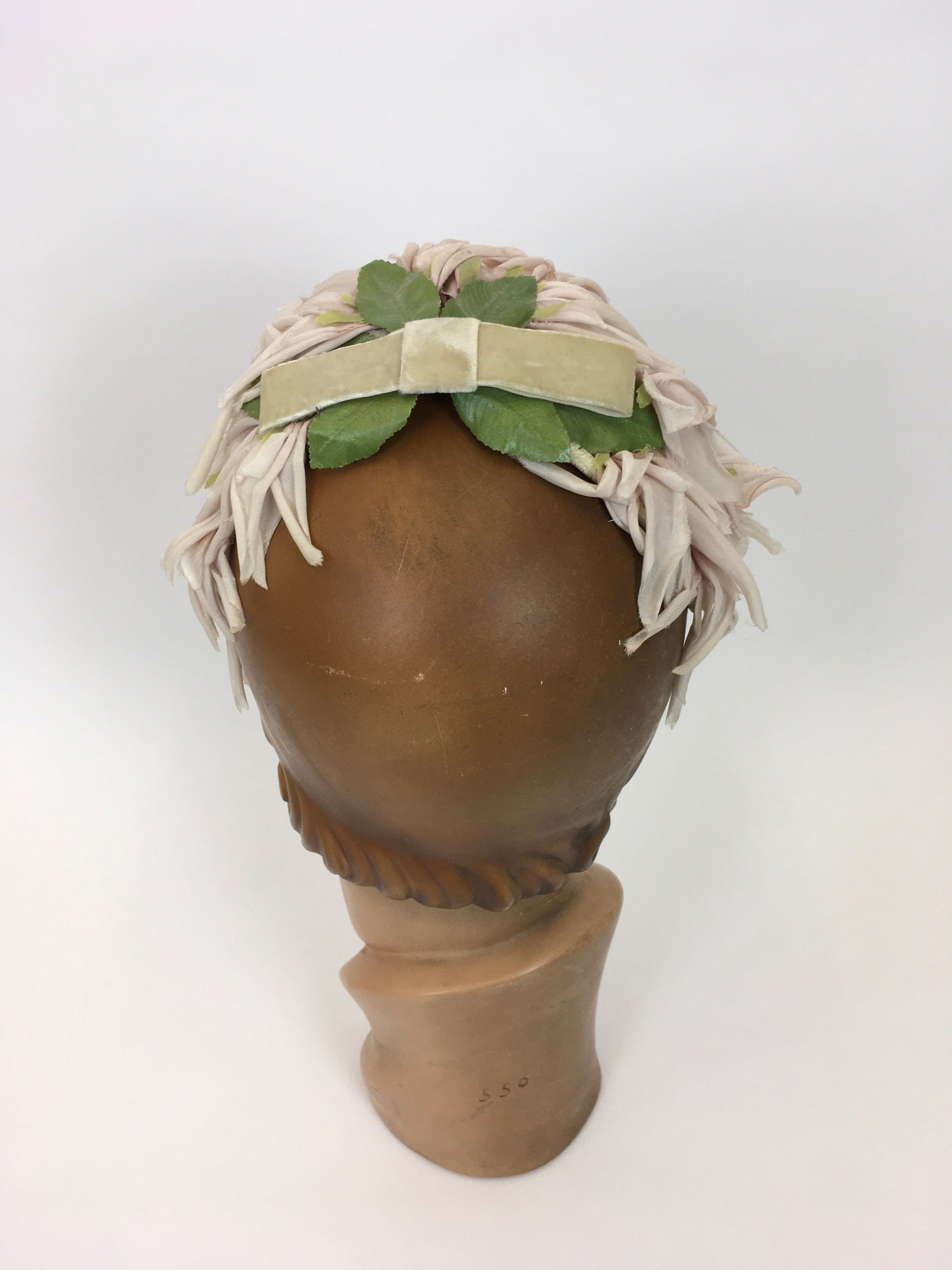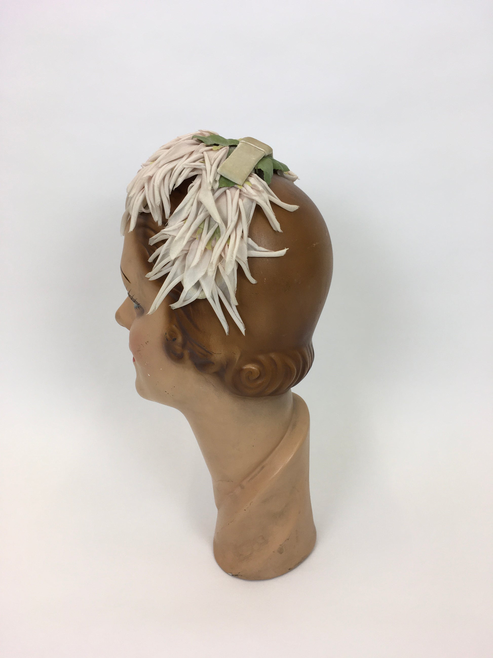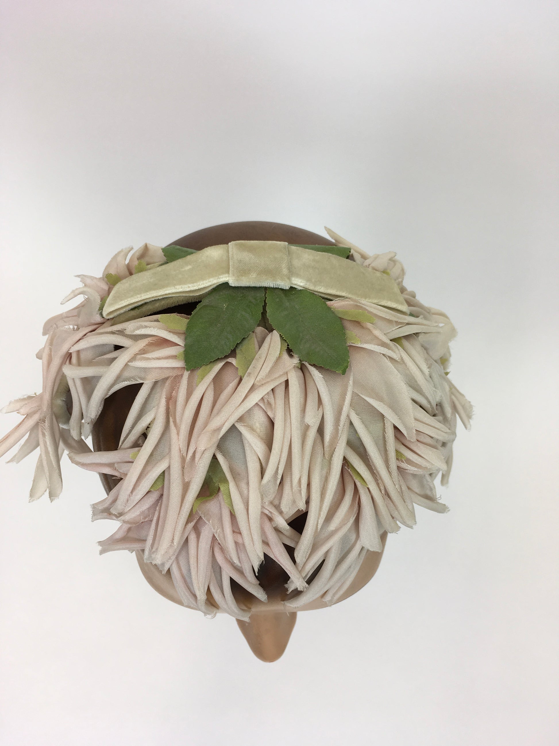 Original 1950s Velvet and Floral Headpiece - In a Delicate Pallet of Soft Pinks, Pale Ivory and Green