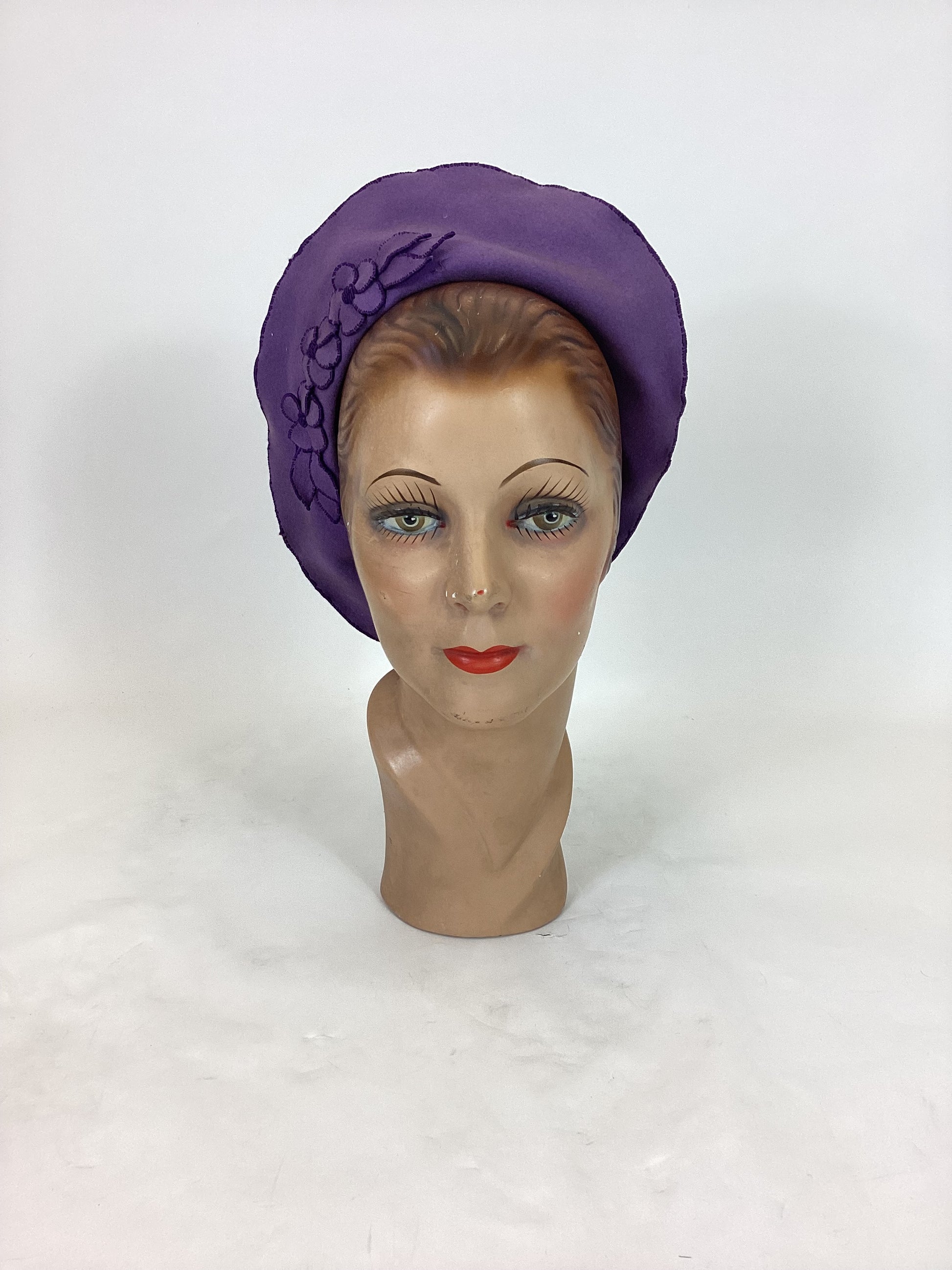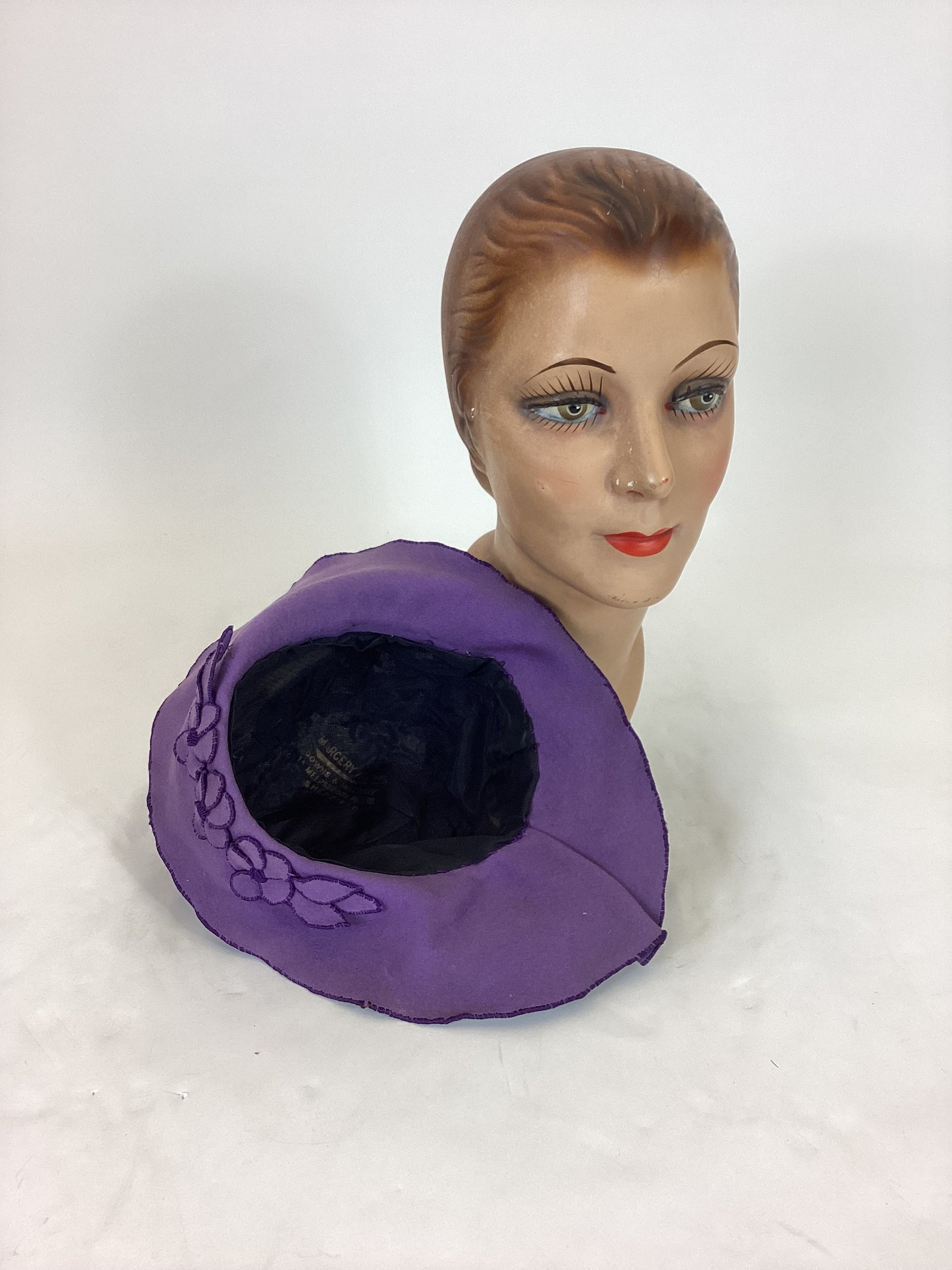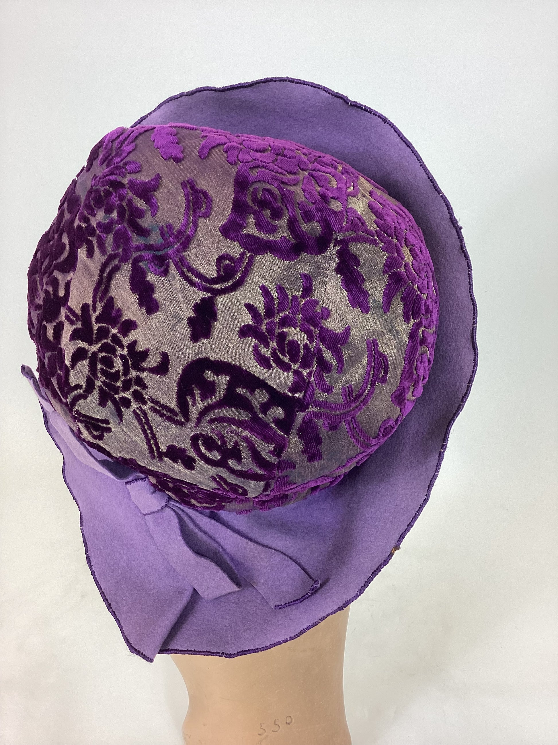Vintage 20’s/30’s maybe earlier amazing hat in purple flock velvet and felt. Stiffened felt brim with upturned side where it is adorned with a few felt flowers and petals, such a lovely detail. The crown is almost translucent in a purple flock velvet brocade with the background having a shimmer ( lame’ effect). Fulled lined. A felt band around the base of the crown joins and makes a delicate bow detail to the back, where the brim falls into a tear drop shape. All edges have been neatly finished with a slightly deeper shade, which compliments the overall look. stamped maker label in the centre of lining to the crown. English made.