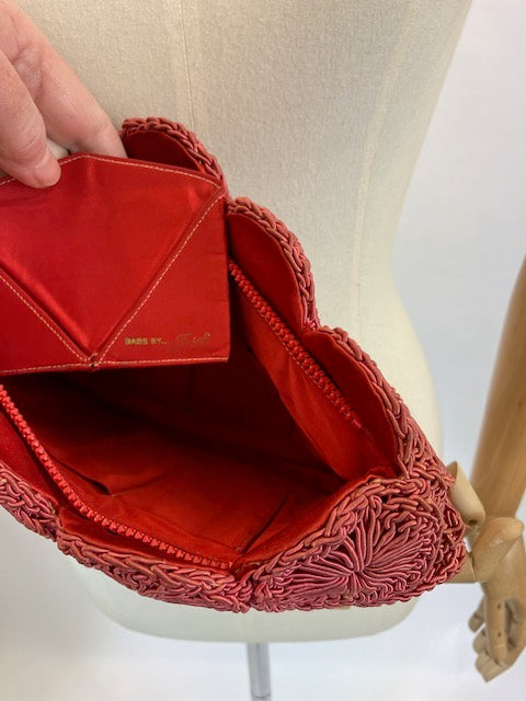 A quality made bag with the “Bags by Josef” label inside on the dance card envelope pocket. It is fully lined with separate compartments for mirror, comb, lipstick etc. A large central compartment all lined in red. The outside, albeit faded is a beautiful colour, with the pop of red lining showing through. This is still such a good clutch bag, very good size and the fade definitely adds to the charm. Zip works easily.