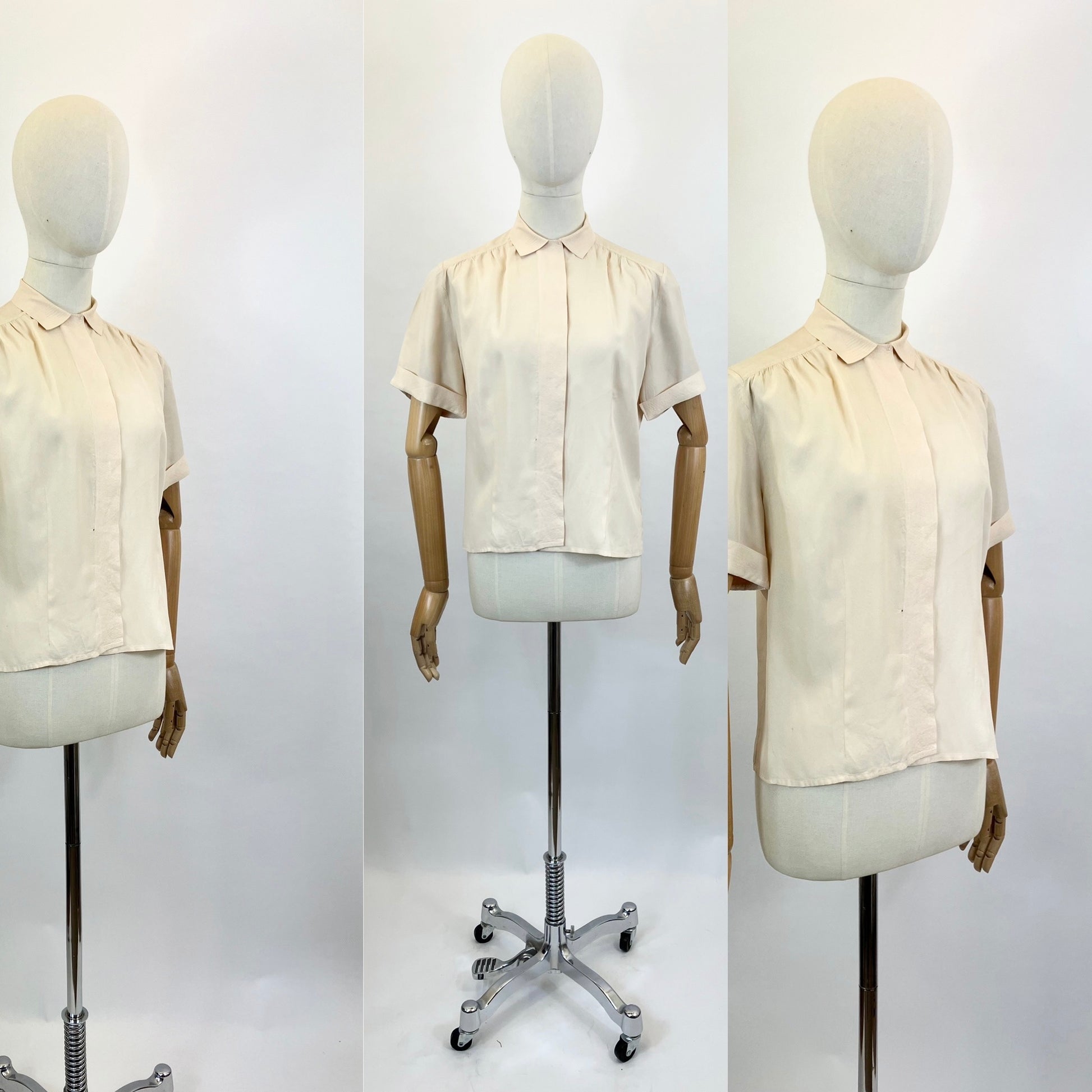 Vintage beautiful 1950’s blouse in soft Apricot. Short sleeves. No shoulder pads. Fabulous overstitched detailing to collar, cuffs and centre placket. 5 x button opening under this feature with darts to the waist.