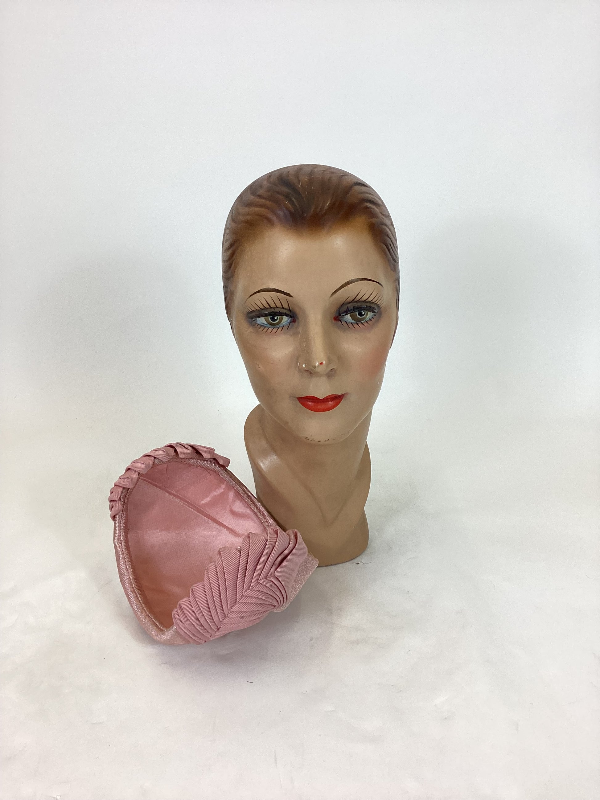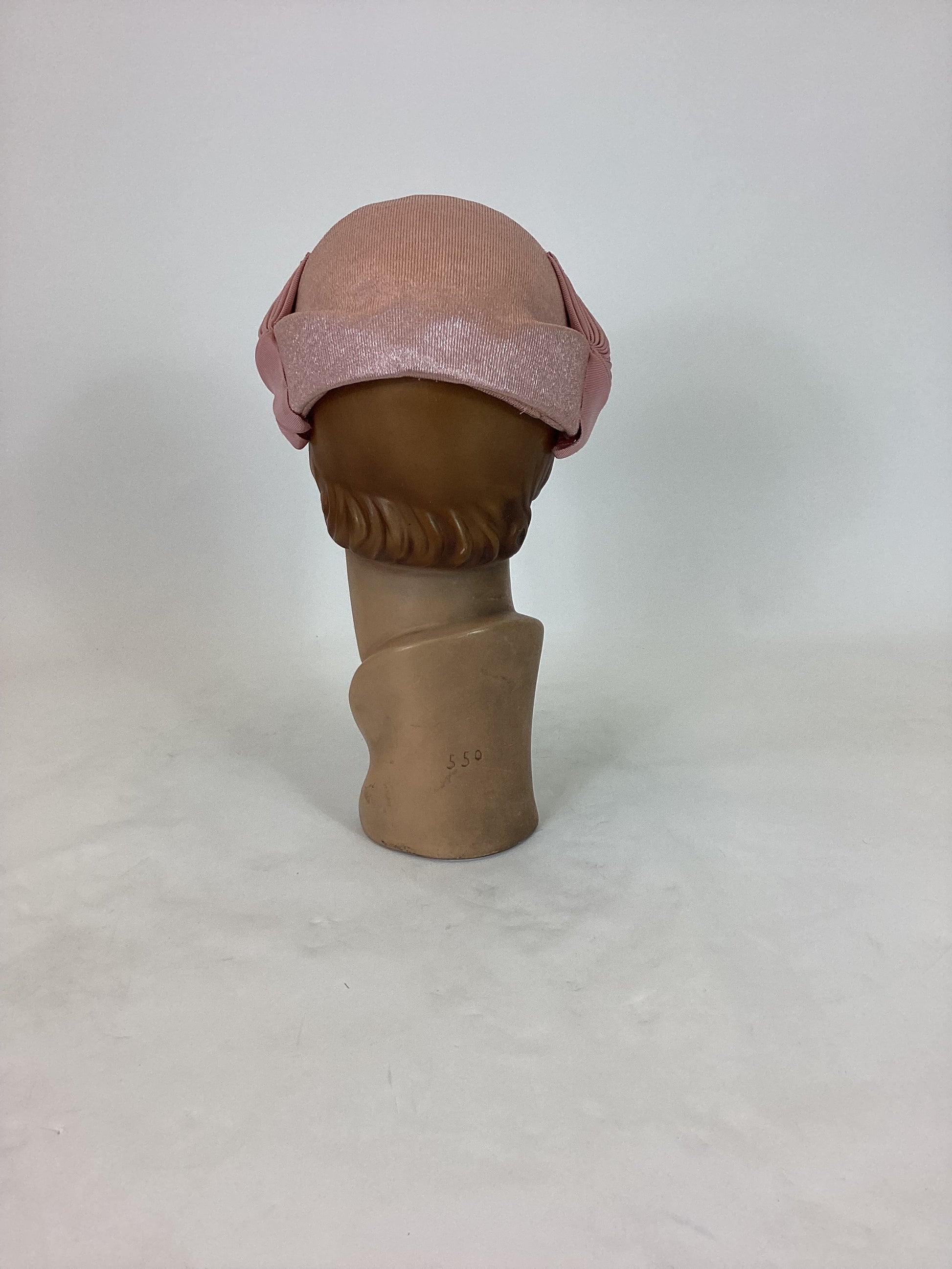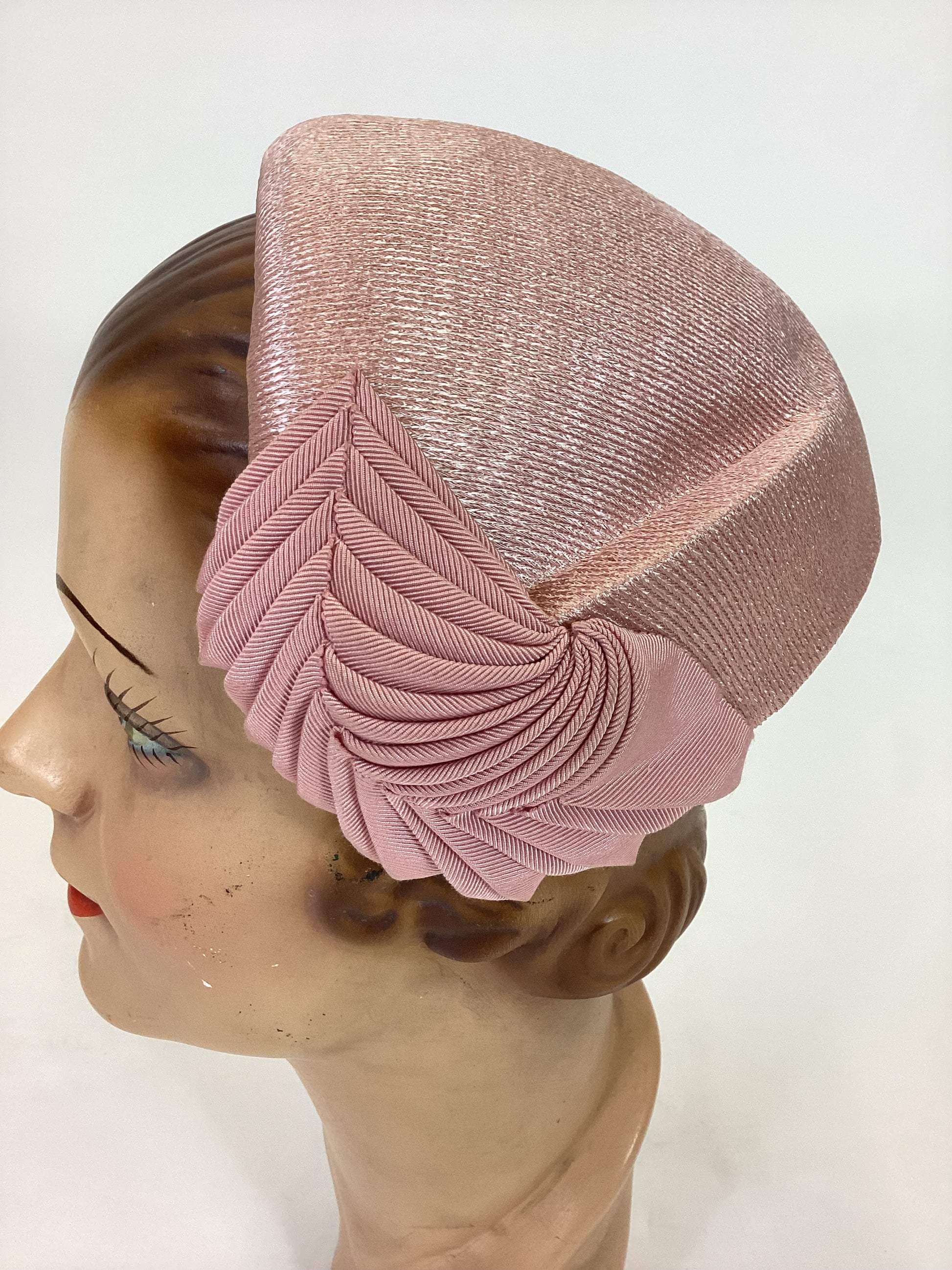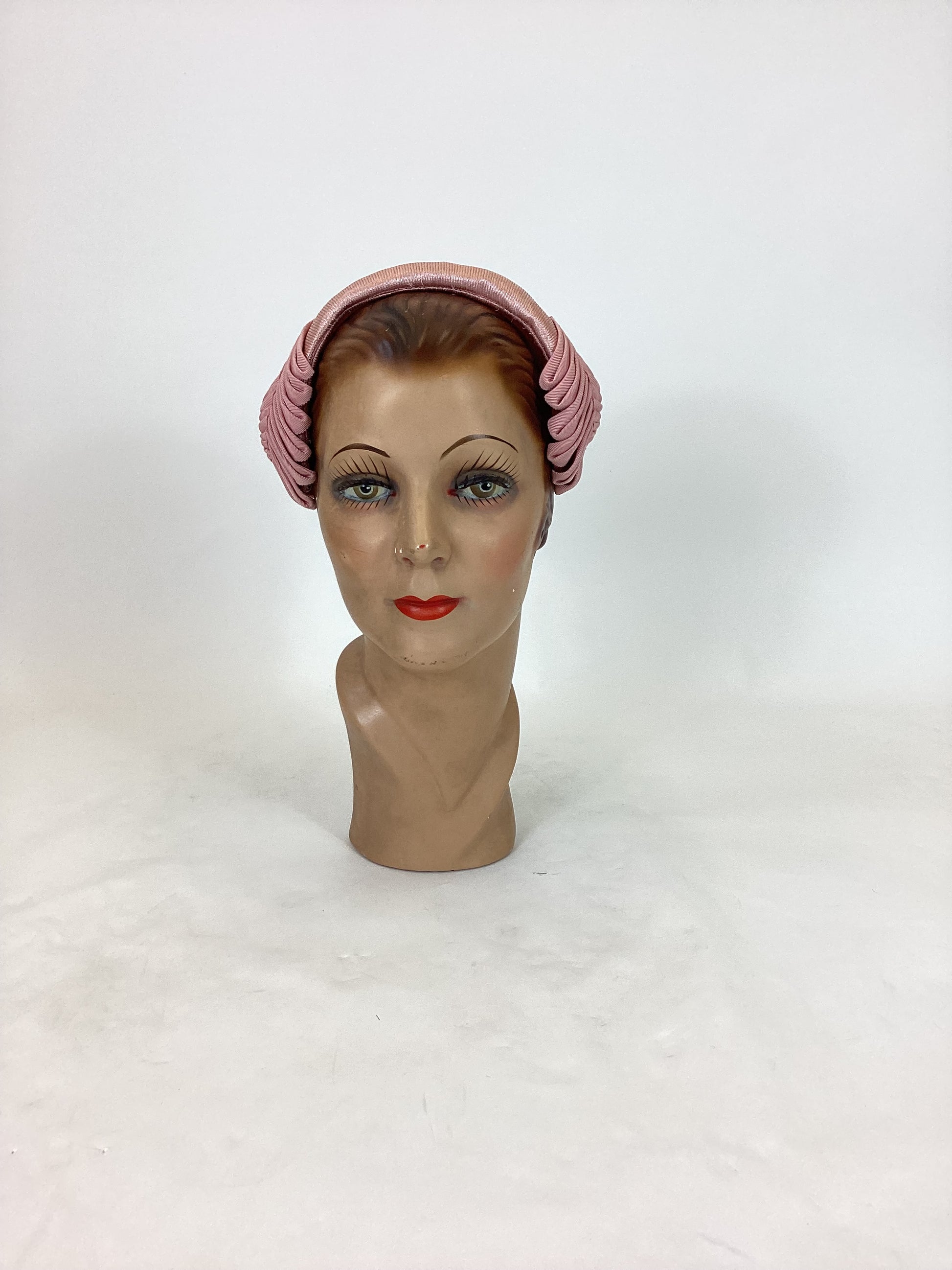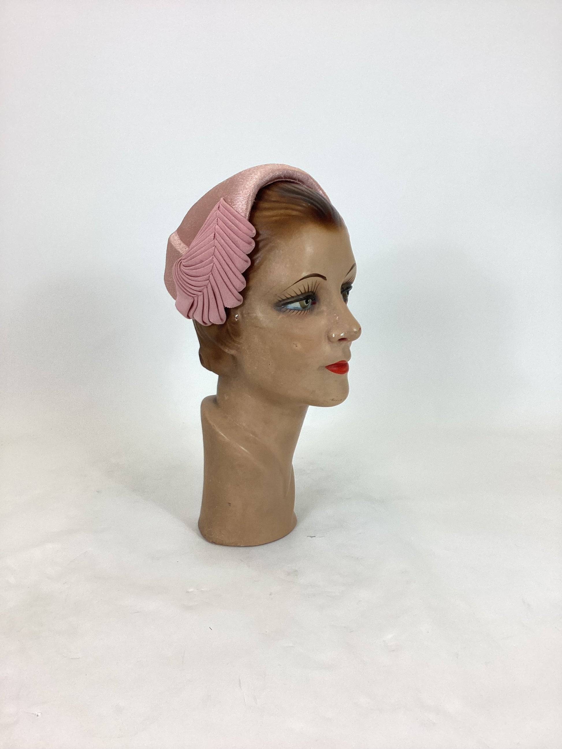 Vintage beautiful 1950's headpiece in the palest of pink. Toughened and structured headpiece with some fabulous gross grain ribbon work to each side, almost depicting chevrons on a leaf. A simple band but very effective and a timeless look. Good quality.