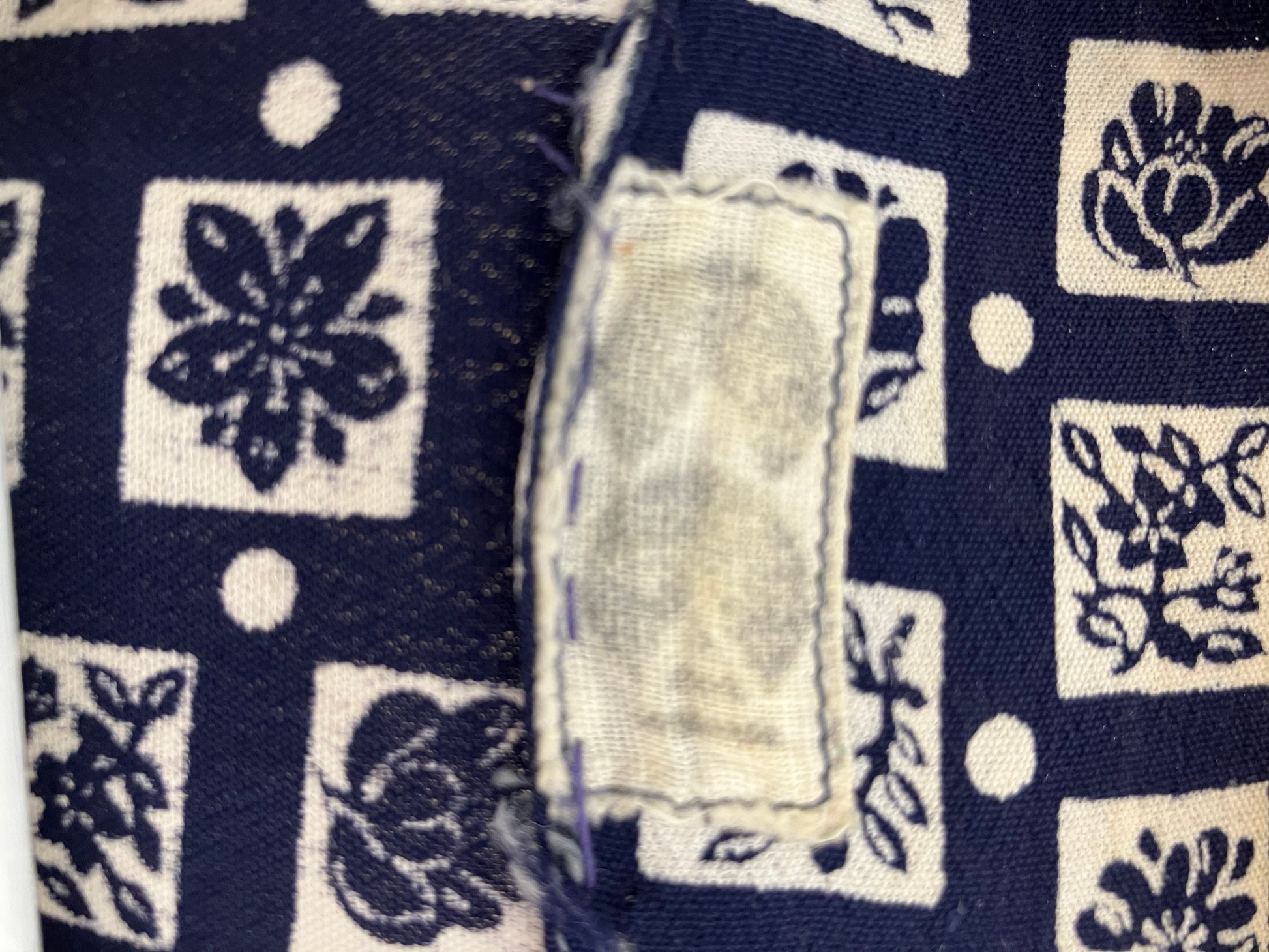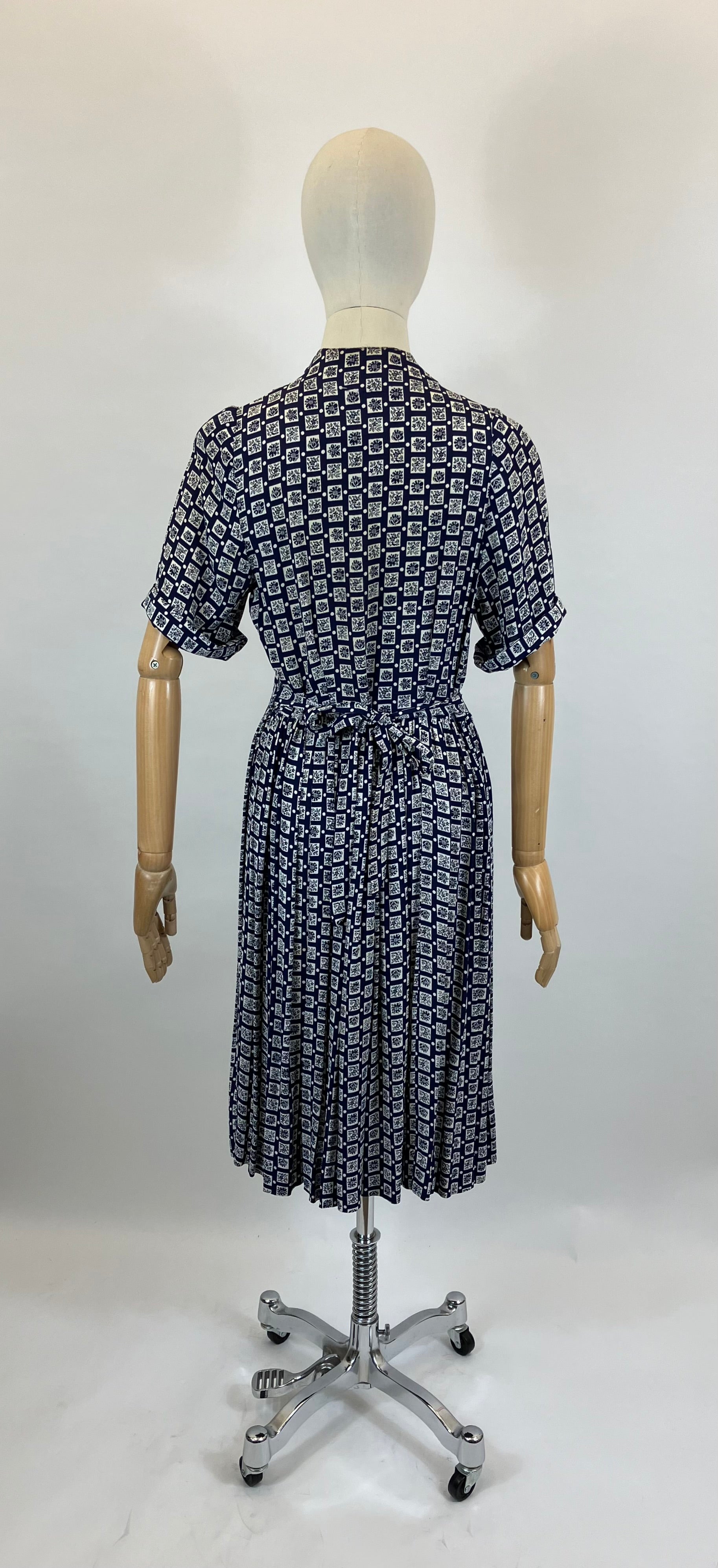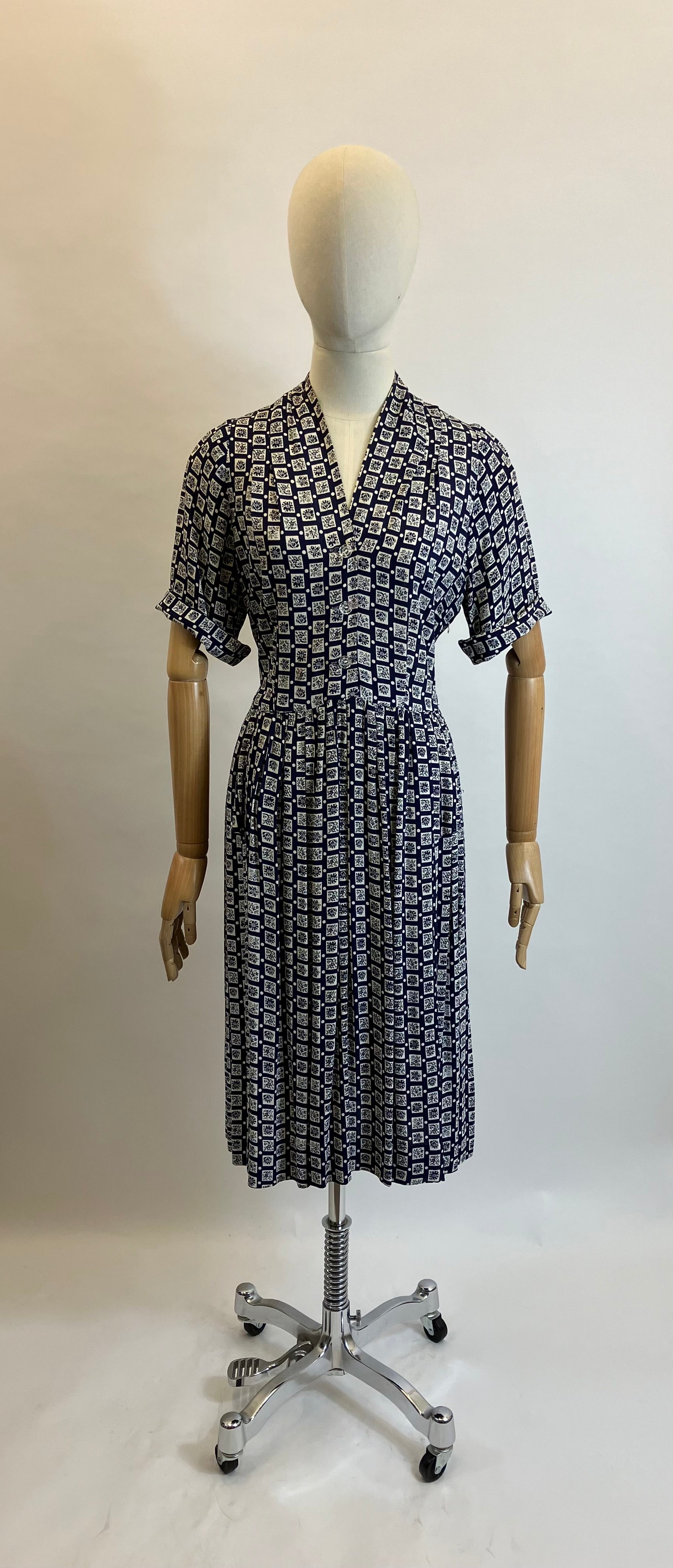 Vintage CC41 1940's Crepe Dress in Navy and White. Such a beautiful classic colour combination on this dress. With its iconic CC41 label. No makers label. A beautiful piece of history. Collarless, with 3 x button opening with a side metal zip and self tie half belt to the back. The skirt is gathered from the waist, has good pockets with external cover placket for detailing. The short sleeves have a lovely cuff. The pattern depicts a simple flower on each square throughout. Made from a beautiful crepe, which drapes just perfectly.