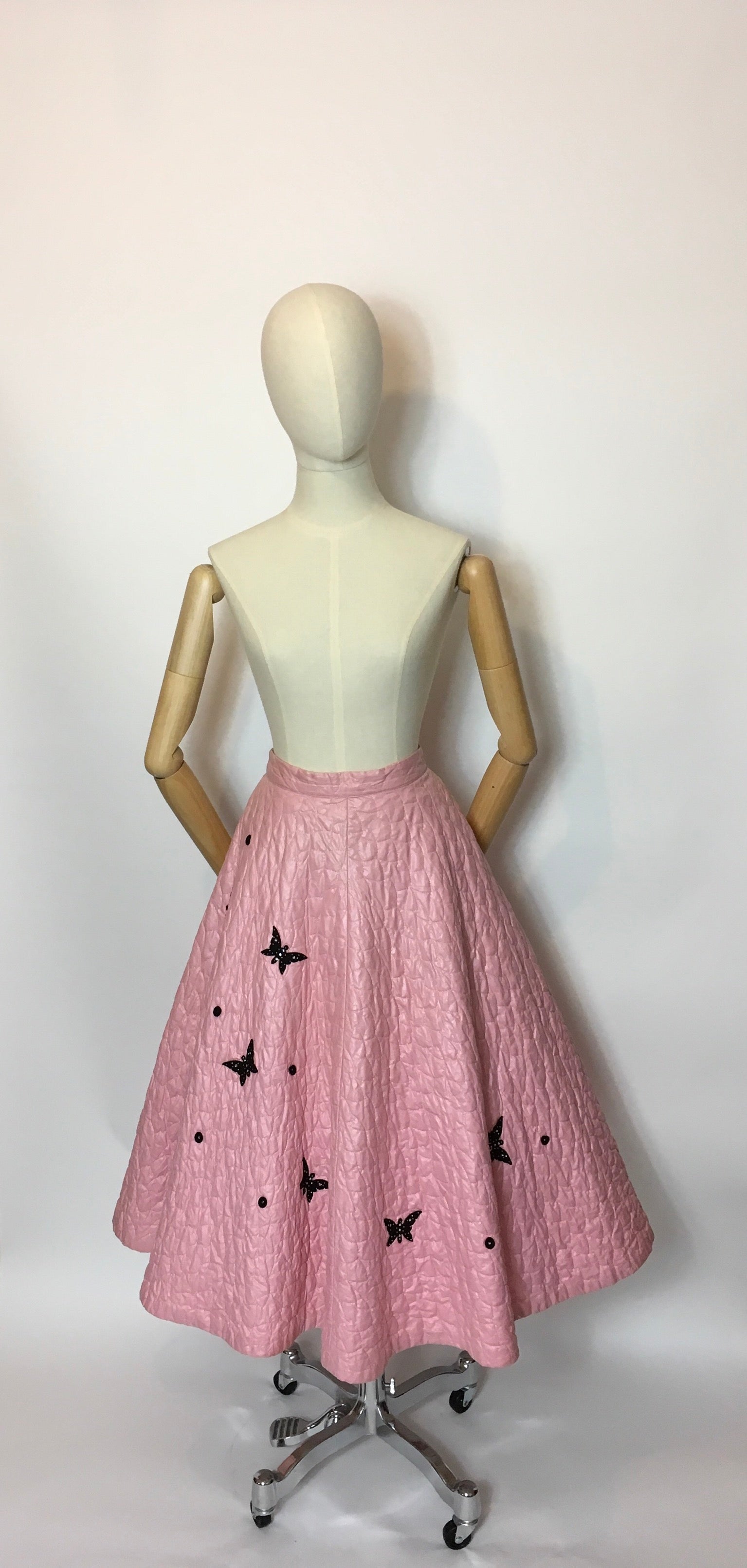 Original Darling 1950's quilted full circle skirt - In a Cute pink featuring black embelished Butterflies