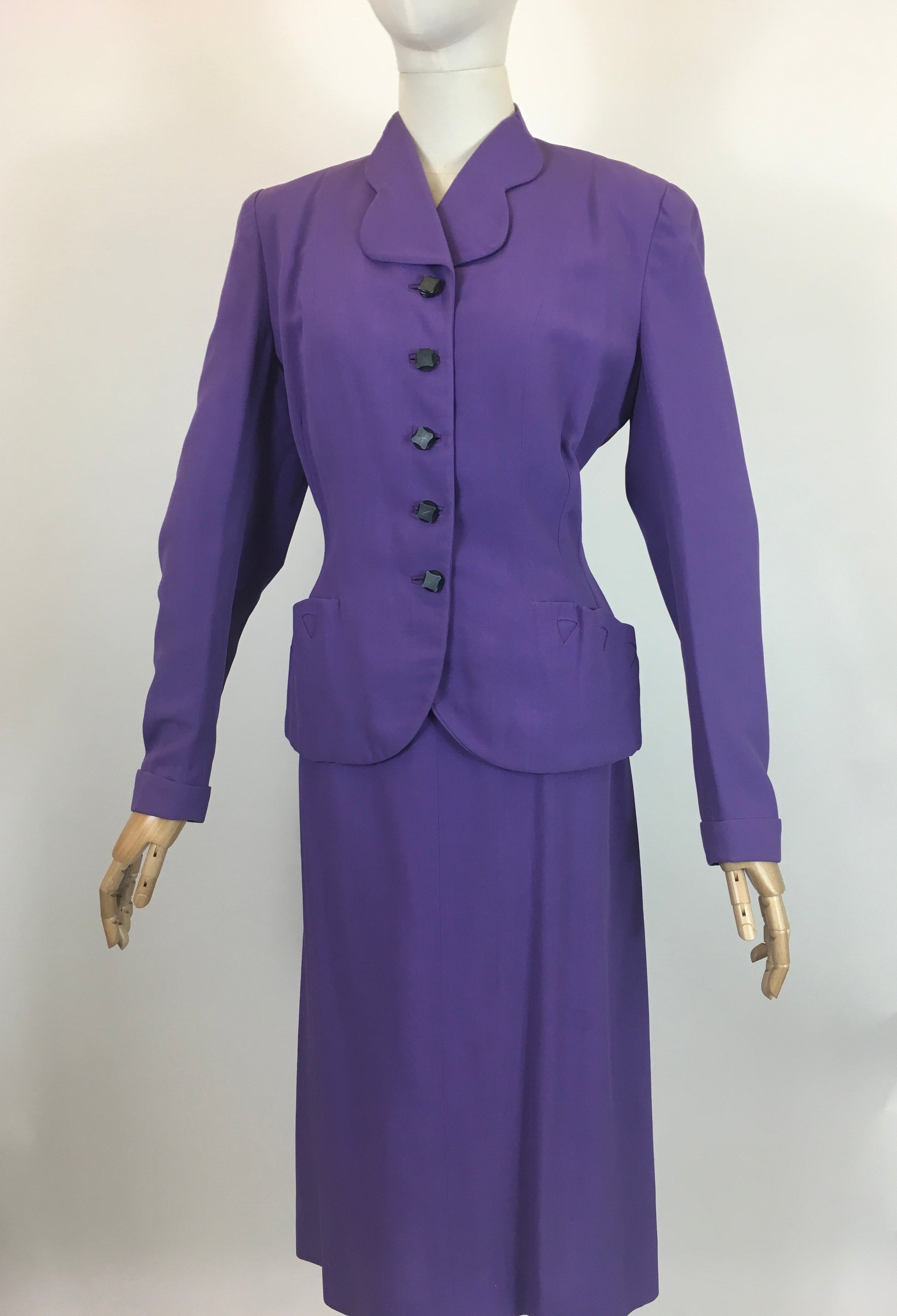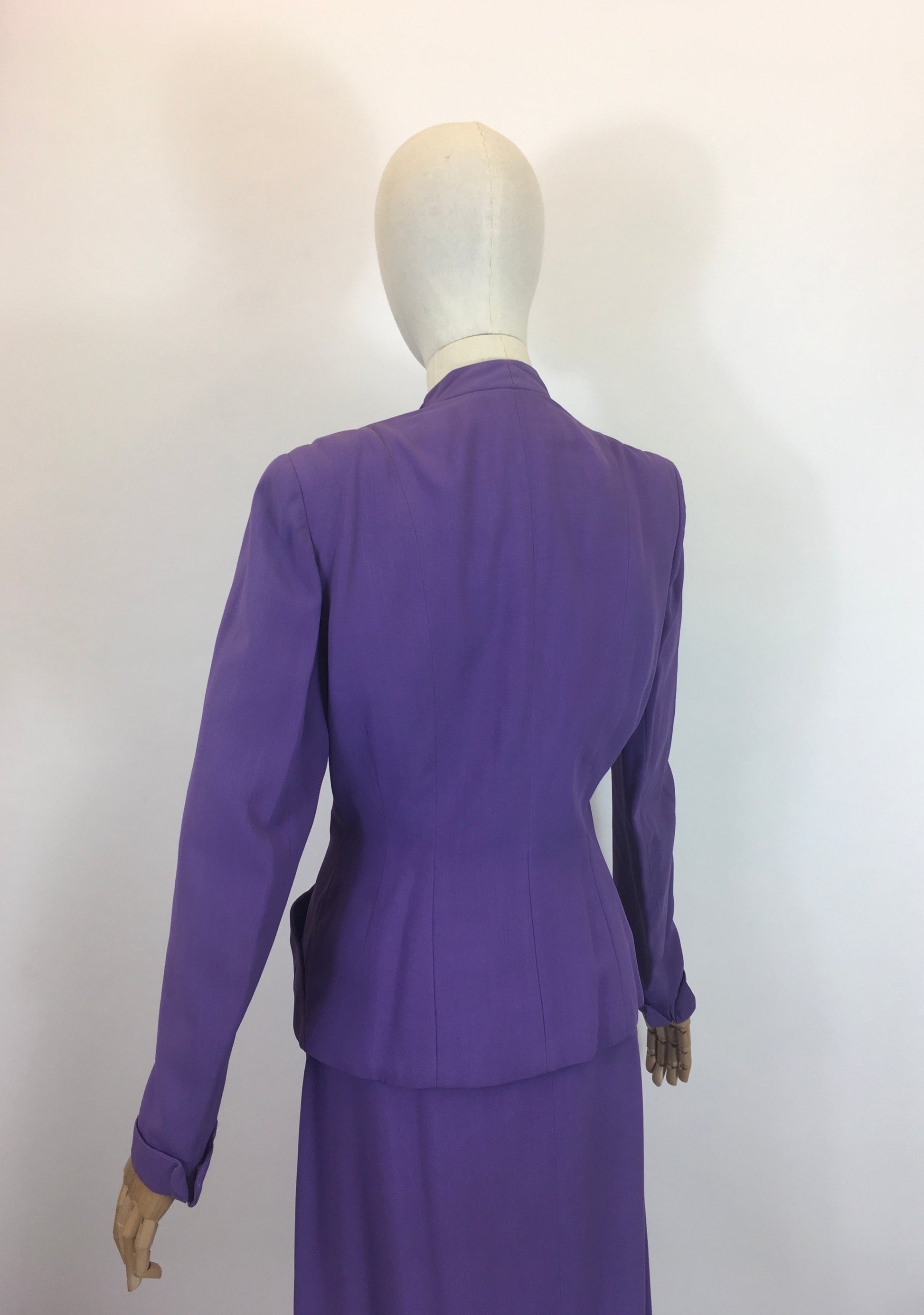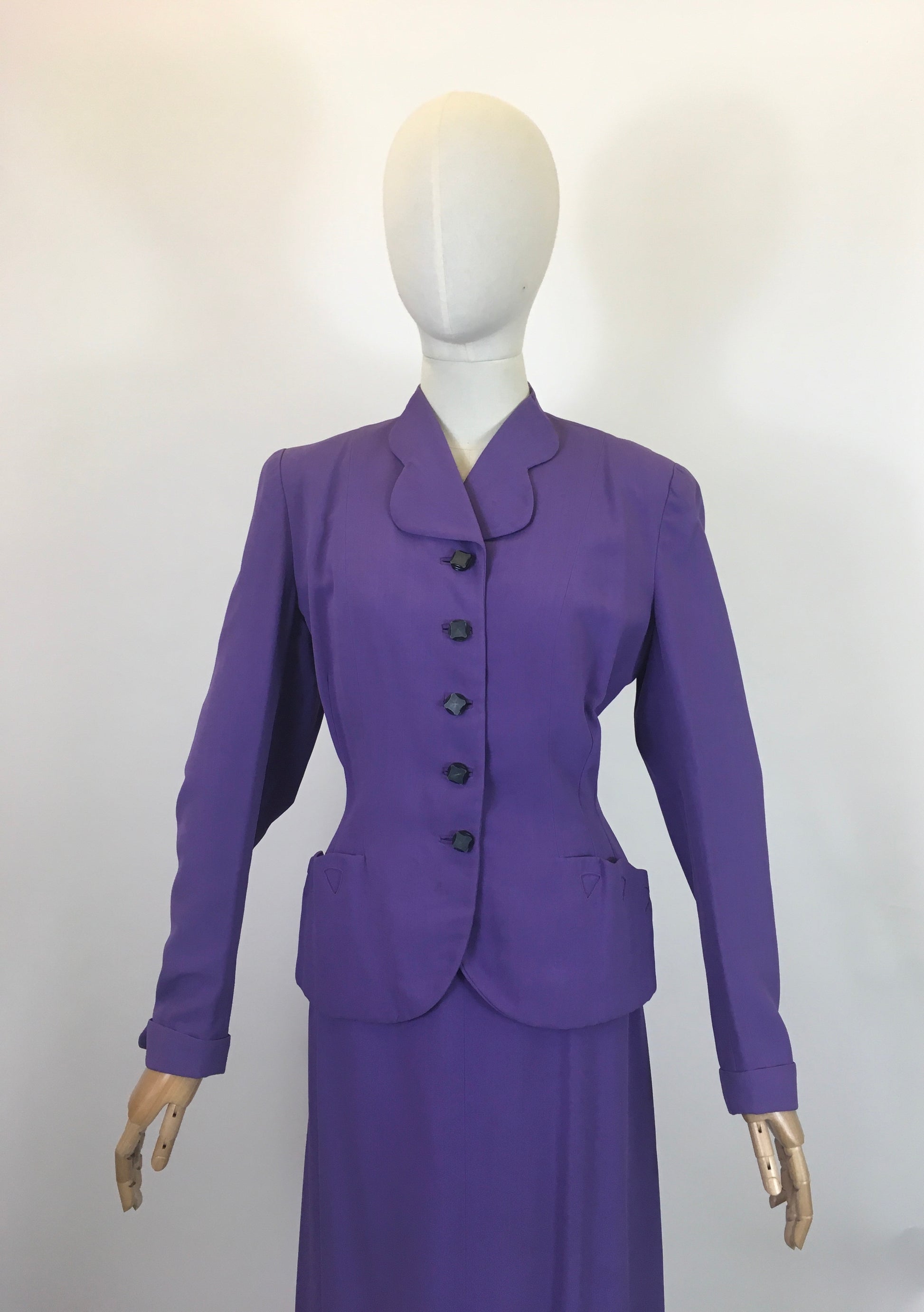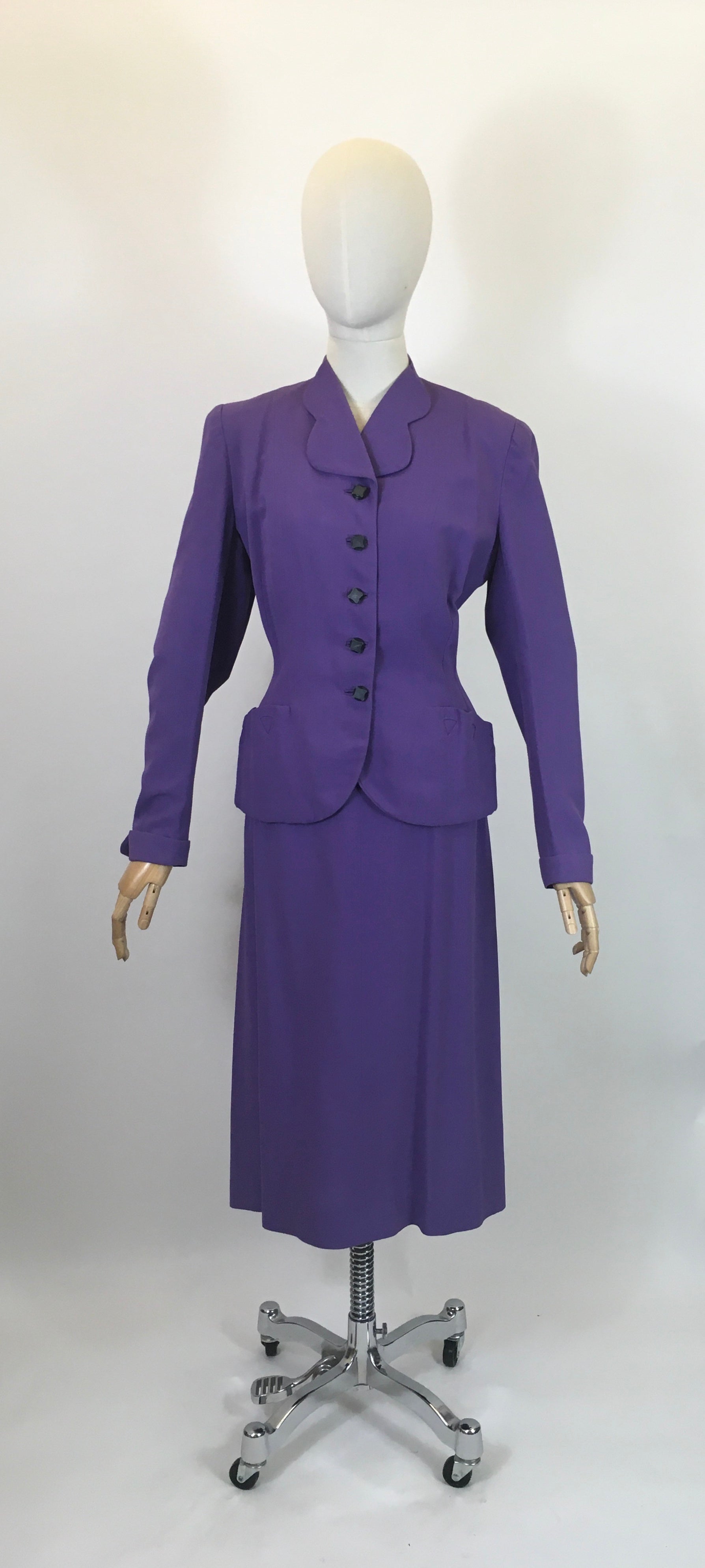 Vintage divine 1940's 2pc suit in Cadbury Purple. Classic, quality and amazing describe this suit in 3 little words. Breath-taking colour. The jacket with its classic detailing in the double scalloped collar, striking contrast original layered button front down to the scalloped edging on the pockets to match and with some delicate cut out details to these pockets. Subtle turn up cuffs, Fabulous shoulder pads and all fully lined. The skirt being a pencil skirt shape with a double kick pleat to the back with side metal zip and button fastening, unlined.