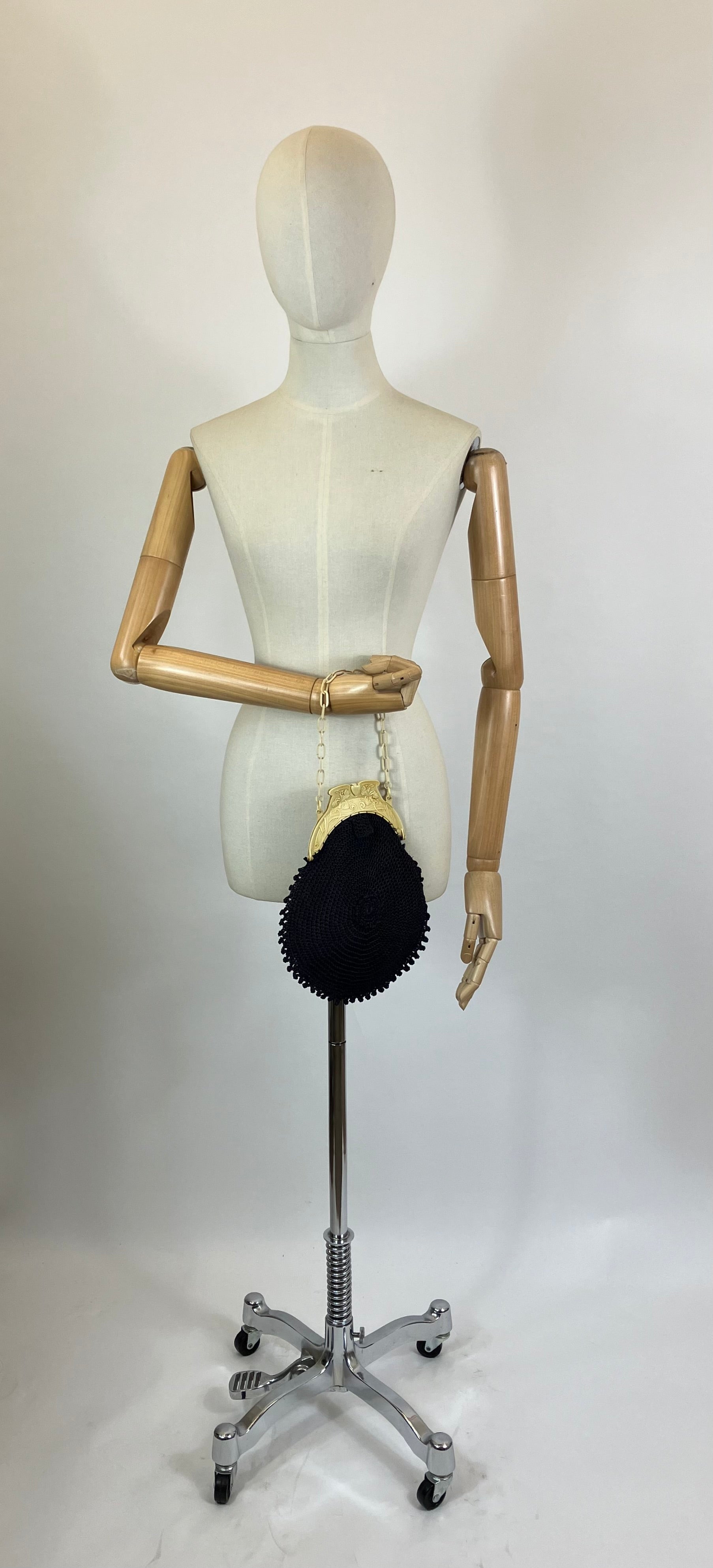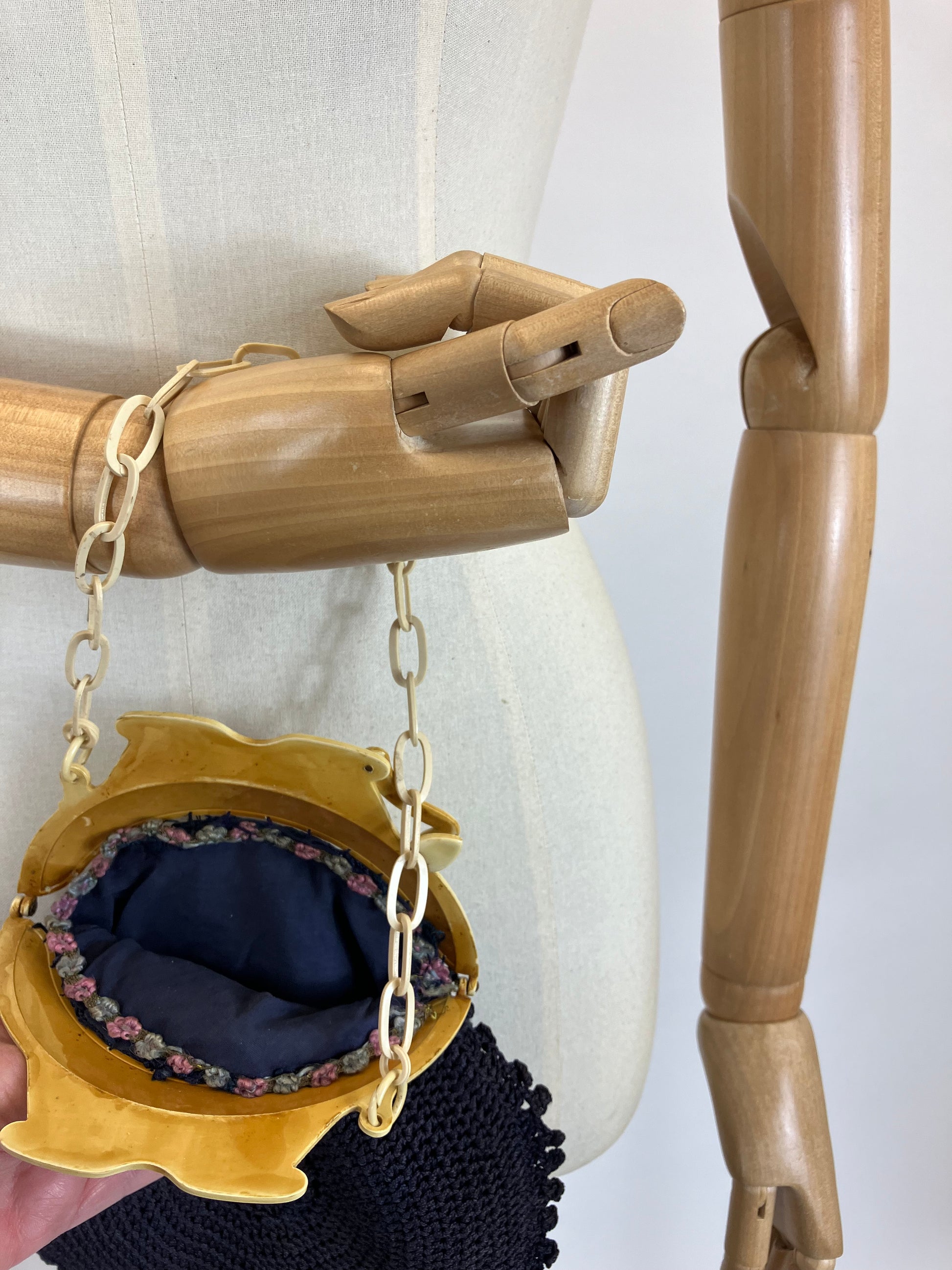 Vintage early 1920’s Crochet handbag in Navy. A lovely shape to this bag. Intricate crochet work, all on a beautiful celluloid handle with engraved flowering, sweet lever clasp and celluloid chain handle. Fully lined.