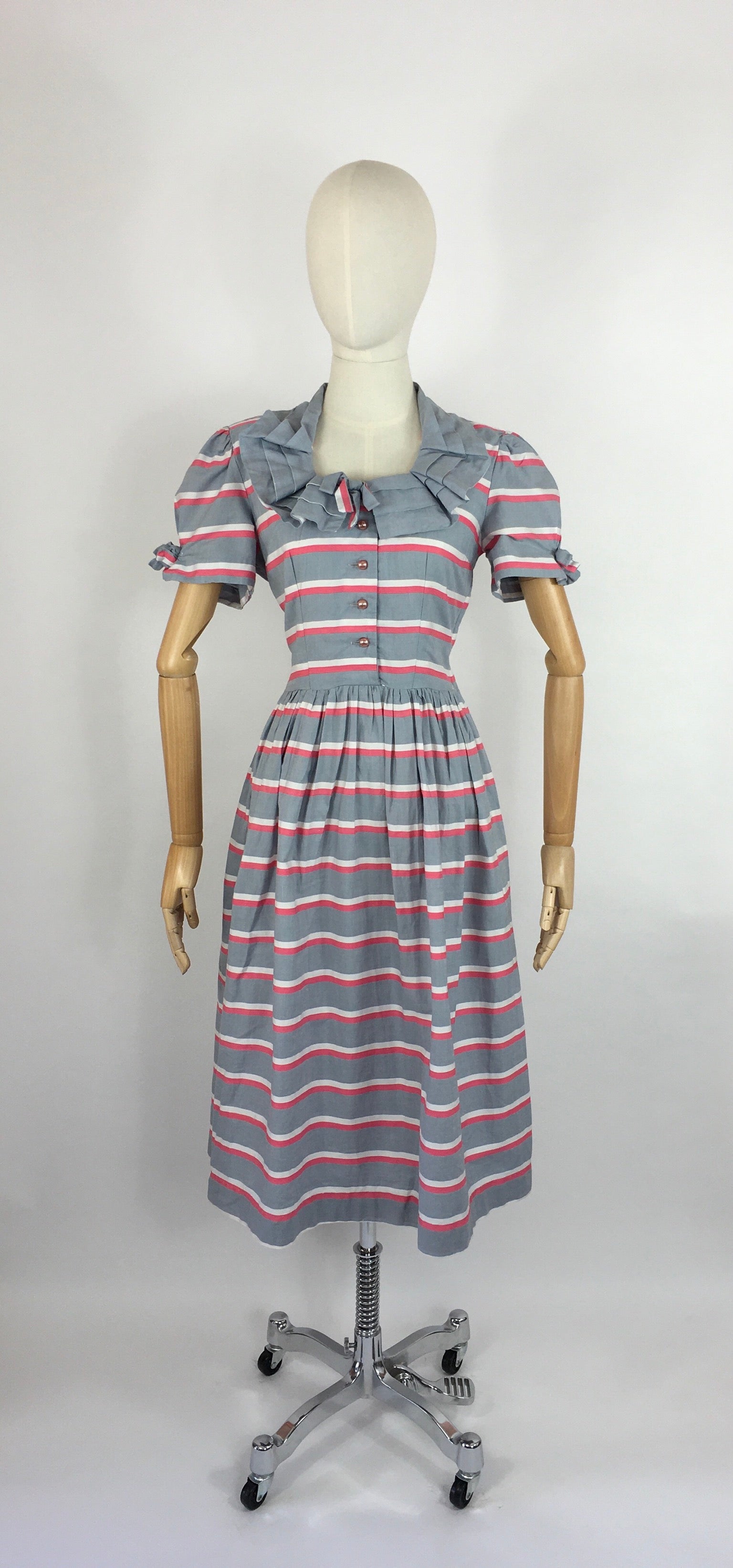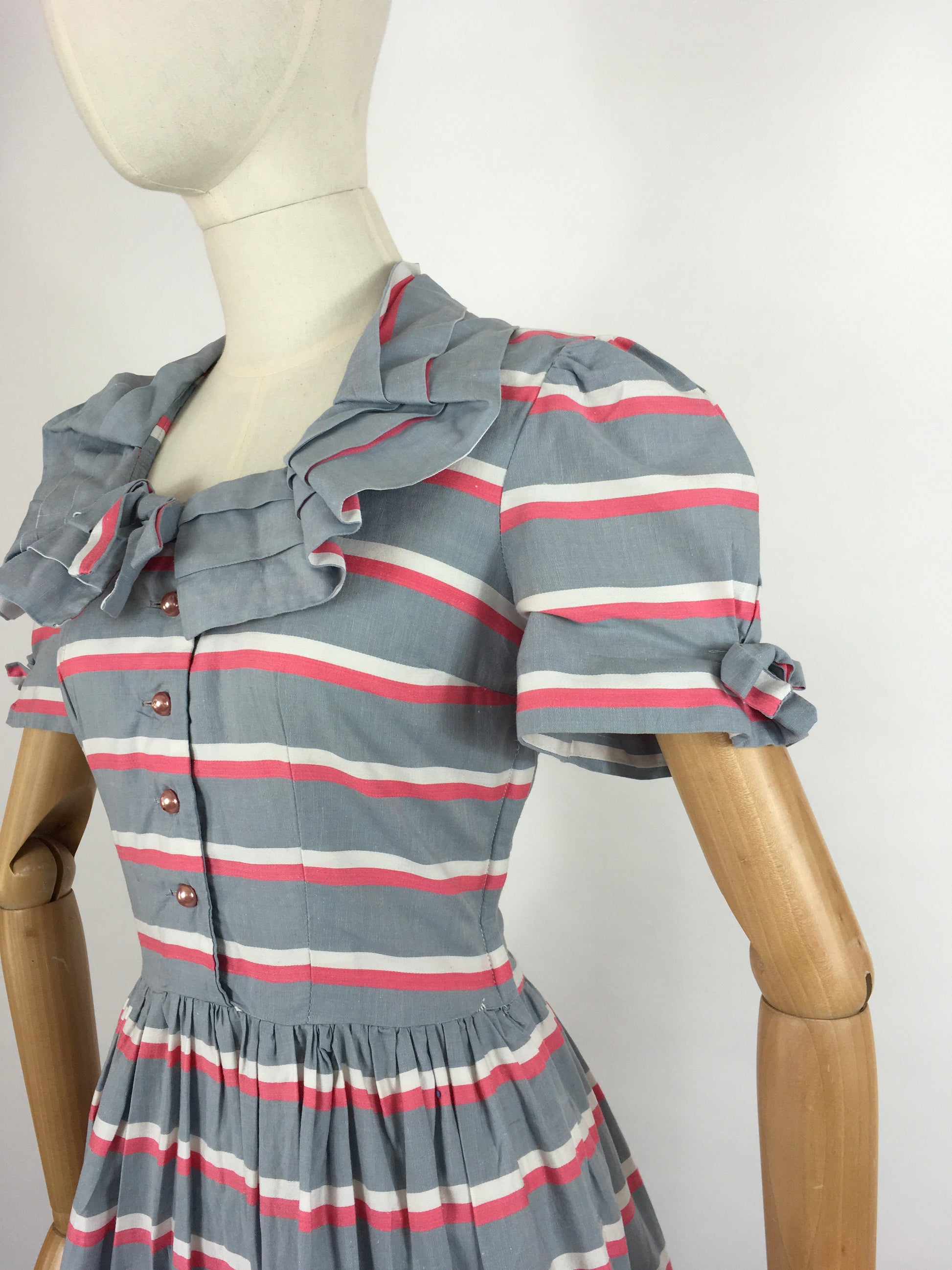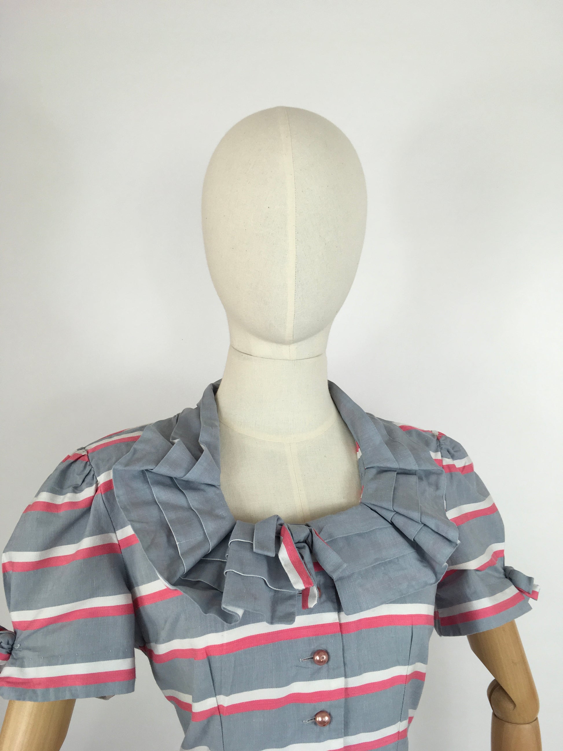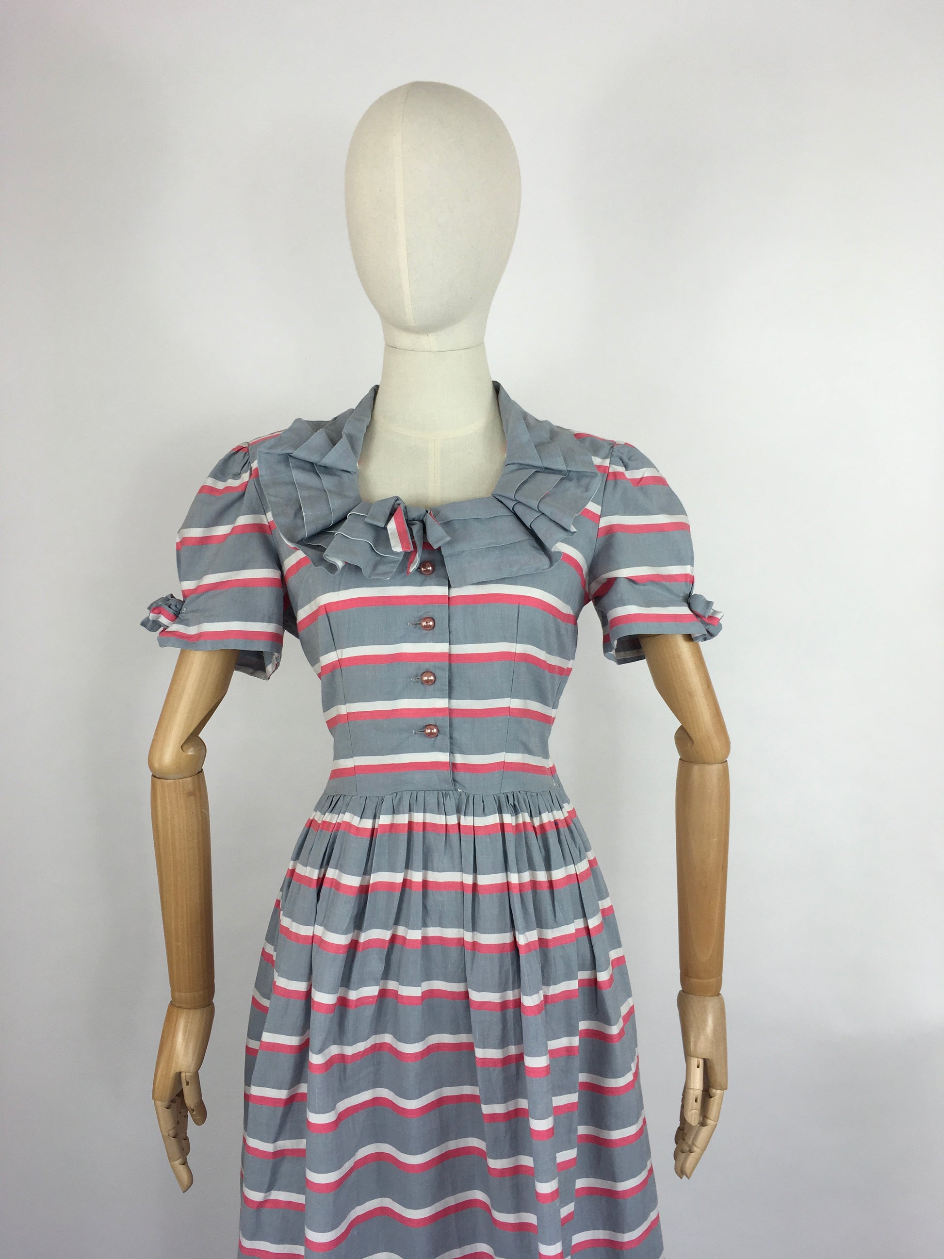 Vintage early 1940s cotton day dress in a lovely stripe with greys, pinks and whites. Featuring a fabulous ruched collar detailing, button front and pleated skirt. Fastens with buttons to the bodice and a side zip.