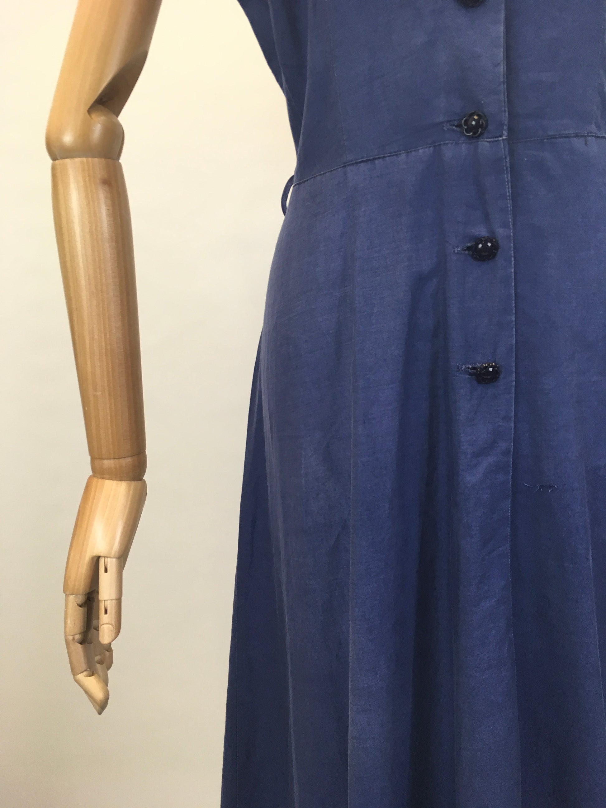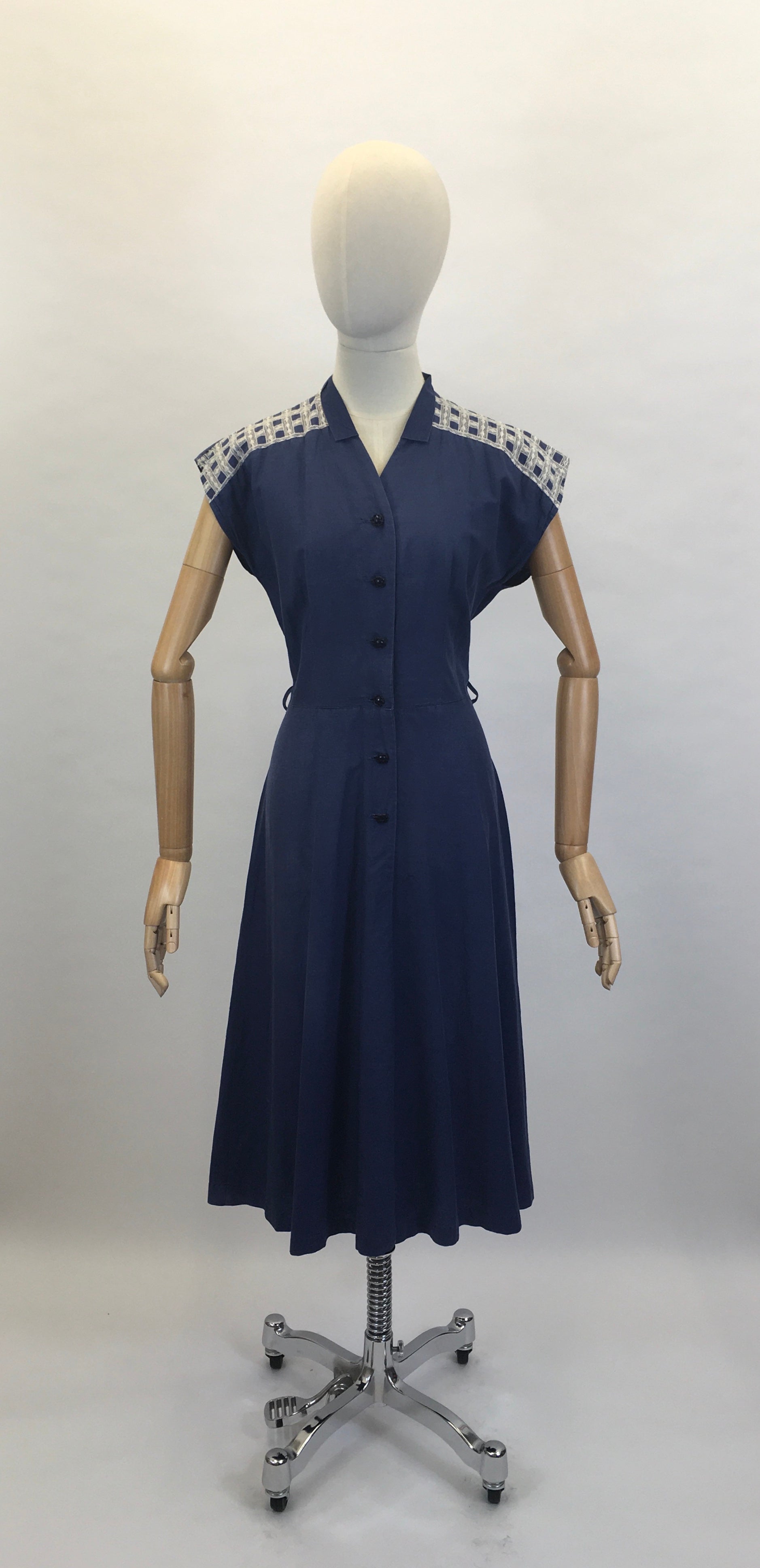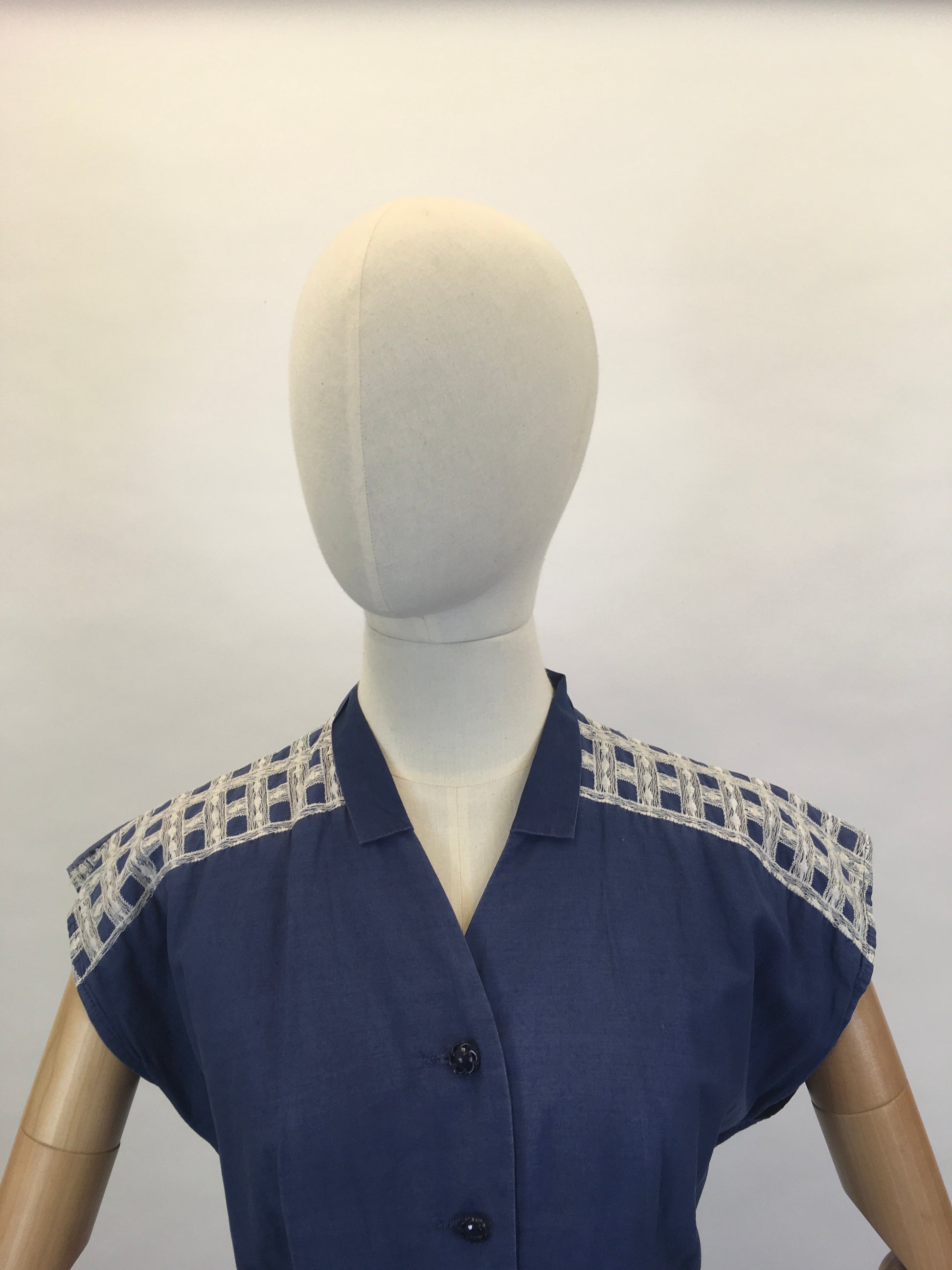 Vintage early 1950’s navy cotton day dress with button front and lovely white embroidered detailing to the shoulders. Features a short sleeve and button front fastening. A great staple piece for everyday wear. Lovely in spring and summer months as is or layered in the cooler weather with cardigans and tights. Please see condition report below for flaws.