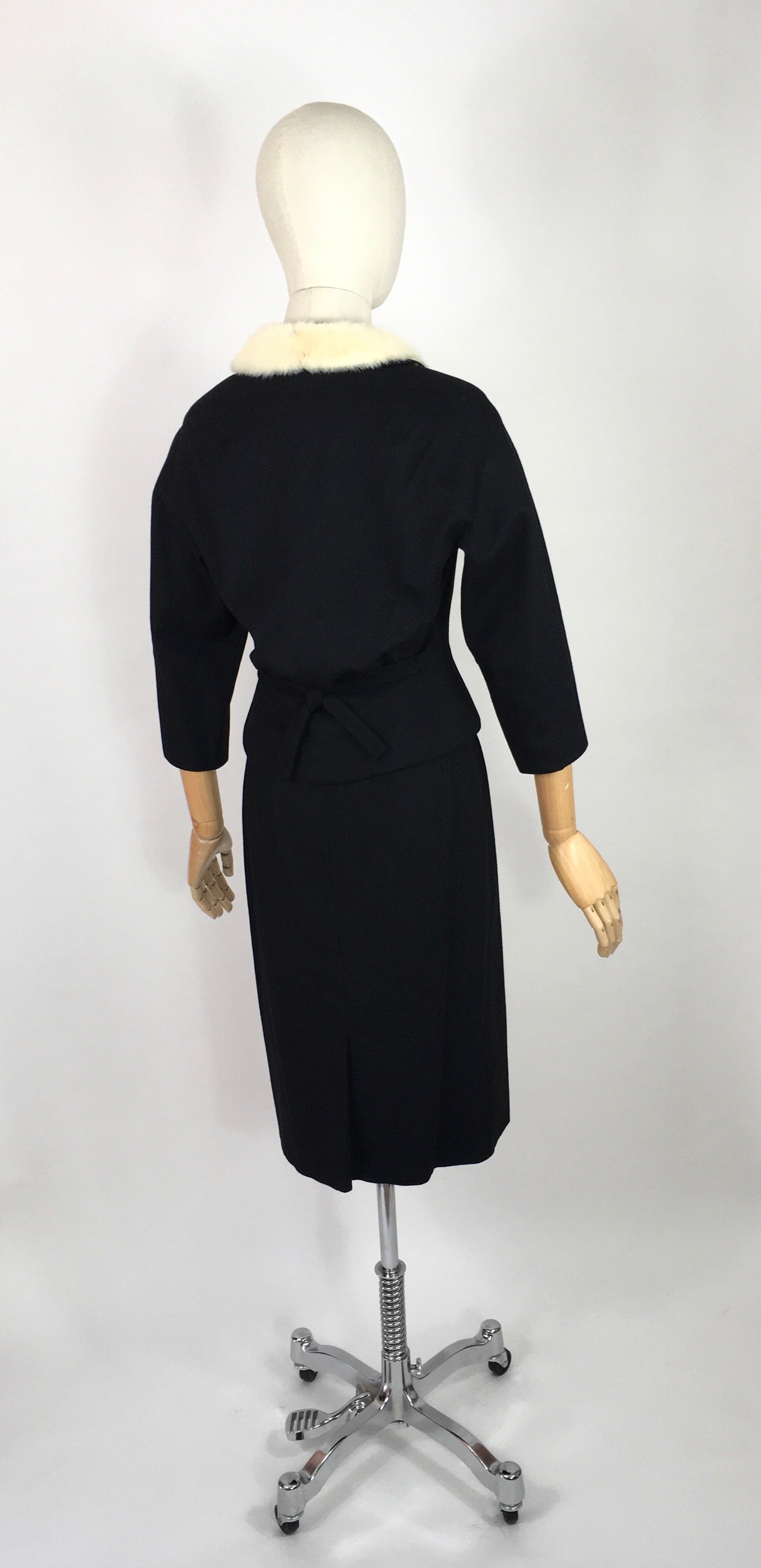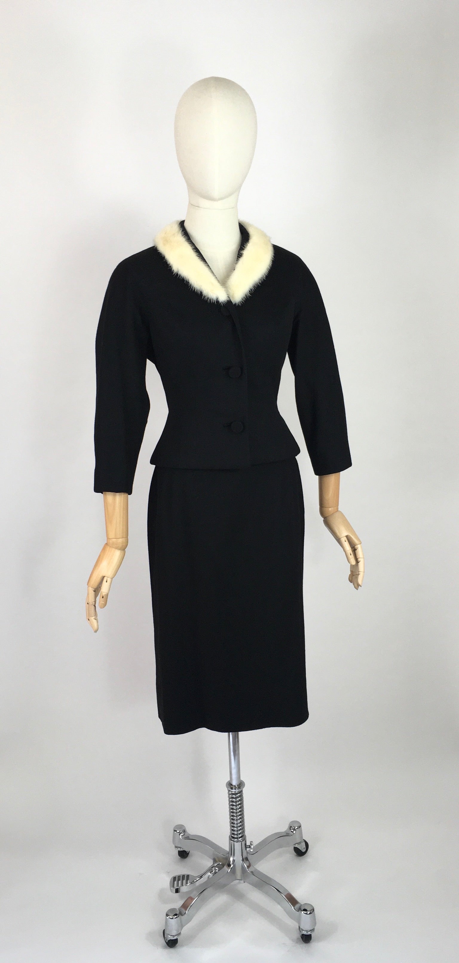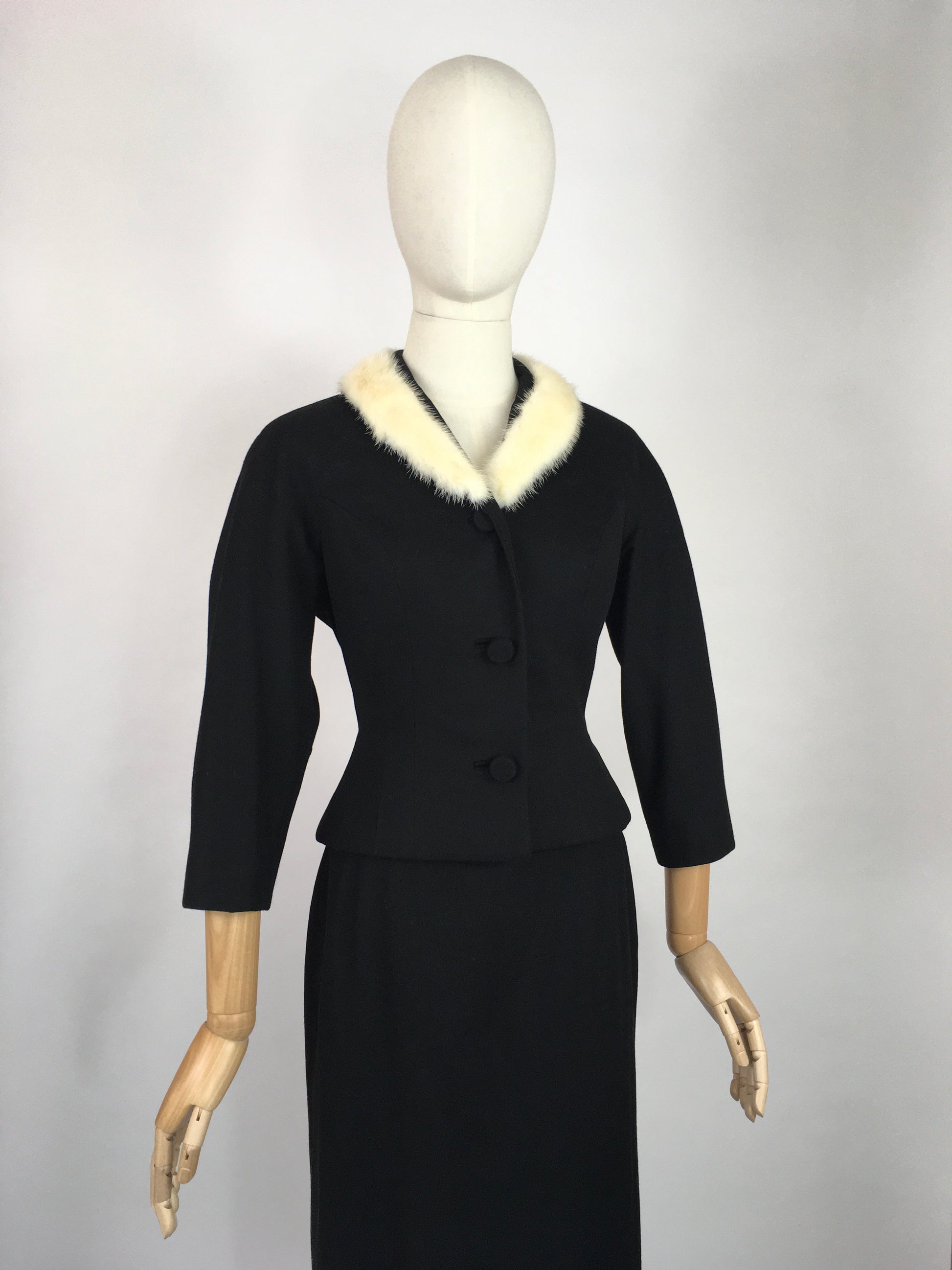 Vintage early 1950s 2pc suit in a fabulous black wool with contrast white mink fur trim. Classically cut in a beautiful silhouette the Jacket features a shaped collar, nipped In waist, dolman sleeve and a fabulous shaped back with matching bow detailing. The skirt is a very simple pencil shape with a metal side zip and button fastening.