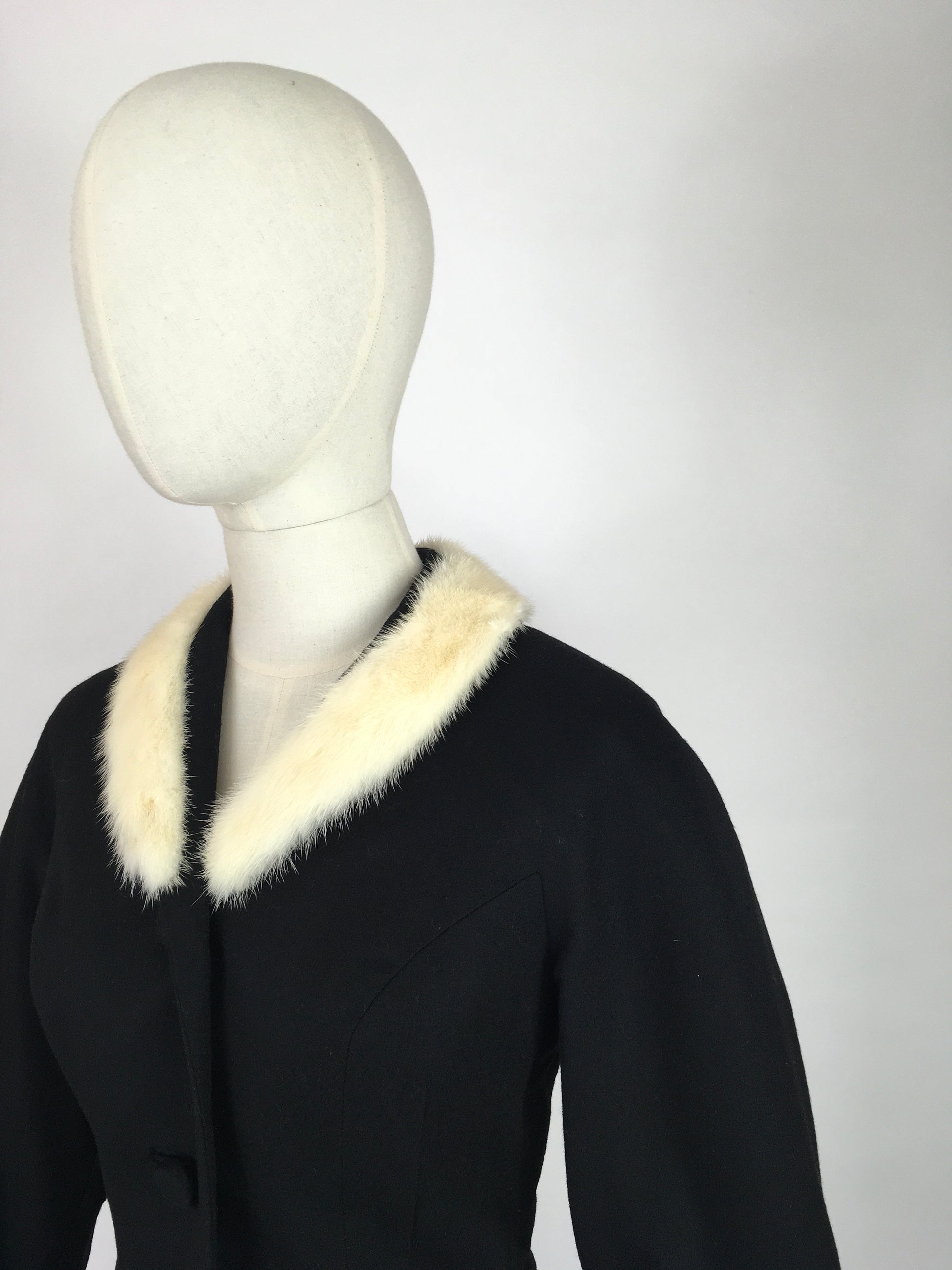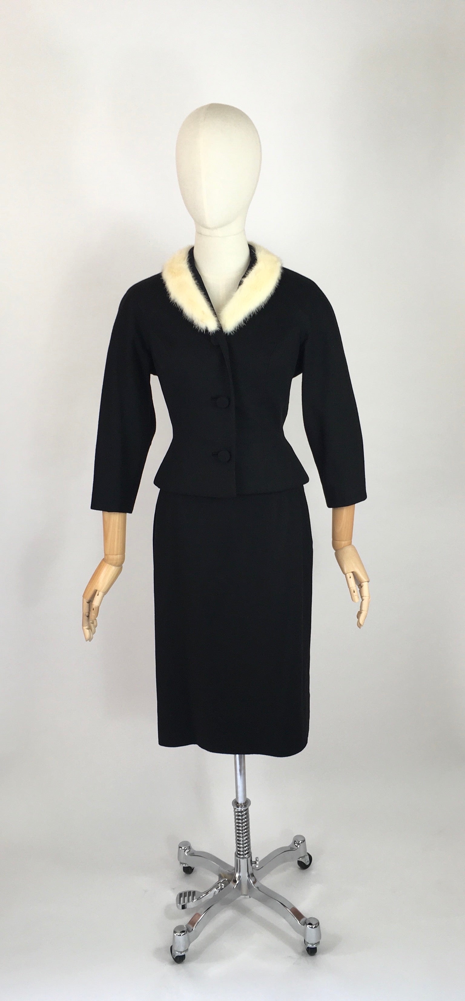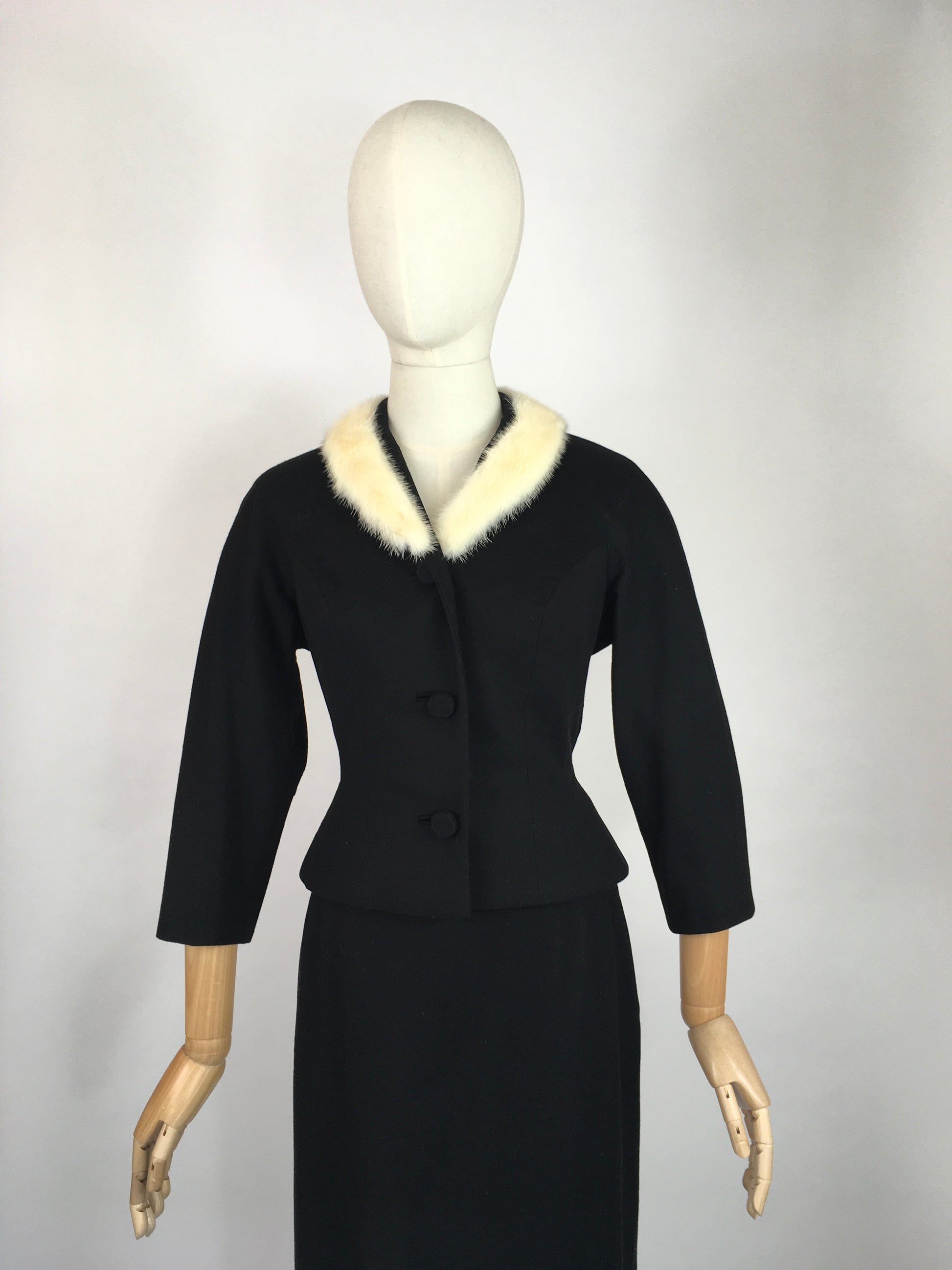 Vintage early 1950s 2pc suit in a fabulous black wool with contrast white mink fur trim. Classically cut in a beautiful silhouette the Jacket features a shaped collar, nipped In waist, dolman sleeve and a fabulous shaped back with matching bow detailing. The skirt is a very simple pencil shape with a metal side zip and button fastening.