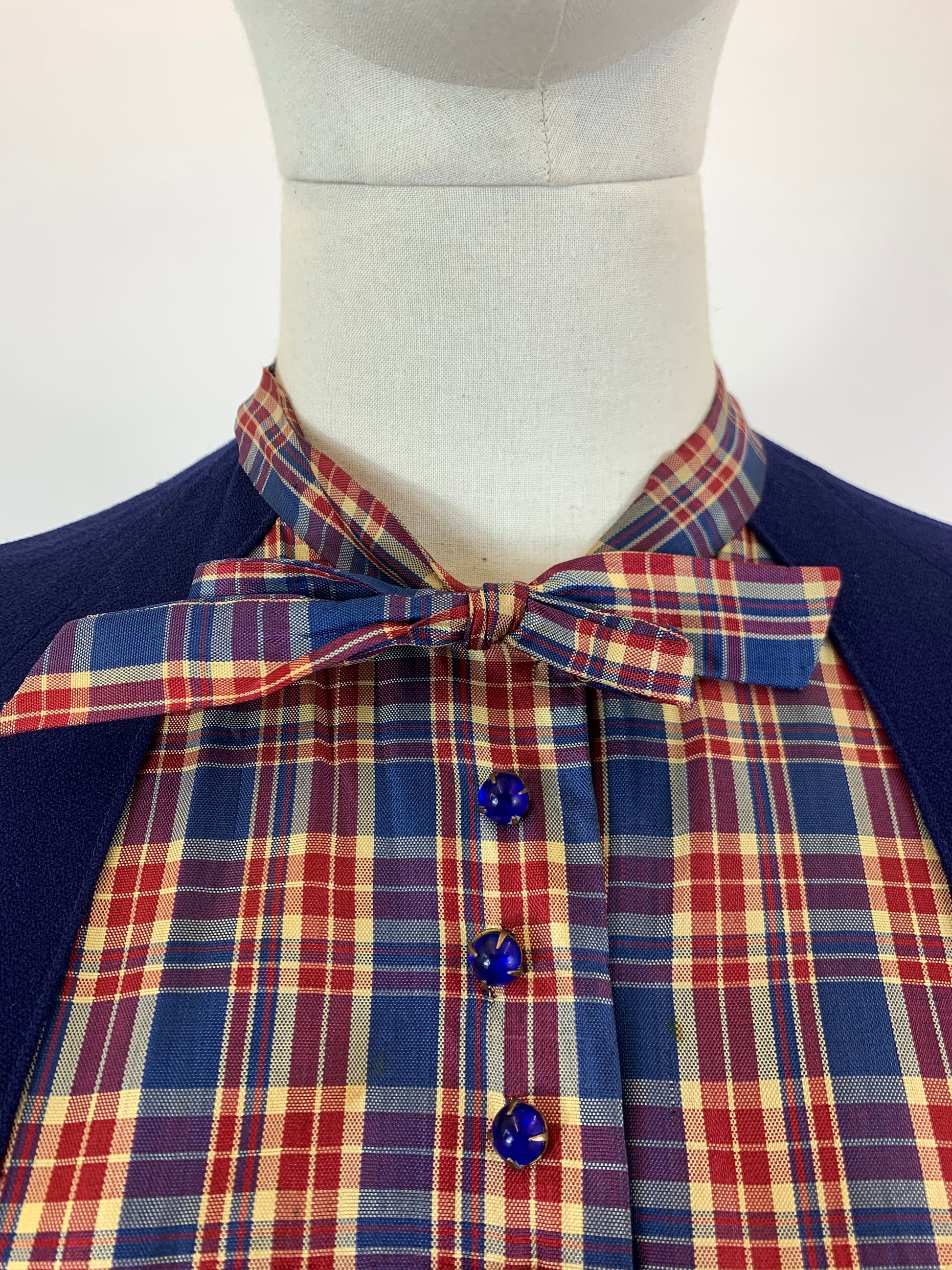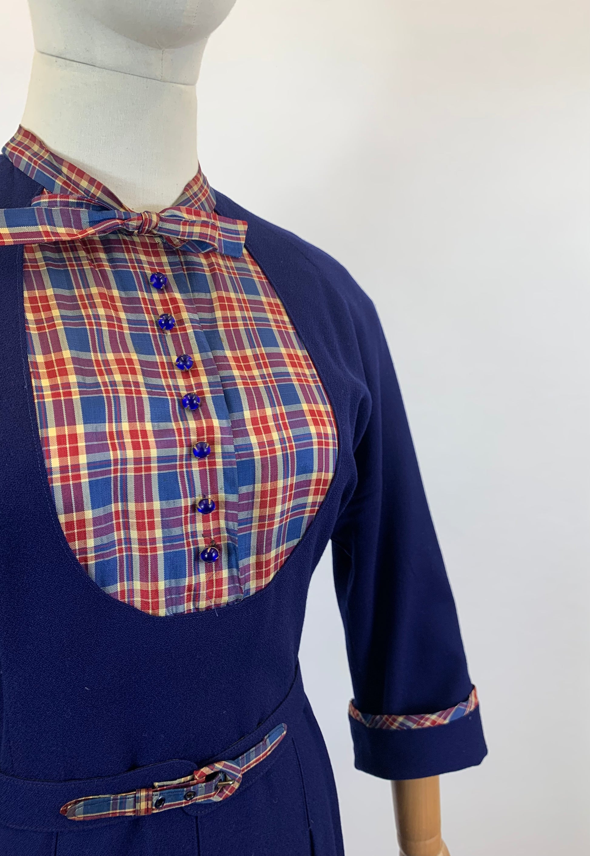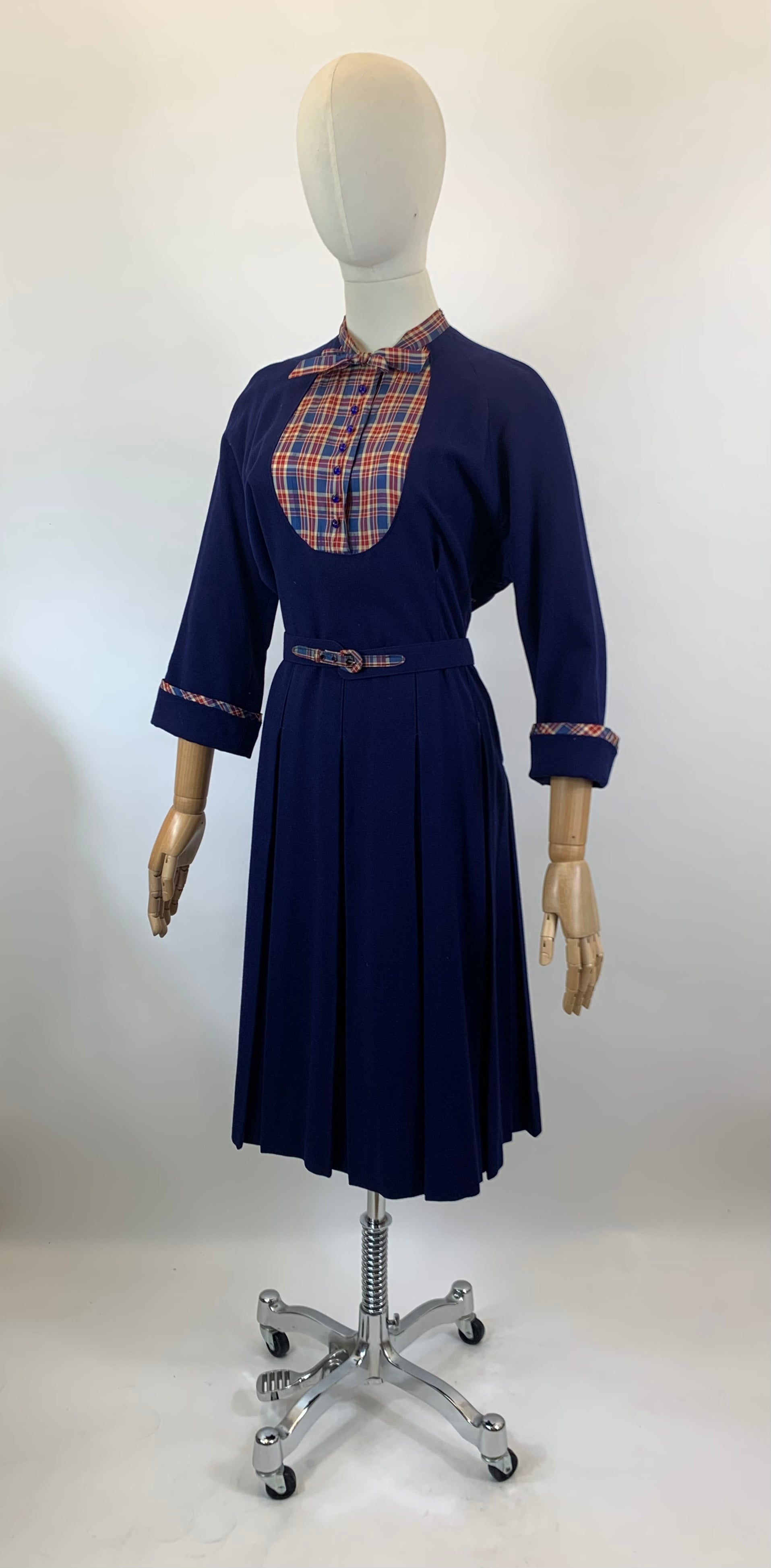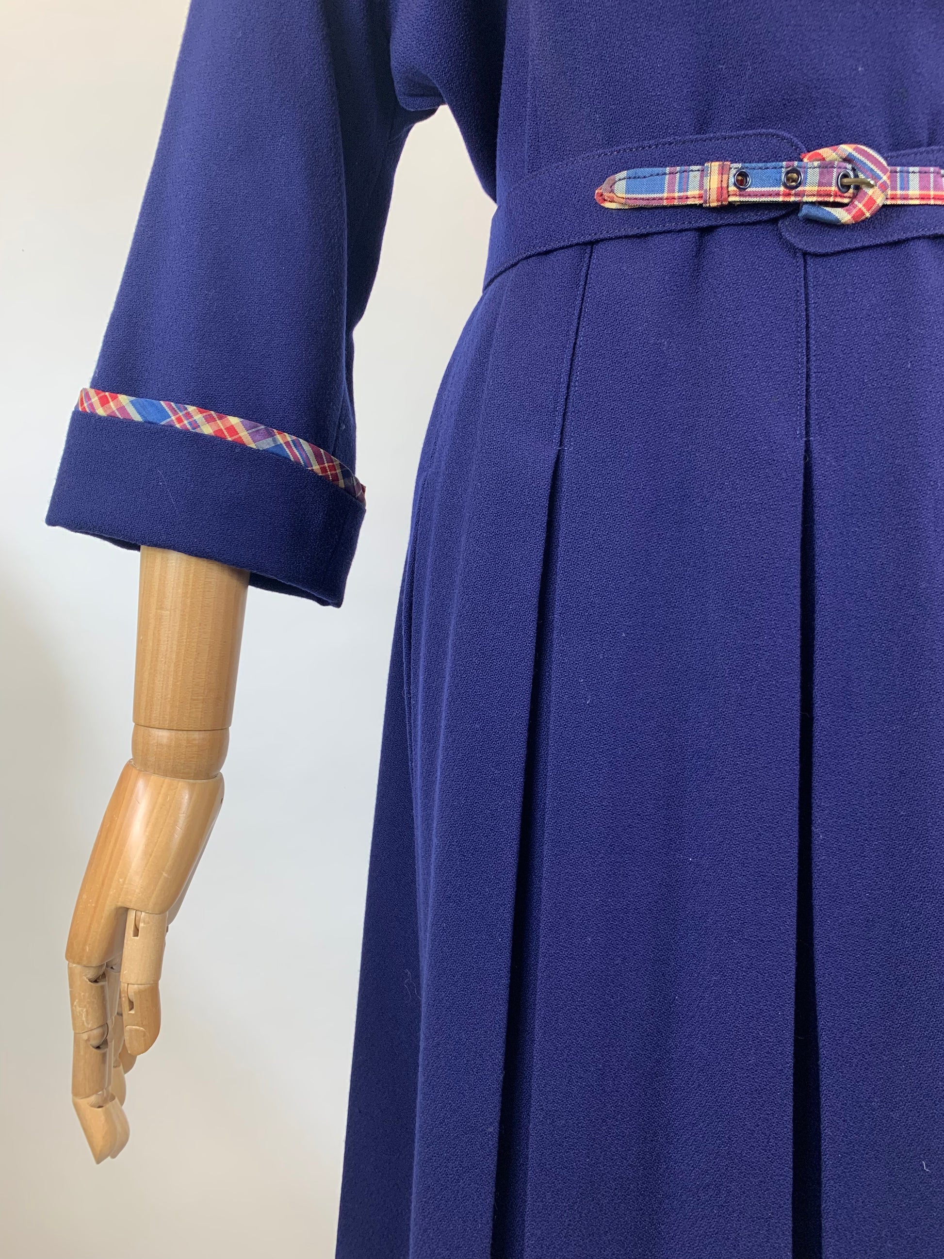 Such a beautiful dress with contrast blue and red plaid detailing. Exclusive “Damille” model label and the all important Dinner Plate Label exuding the quality. 3/4 slightly dolman sleeves, side Lightening metal zip opening. Taffeta plaid panel with pussy bow and 7 x false button front opening with attached poppers. The same taffeta plaid contrast addition to the sleeve cuffs and also added to the fabulous belt clasps. Slight darts to the bust down to waistline. The skirt has deep evenly spaced pleats. A lovely weight to the dress.