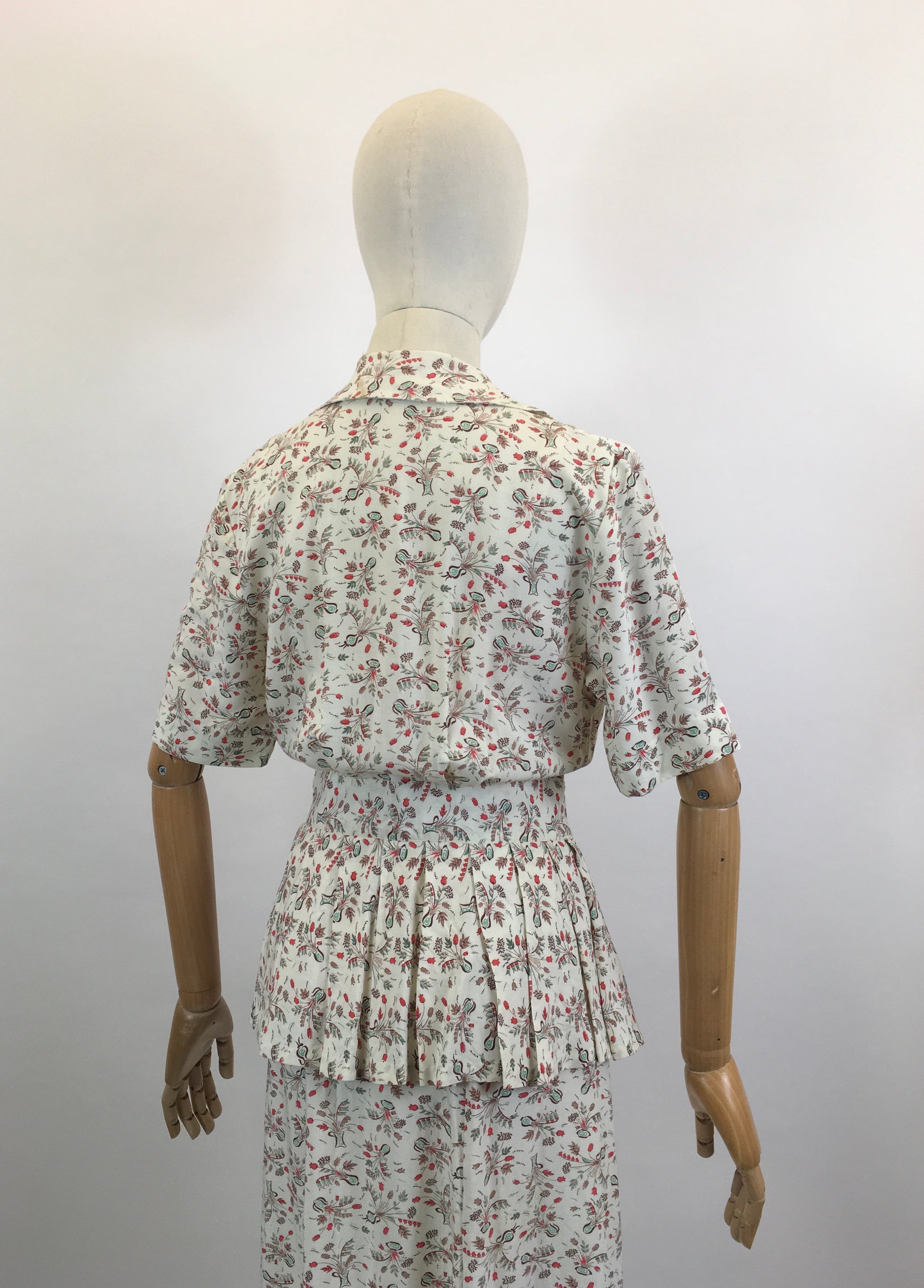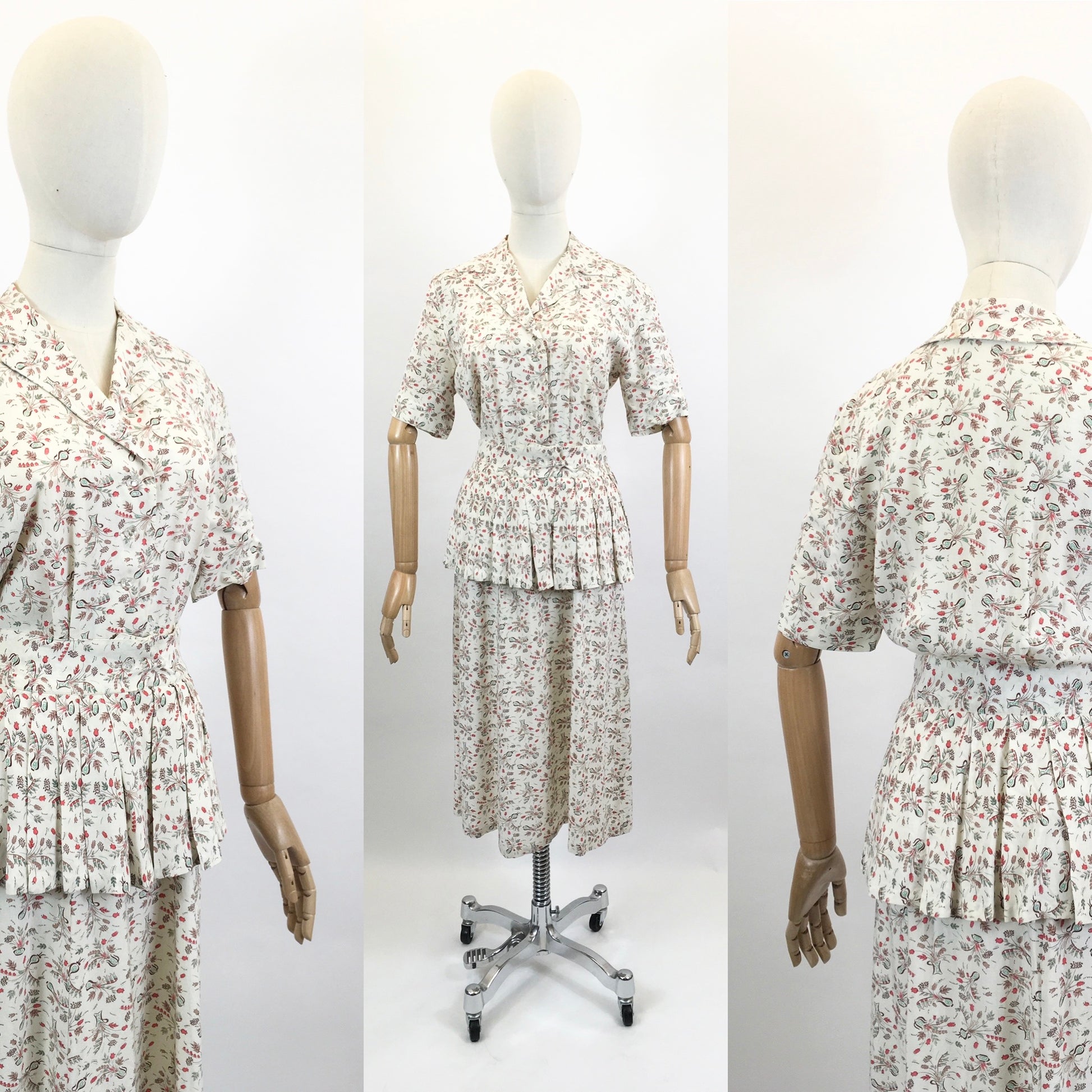 Made from cotton. Perfectly formed collar, short sleeves, glass style button front to waistband. Side poppers, gorgeous pleated peplum which is part of the waistband with a depth of 10”, around the whole front and back. 6 x panel skirt. No shoulder pads.