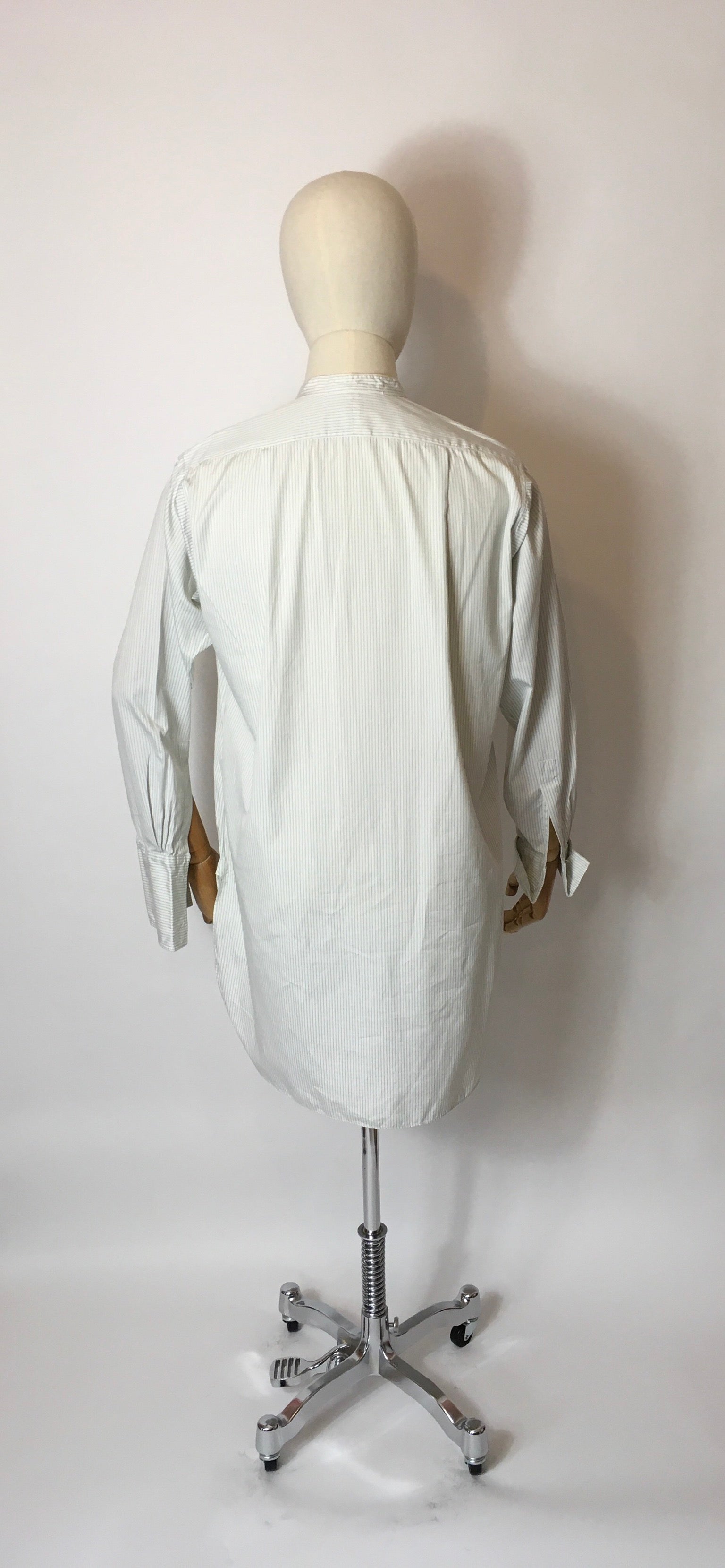 Vintage collarless shirt in a lovely duck egg blue stripe. Features a 4 button front and a double cuff. In lovely condition, a great addition to a vintage gents collection.