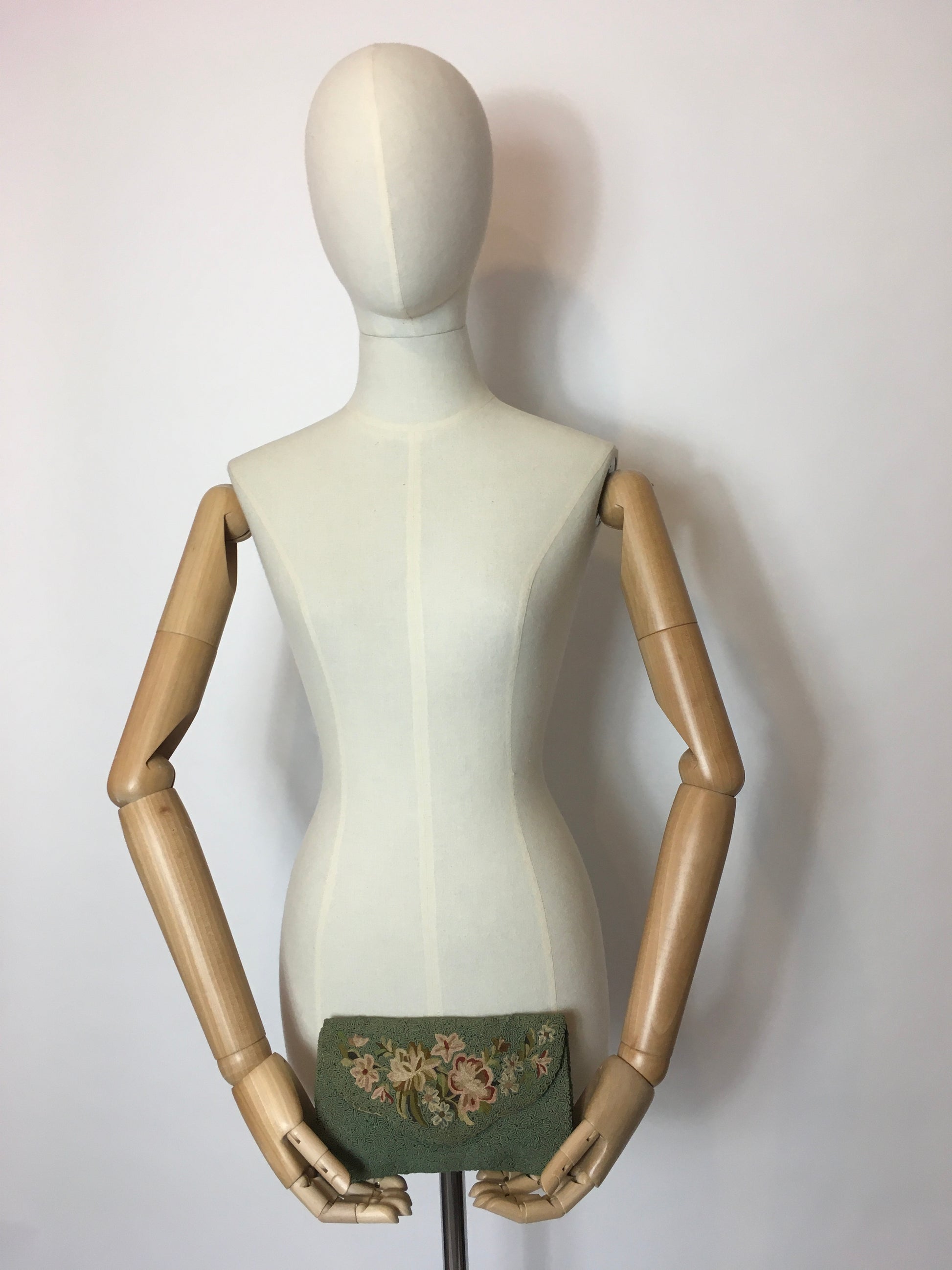 One of the pieces from our curated collection for the fashion show ‘ A look into 1930’s fashions ‘ exclusive to the festival of vintage, York is this beautiful late 1920s Clutch bag. Made from a lovely soft eau de nil soutache with embroidered floral details in an array of pastel colourings. A simple but iconic shape from the time which fastens with an easy press stud. Inside the lovely bag comes with an attached purse and mirror. Not without its flaws ( see condition report ) but still completely usable and wearable.