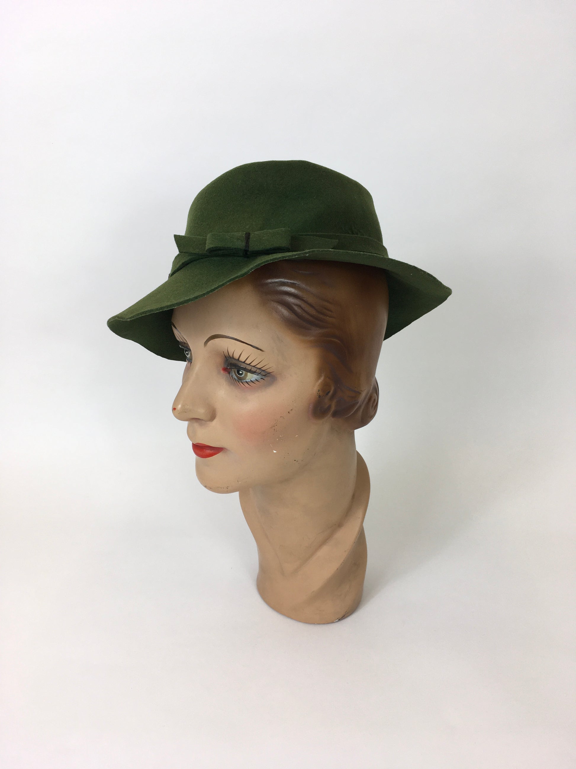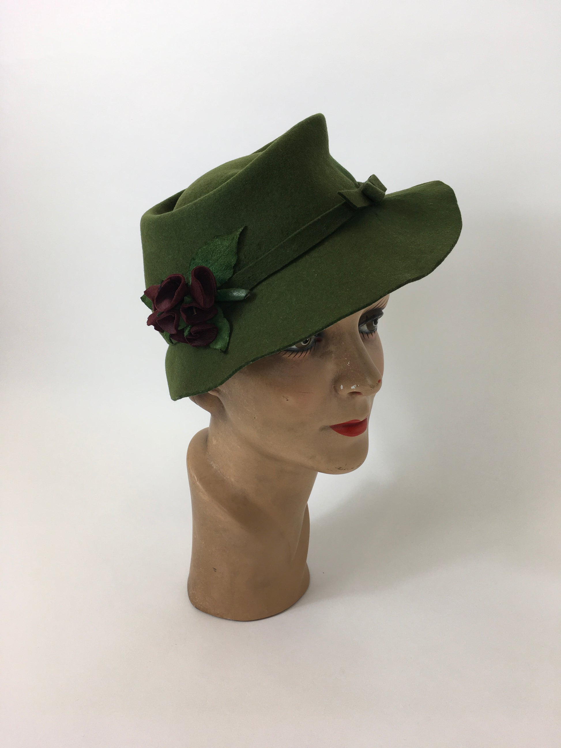 Vintage late 1930s early 1940’s felt hat in a beautiful warm bottle Green. Featuring a lovely raised bow detailing and a suede floral arrangement adornment. In lovely condition for it age. A great staple piece for any vintage wearer, this will look great with both dresses and suits or blouses and slacks combos.