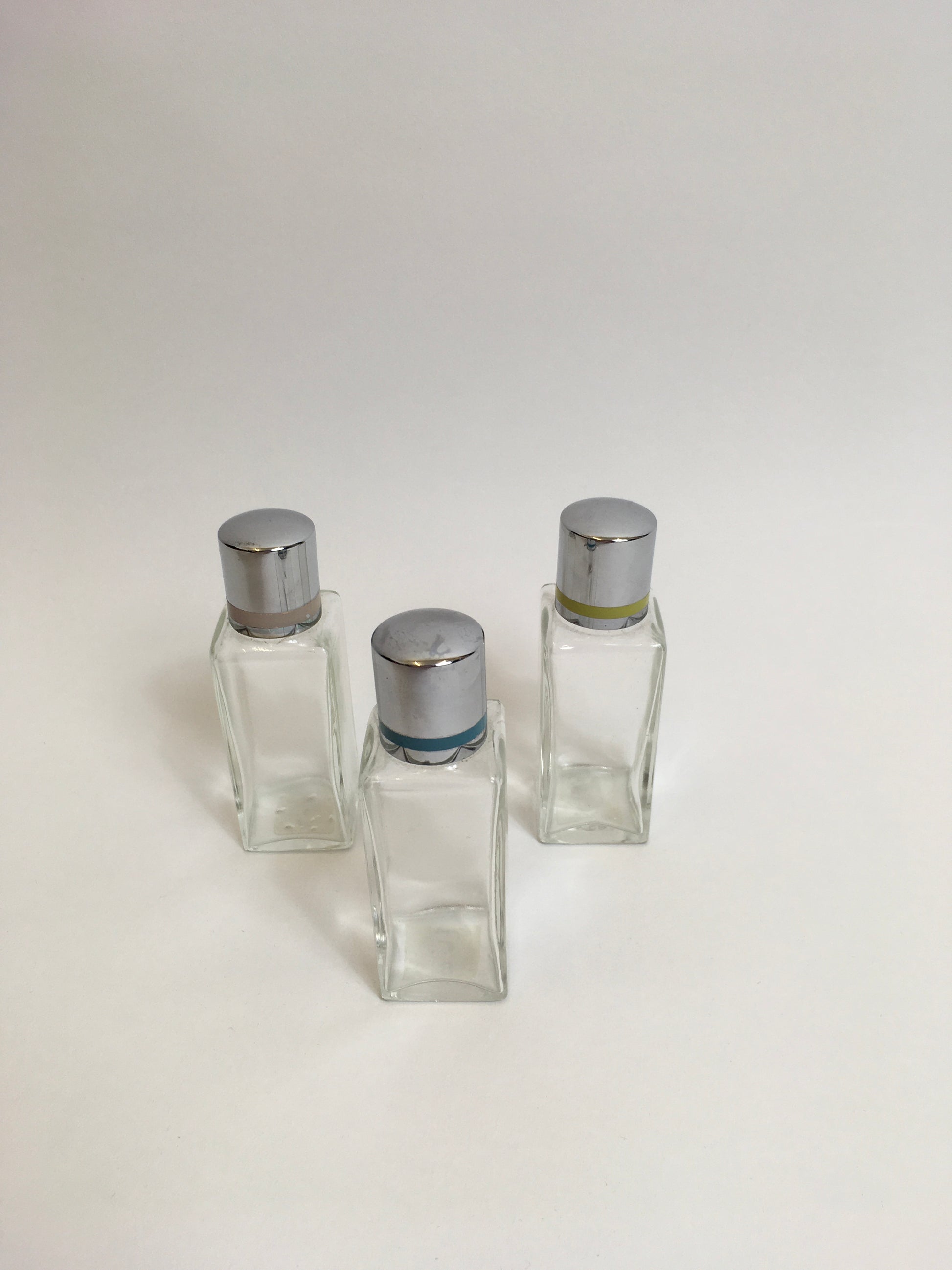 Vintage late 1930’s early 1940’s set of 3 vanity bottles. Made from glass with metal tops which feature pastel coloured bandings in yellow, pink & blue. Great addition to the dressing tables for decanting of different perfumes of salts etc.