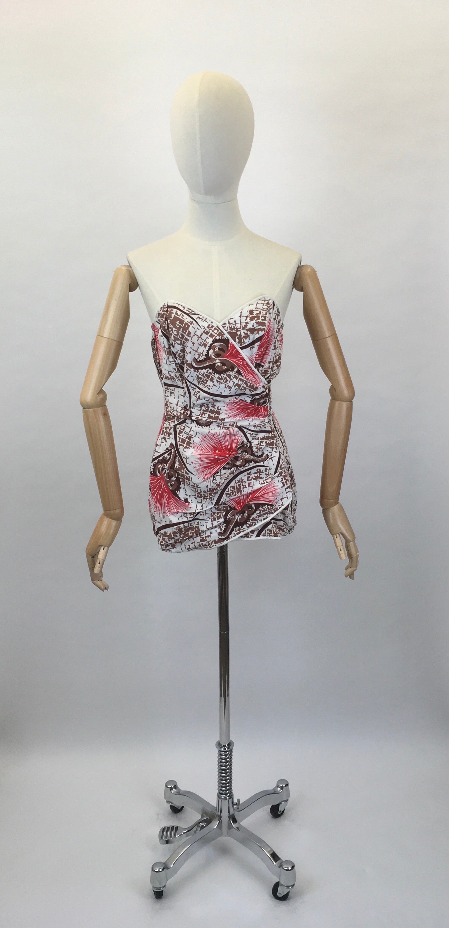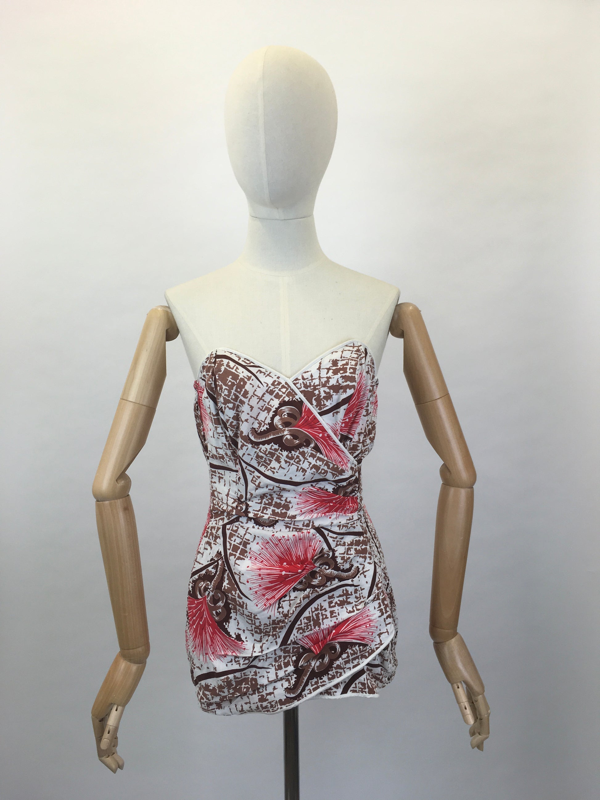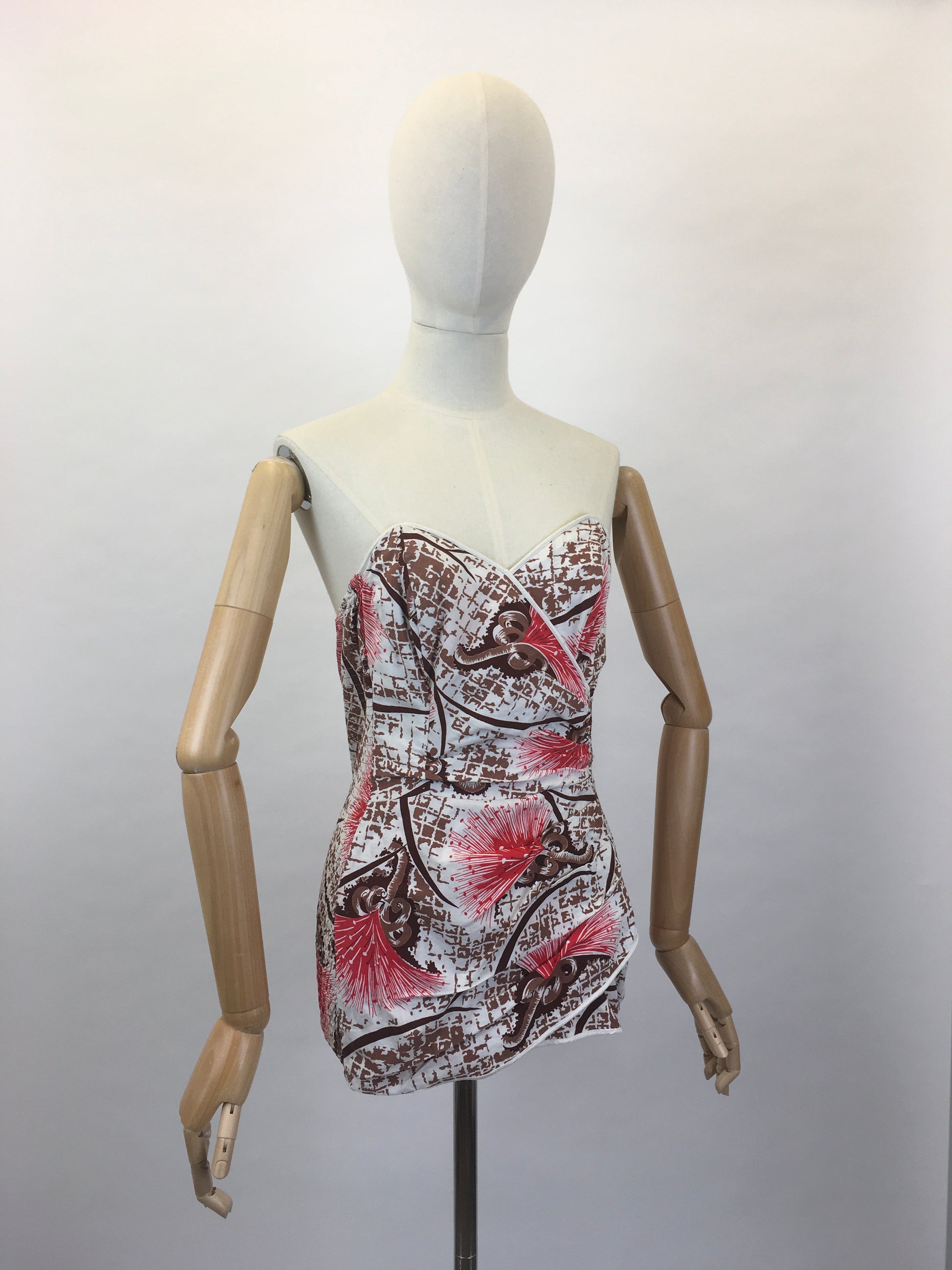 Vintage late 1940’s early 1950’s bathing costume with a ‘ Trulo Reg’d ‘ Label. Made in a fabulous classic shape with sweetheart neckline, with a stylised wrap front with layered overlay and shirred back panel, really accentuating the female shape. Made from a lovely cotton in browns and bright corals. The elastic shirring to the back panel could do with being re done at some point to help keep the costume up.