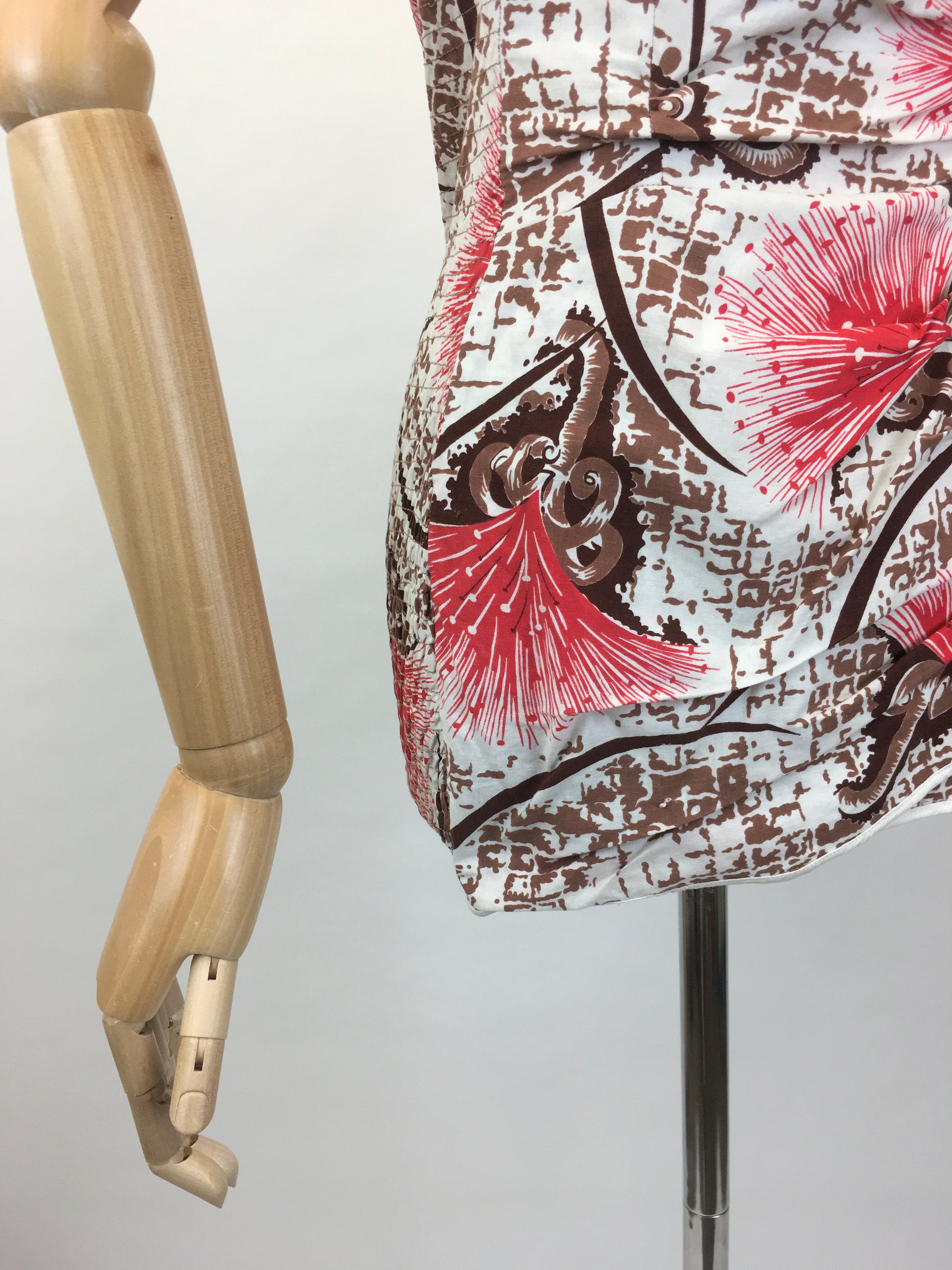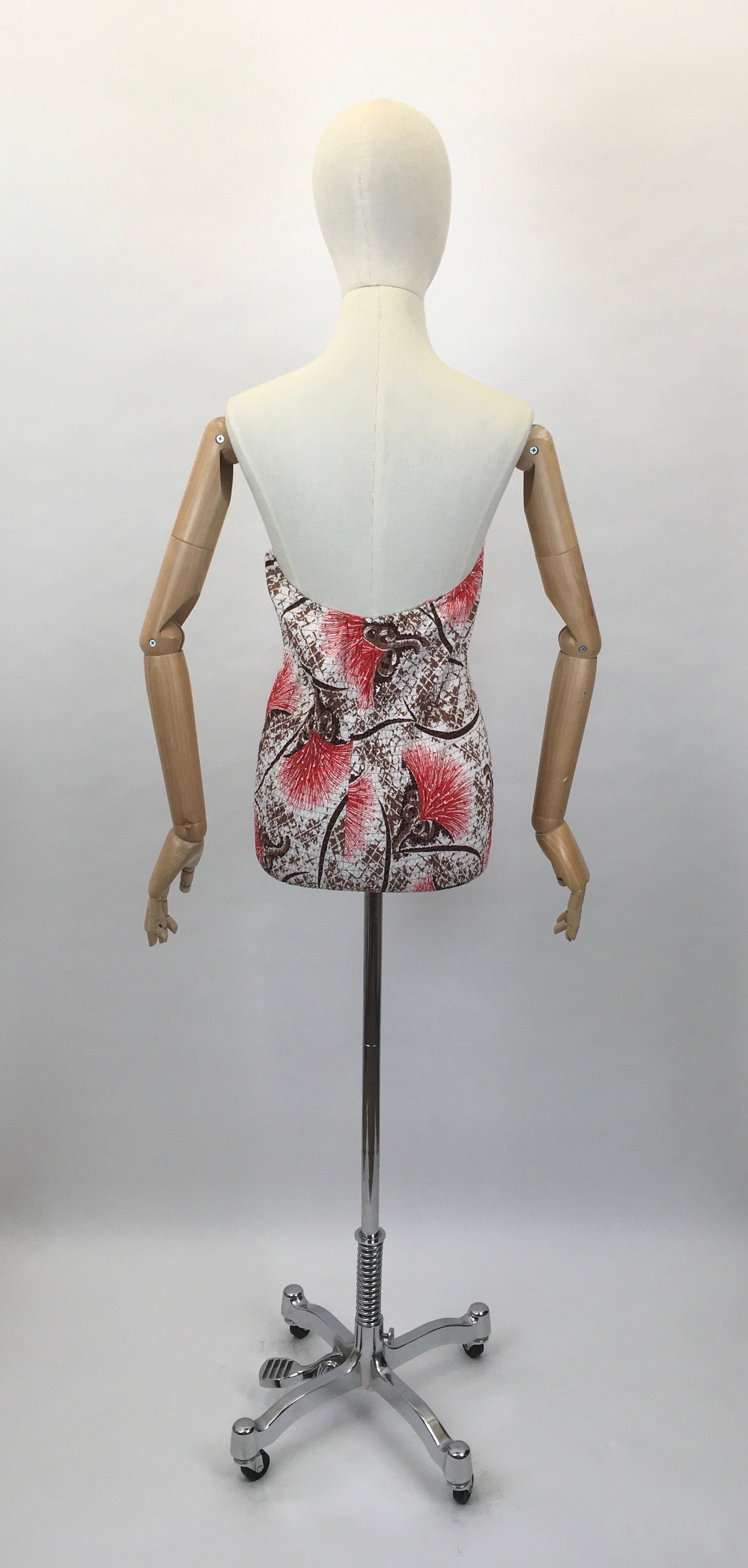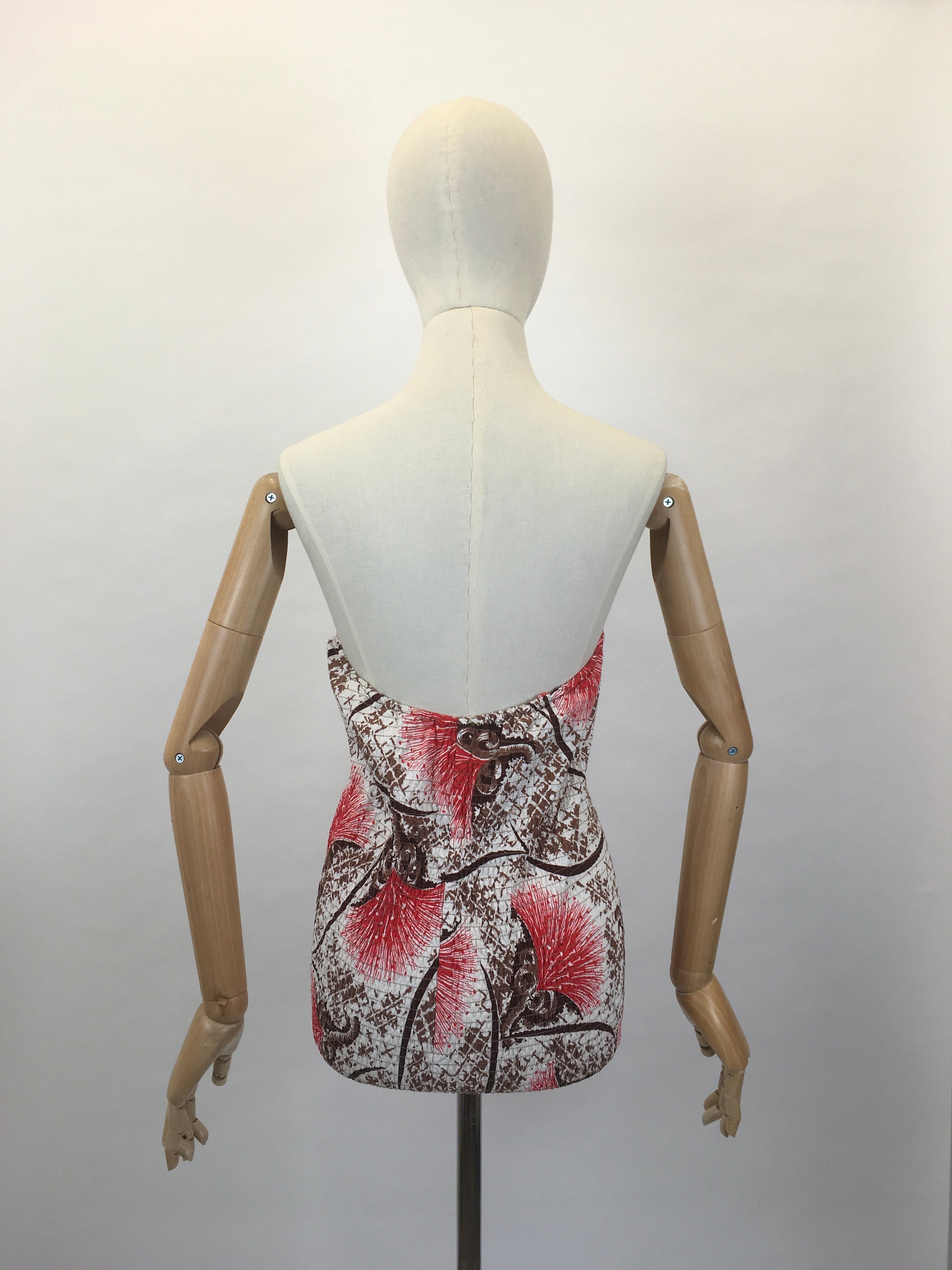 Vintage late 1940’s early 1950’s bathing costume with a ‘ Trulo Reg’d ‘ Label. Made in a fabulous classic shape with sweetheart neckline, with a stylised wrap front with layered overlay and shirred back panel, really accentuating the female shape. Made from a lovely cotton in browns and bright corals. The elastic shirring to the back panel could do with being re done at some point to help keep the costume up.
