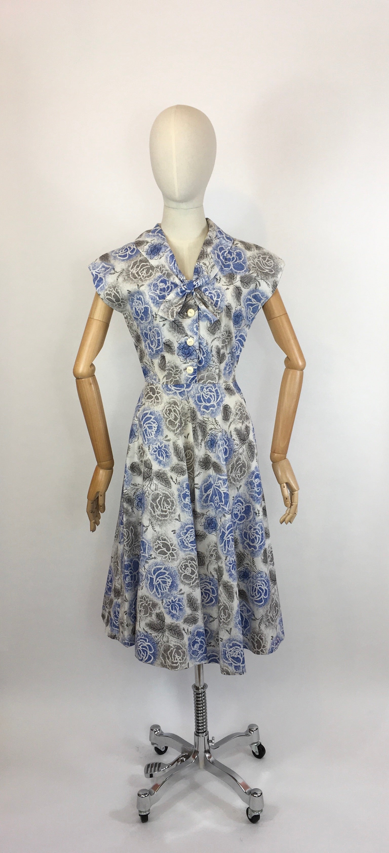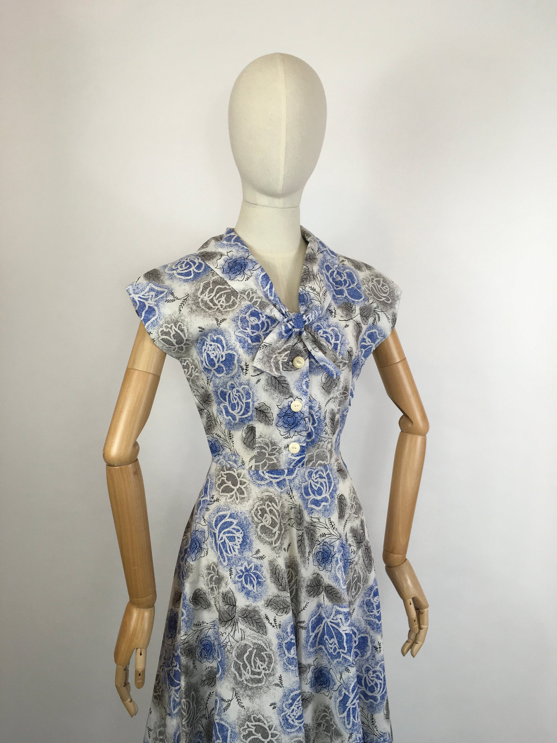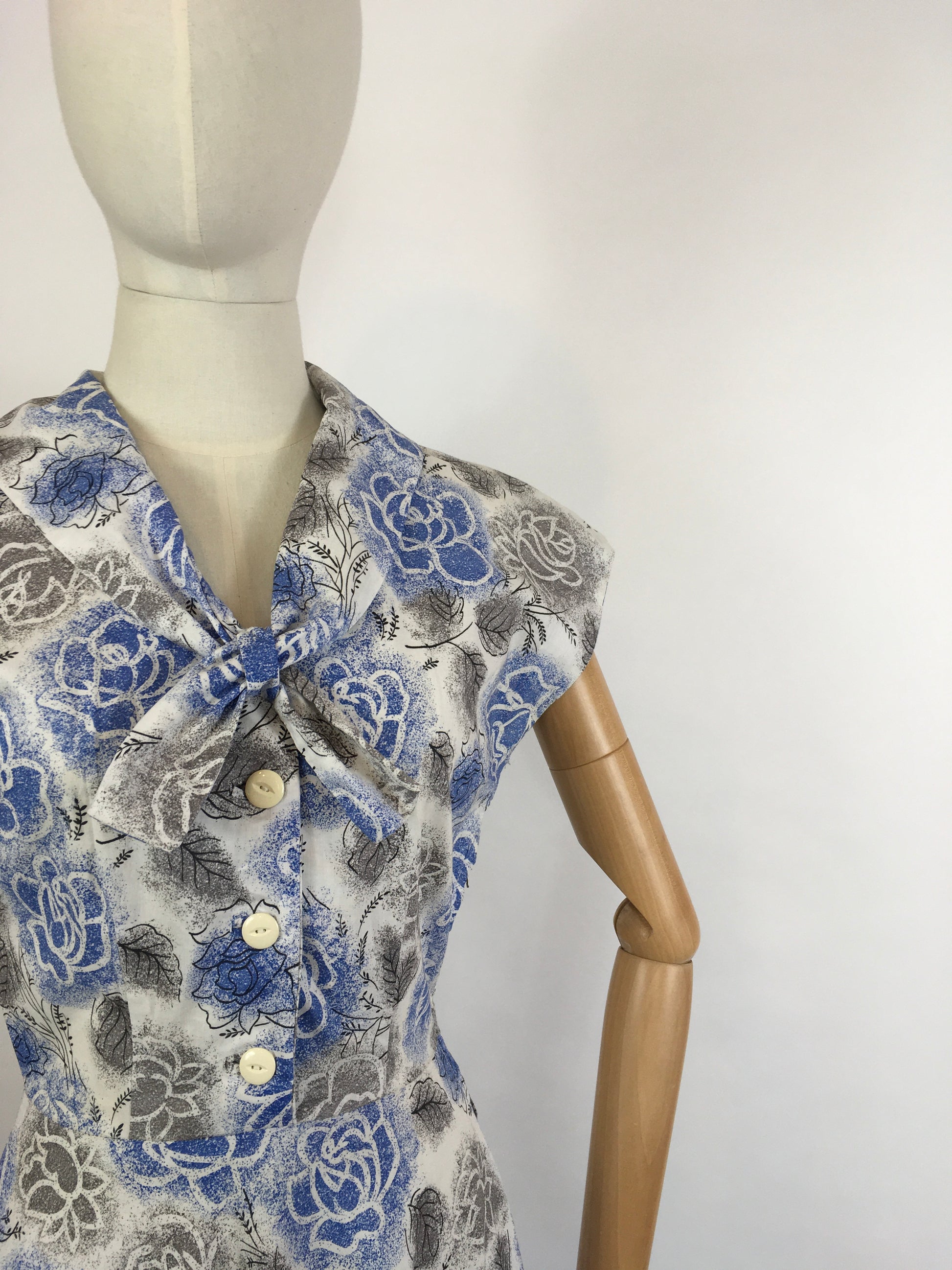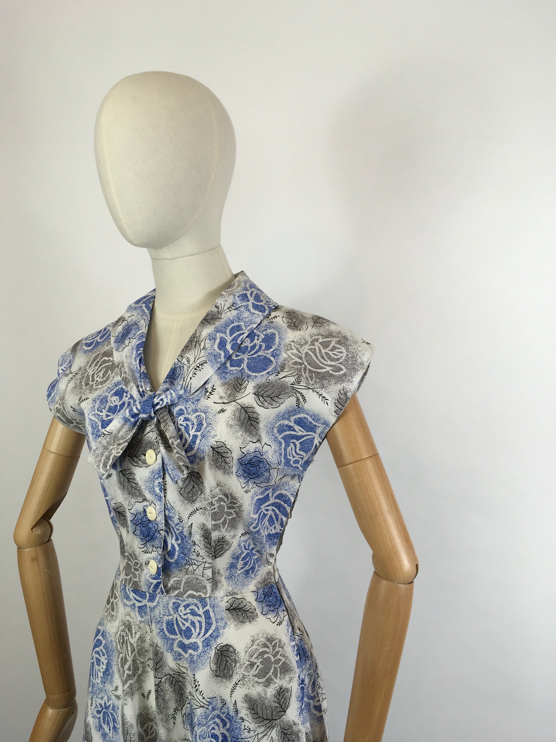Original late 1940s Floral Dress - In A Crisp Cotton in Soft Greys, Charcoals and Blues