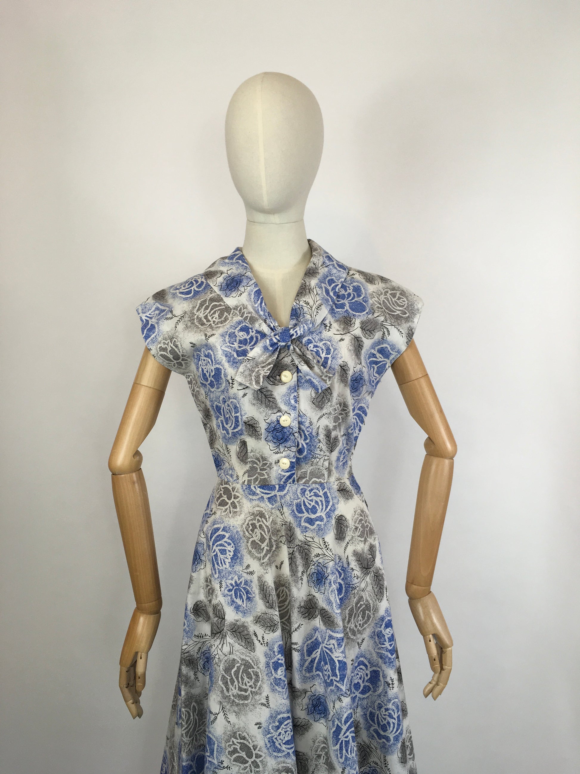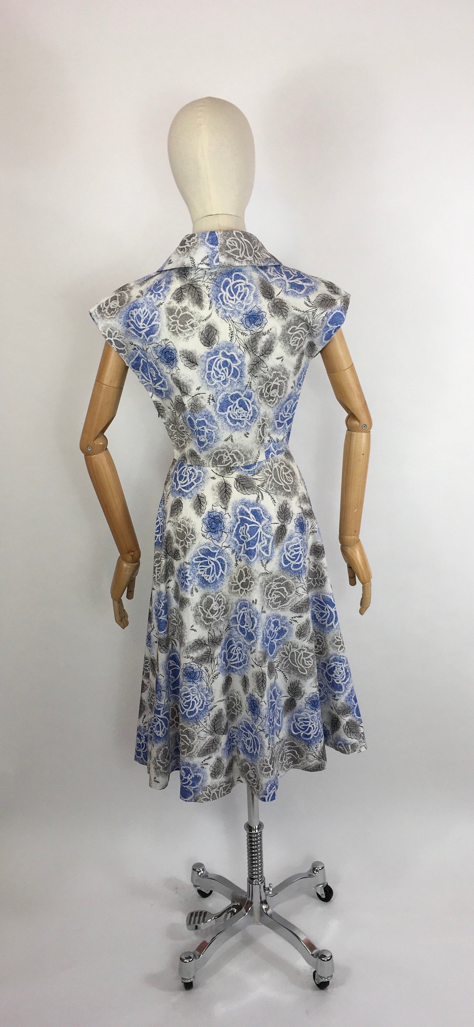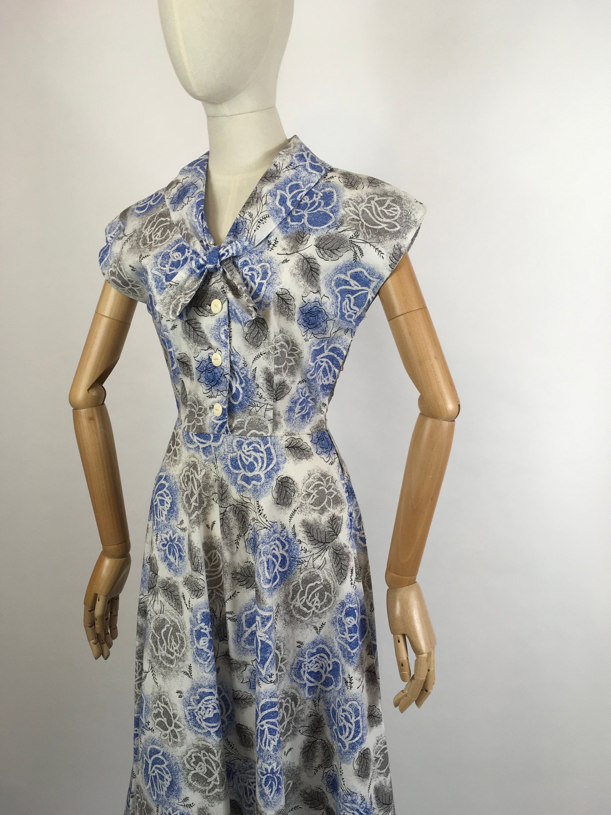 Vintage late 1940s floral day dress in a beautiful simple silhouette with cap sleeve, shawl style collar, button front and size zip fastening into a 40s circle skirt. Made from a lovely crisp cotton in Soft greys, charcoals and blue.