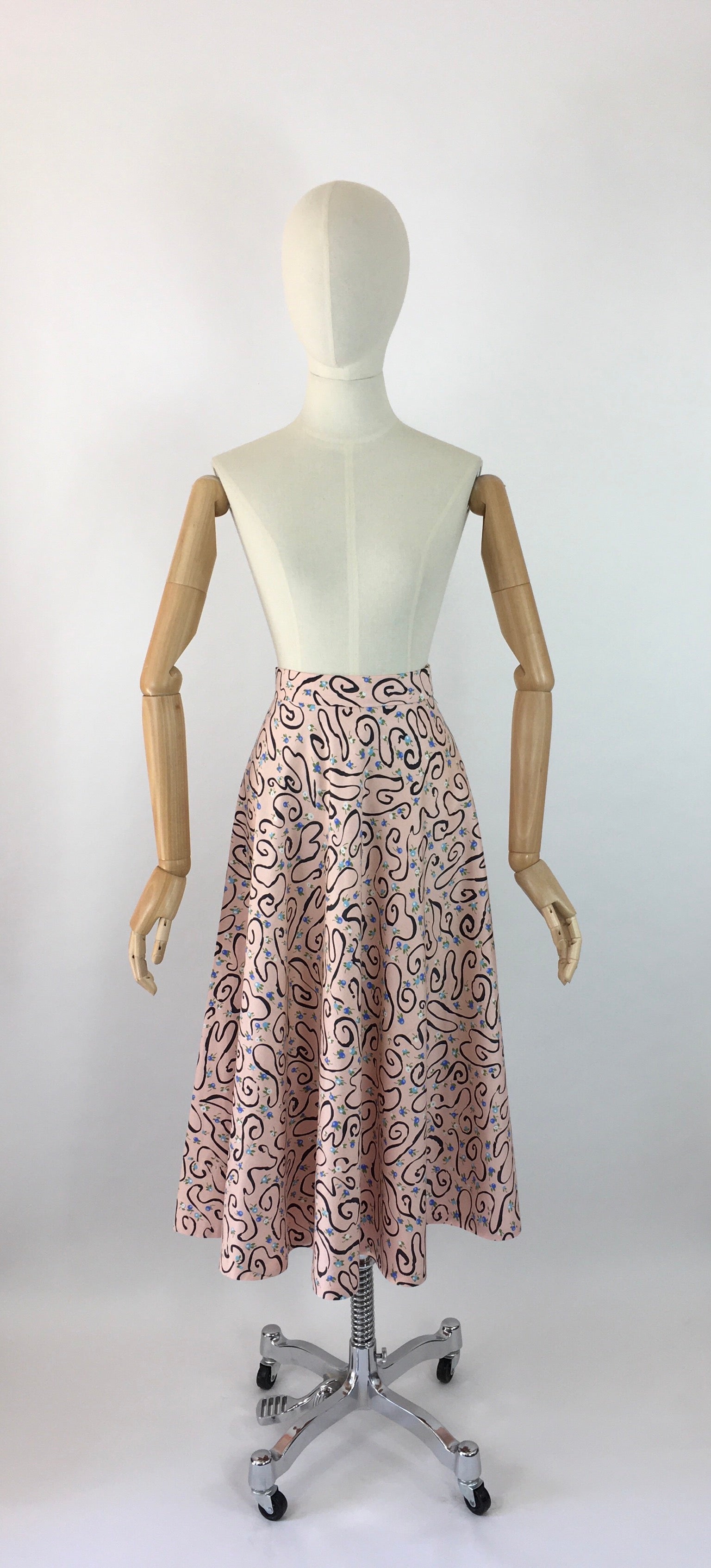 Vintage late 1940s full circle skirt in a beautiful floral and swirl pattern Cotton sateen fabric. Featuring a simple waistband with hook and eye and zip fastening which flows into a full sweeping skirt 118’ full ! This is definitely a great dancing skirt with so much movement.