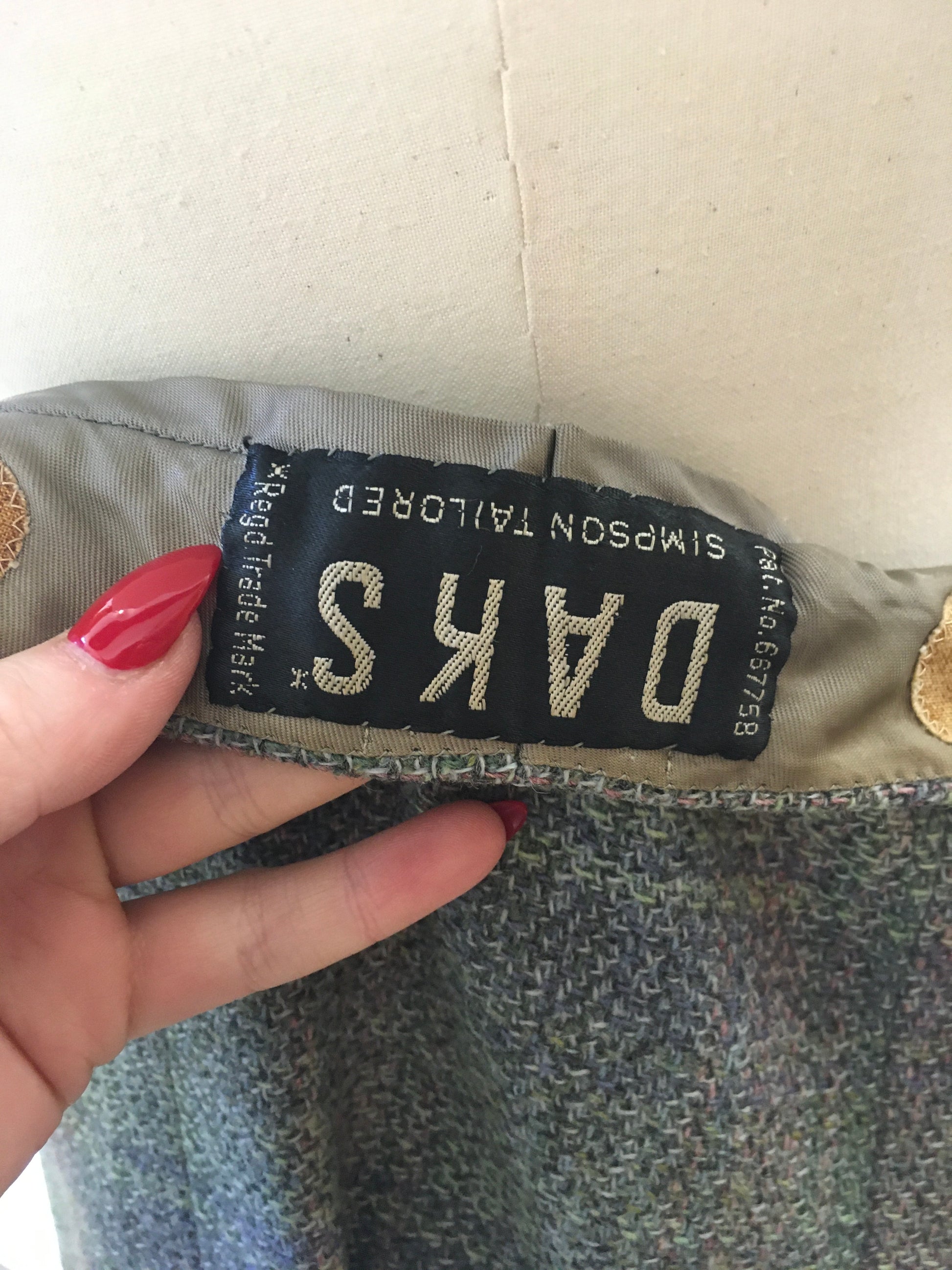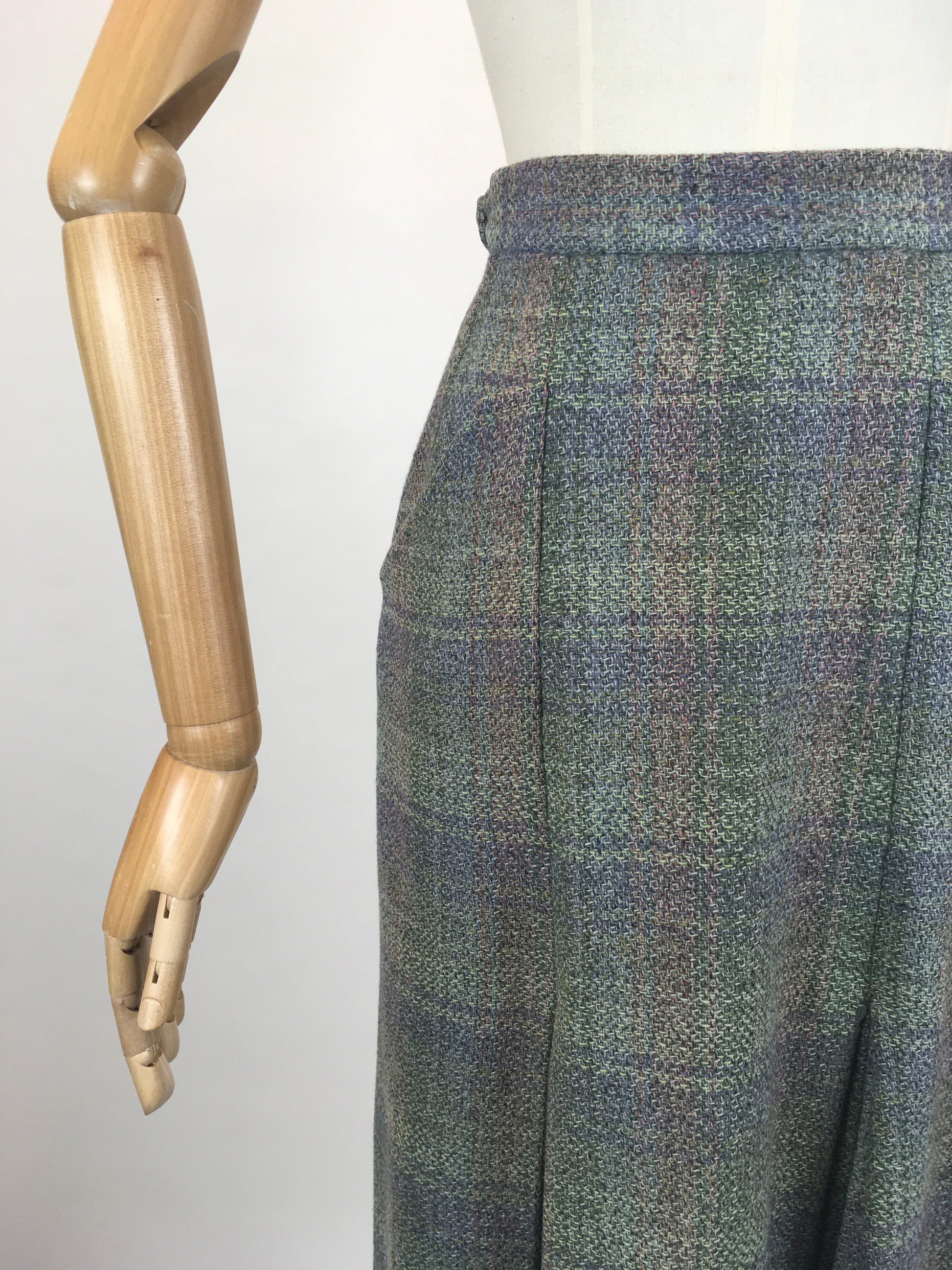 Vintage late 1950’s wool skirt by ‘ Daks’ in a lovely colour pallet of purples, greens, pinks and blues. Features side pockets, side metal zip fastening and kick pleats to the bottom hem which make a fantastic silhouette.