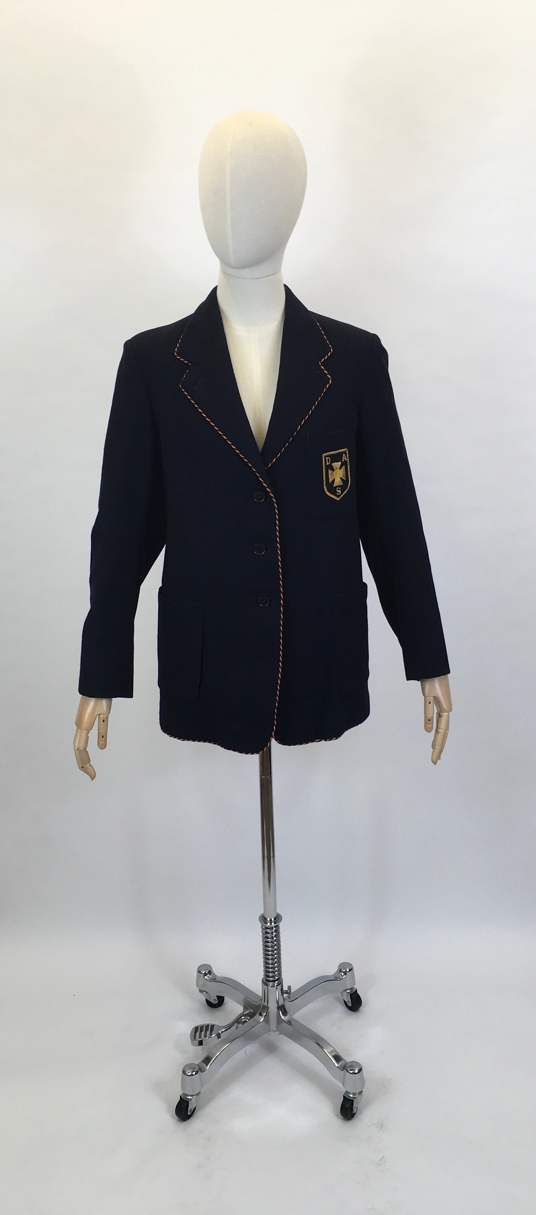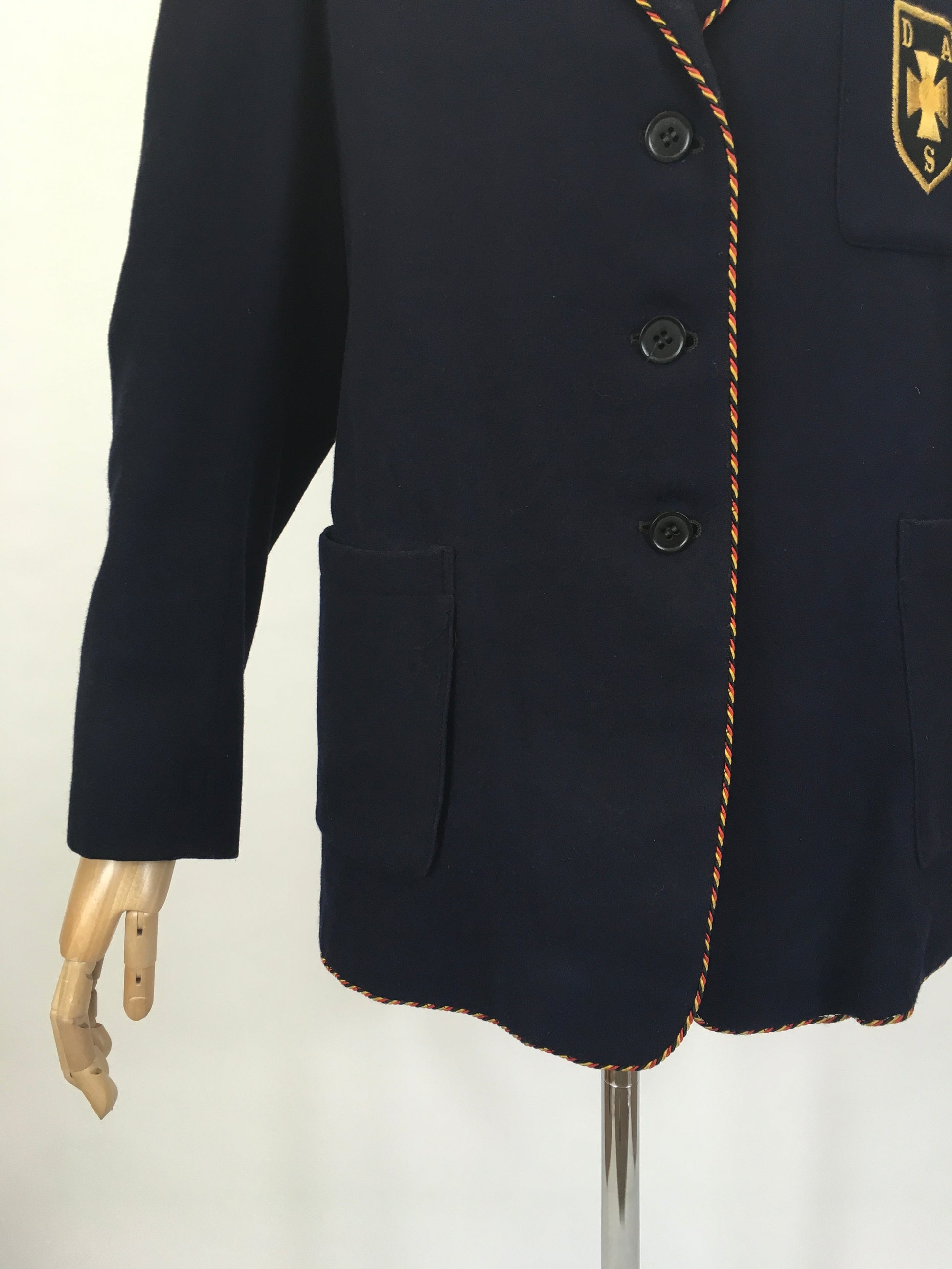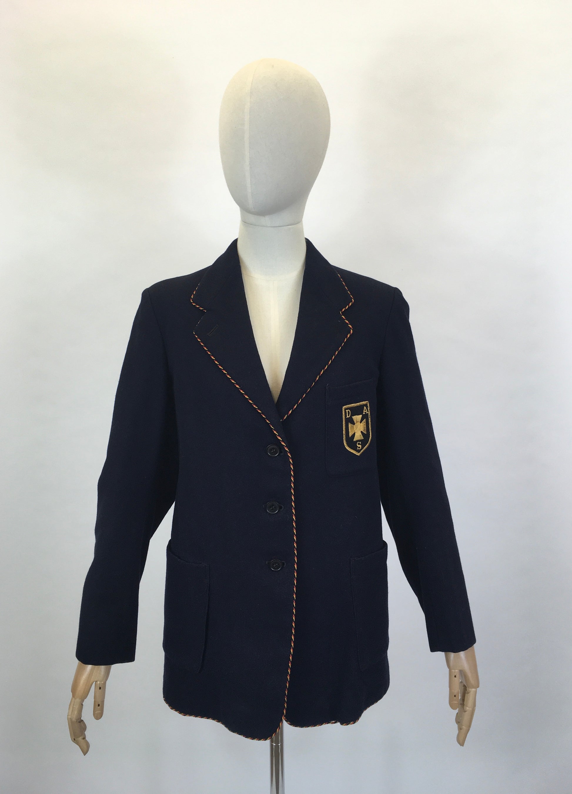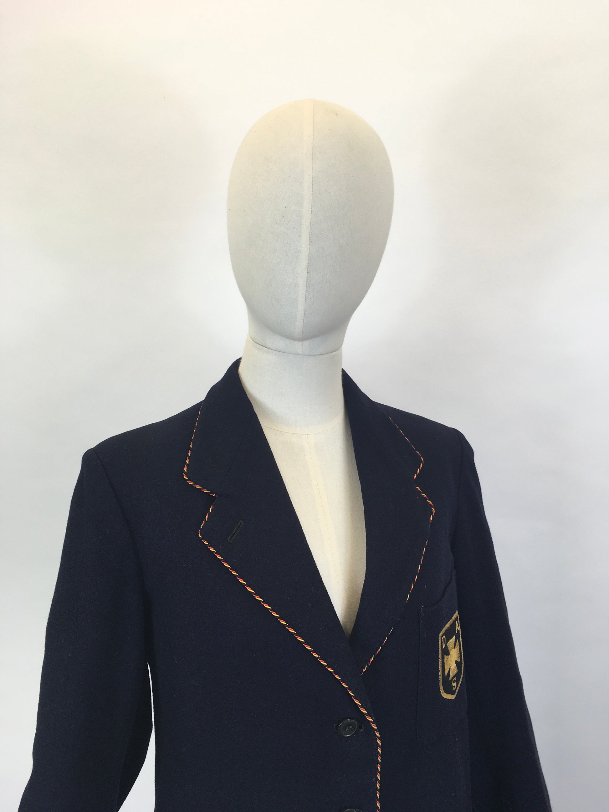 Vintage school blazer with a ‘ Raymond Barnes ‘ label. A classic blazer shape in black suiting cloth with a braided edge in red and yellow, the emblem is to the front, has pockets and pockets to the inside with lined sleeves.