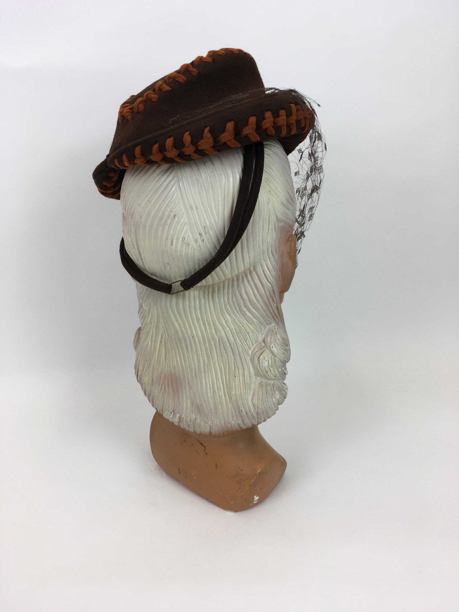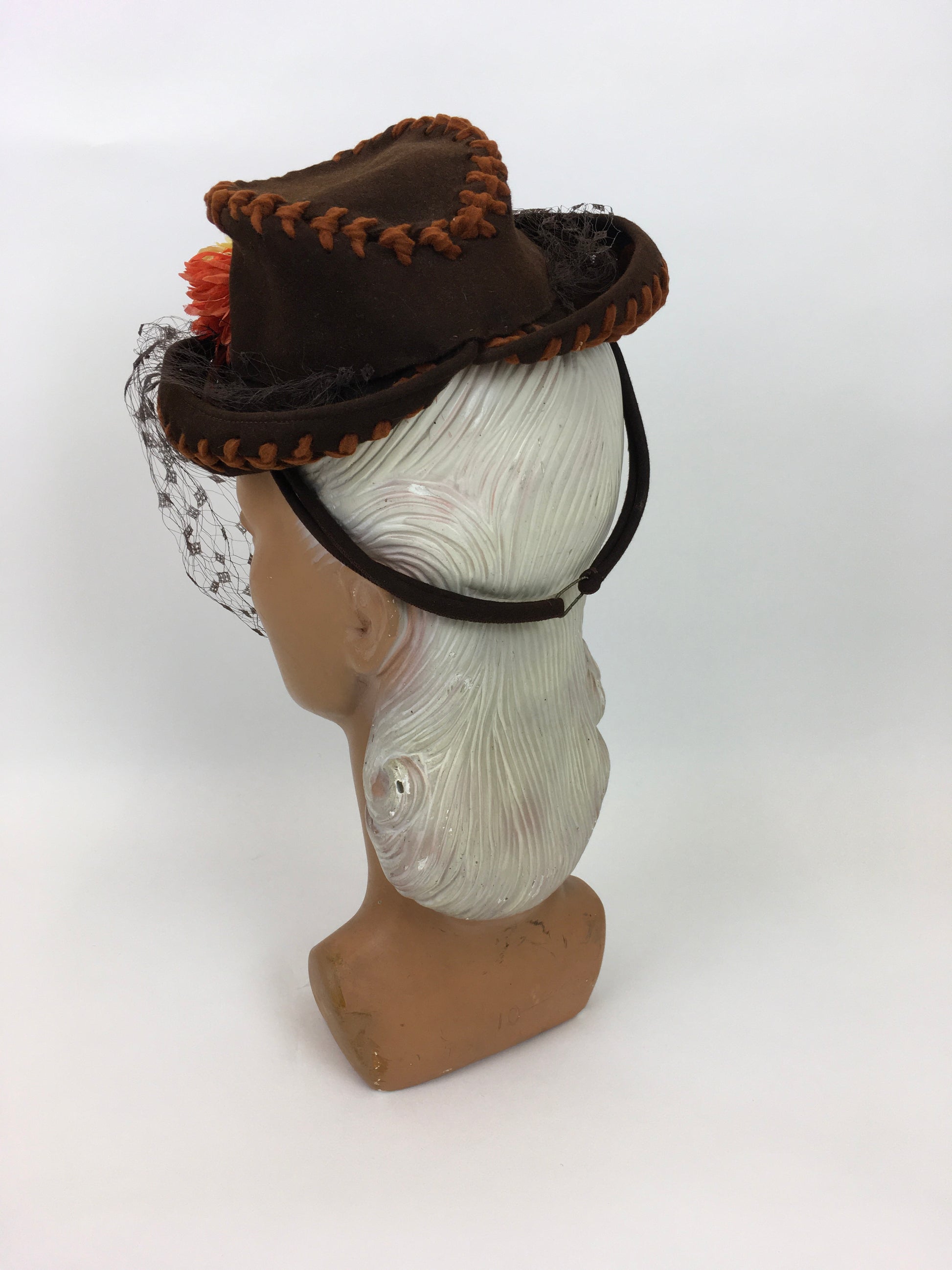 Vintage sensational 1940s American topper hat labelled ‘ Goldstein - Higel Co’. Made from a beautiful warm brown felt, the perfect addition to an autumnal ensemble with orange and yellow floral adornment to the front with brown veiling, and a contrast Orange stitchwork to the topper edging. The hat features a double back strap For ease of wearing.