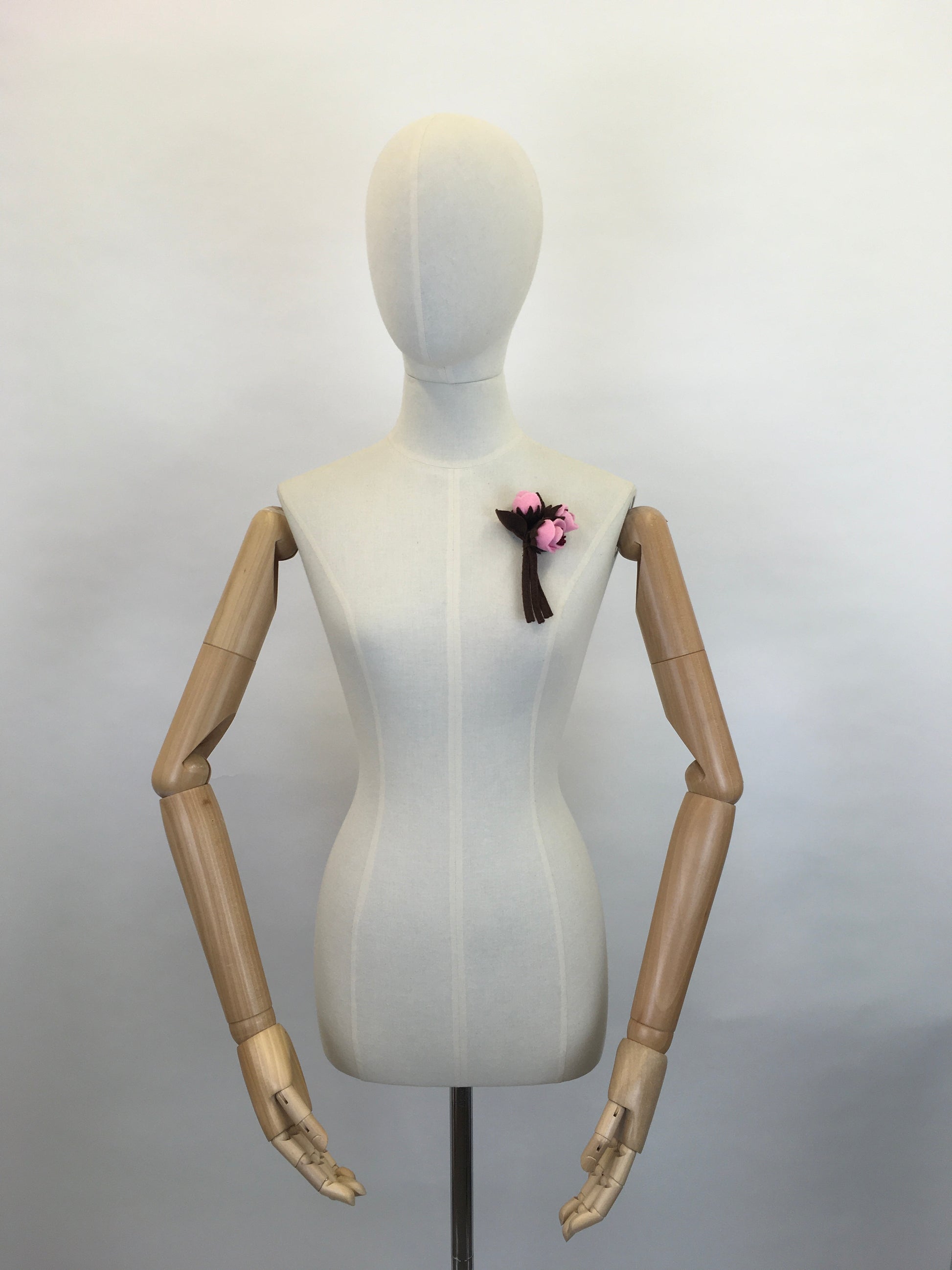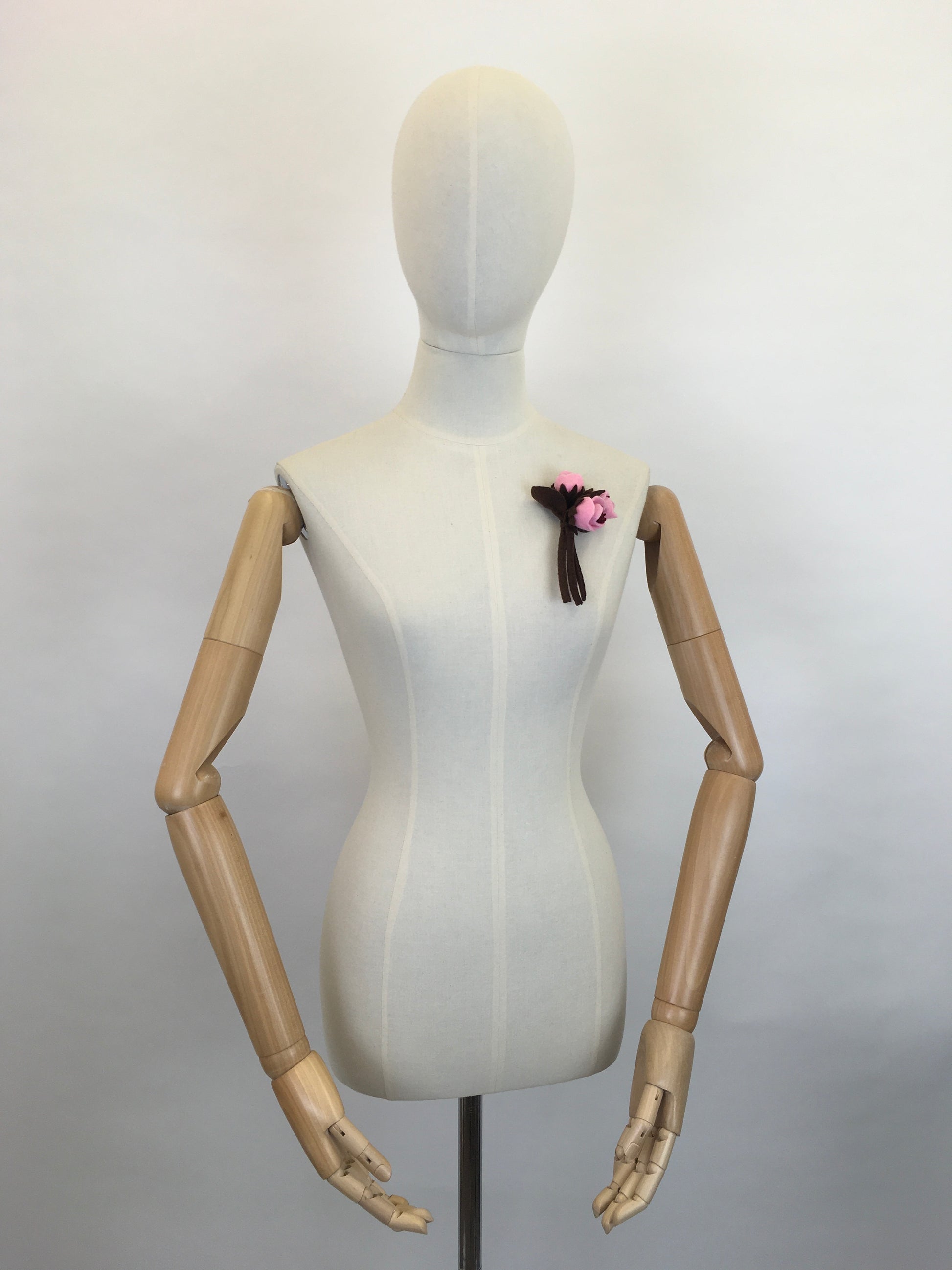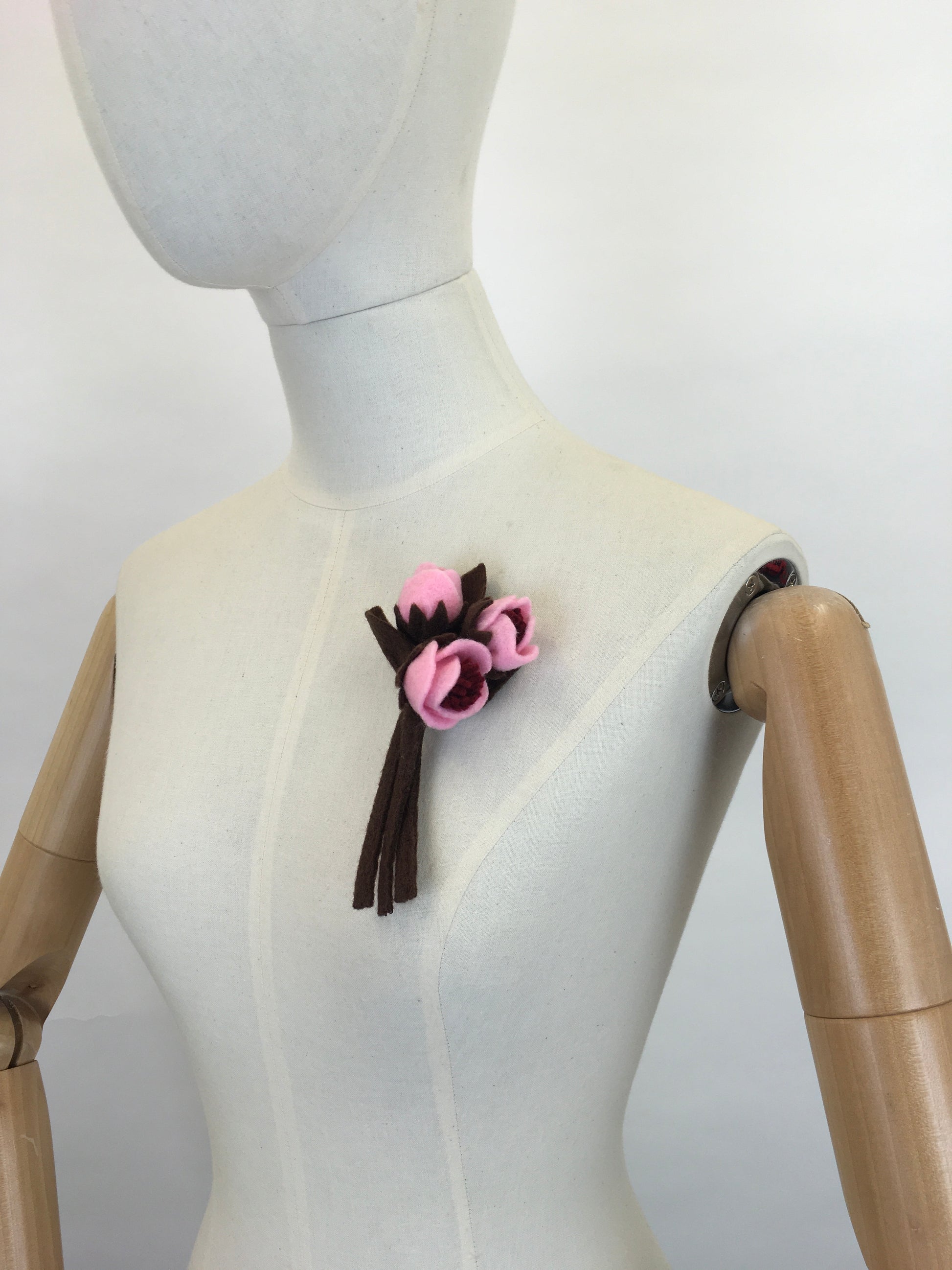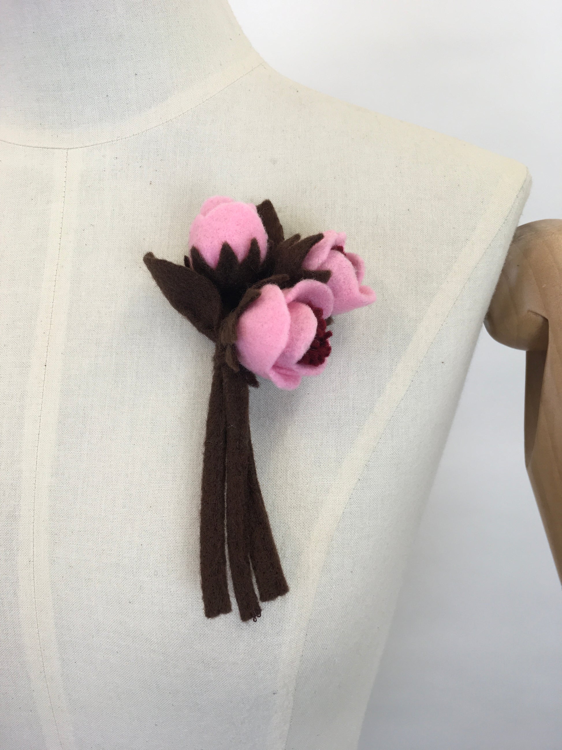 Reproduction vintage 1940s make do and mend era felt flower corsage with a brooch backing ready to wear. In a lovely pink and brown colour pallet, great for all the seasons! A lovely treat to yourself or someone special.