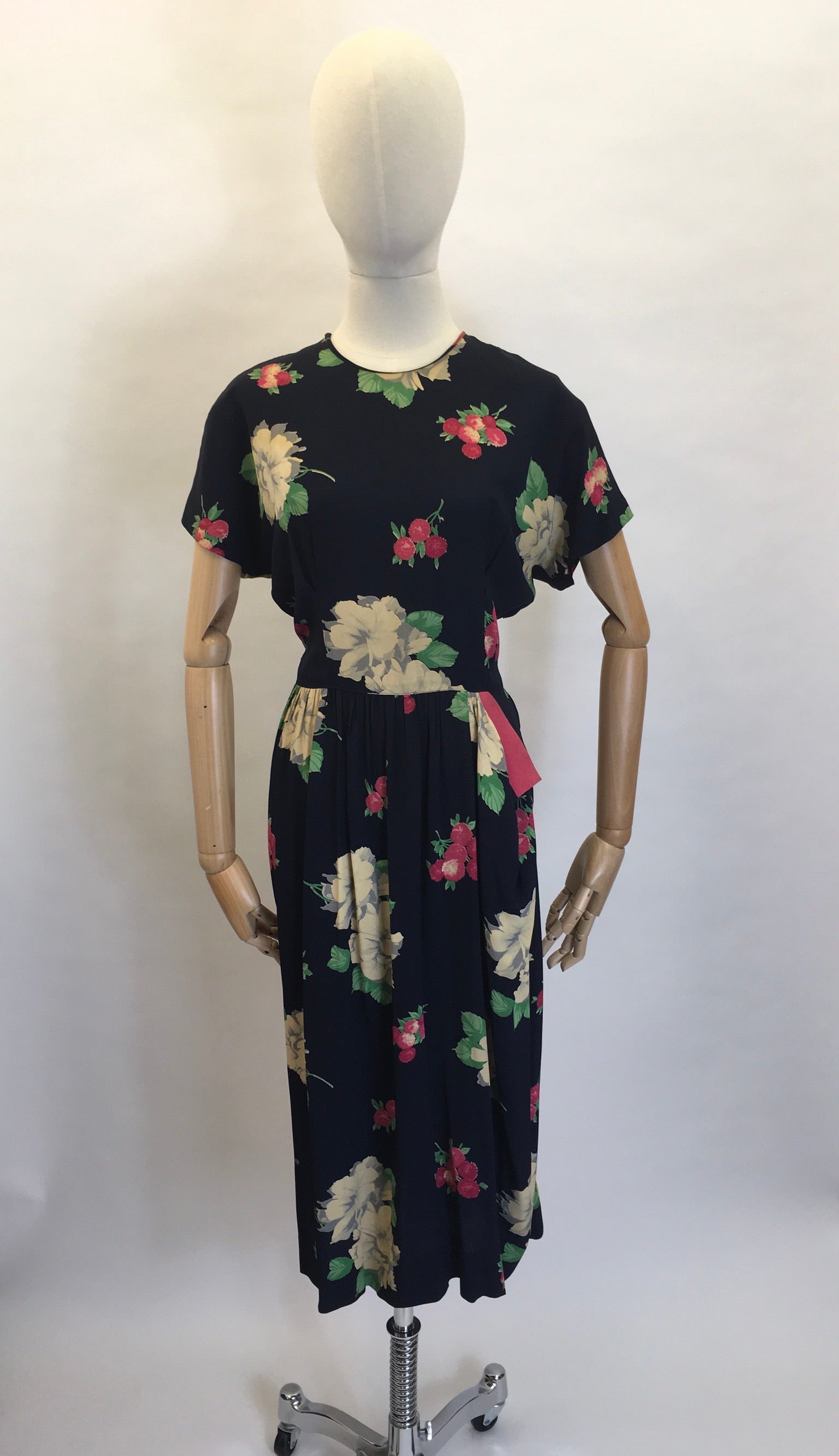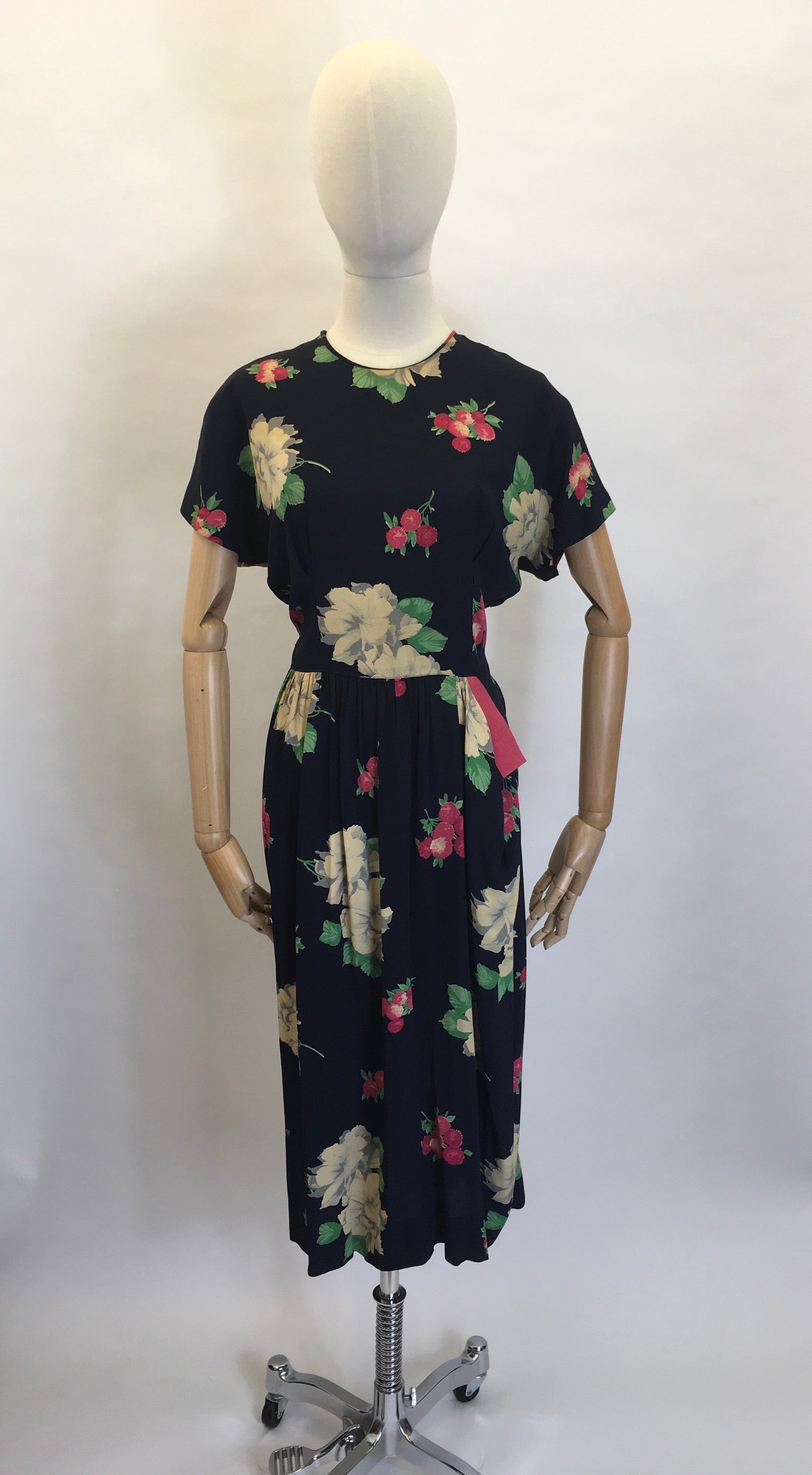 Vintage 1940's stunning floral rayon dress featuring a scoop neckline, slight dolman sleeve, cinched in waist with slightly pleated free flowing skirt and a lovely grosgrain contrasting sash detail to the waist. Fastens with a back and side metal zip.