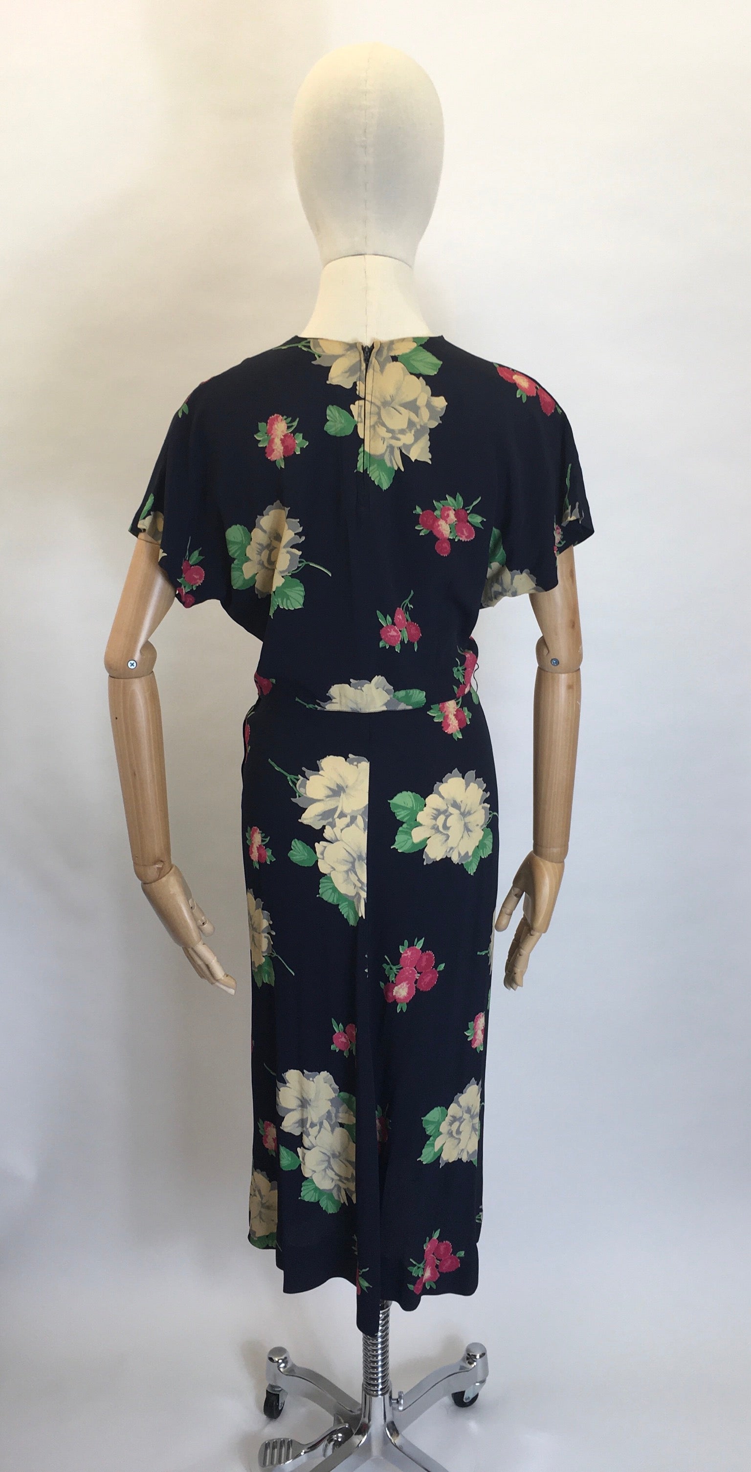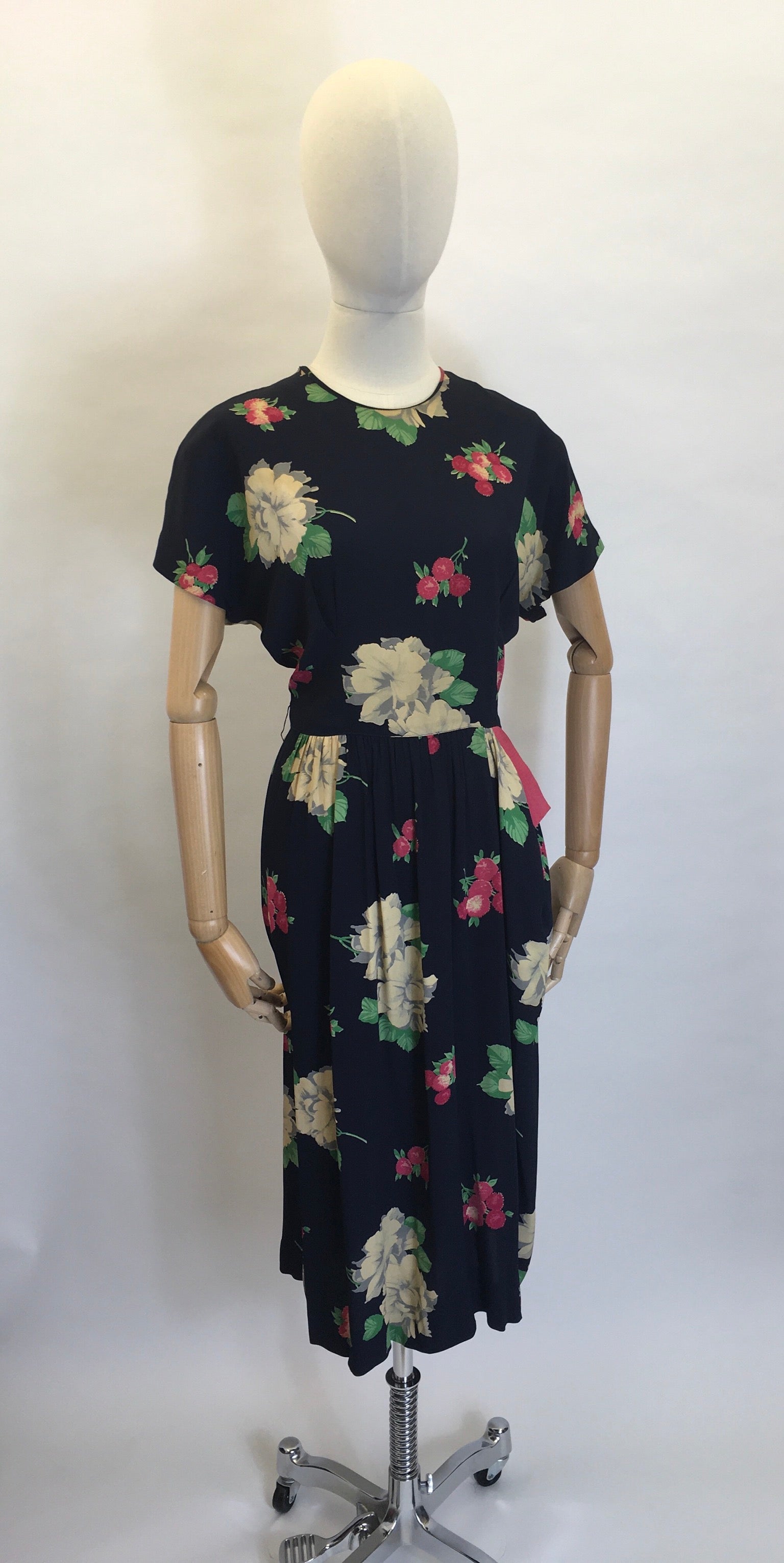 The dress is made from a beautiful rayon crepe in a lovely whimsical rose design in buttermilk, soft greens and rose pinks on a bed of navy. A great addition to any vintage ladies wardrobe and could be worn as daywear or eveningwear with an array of complimentary accessories.