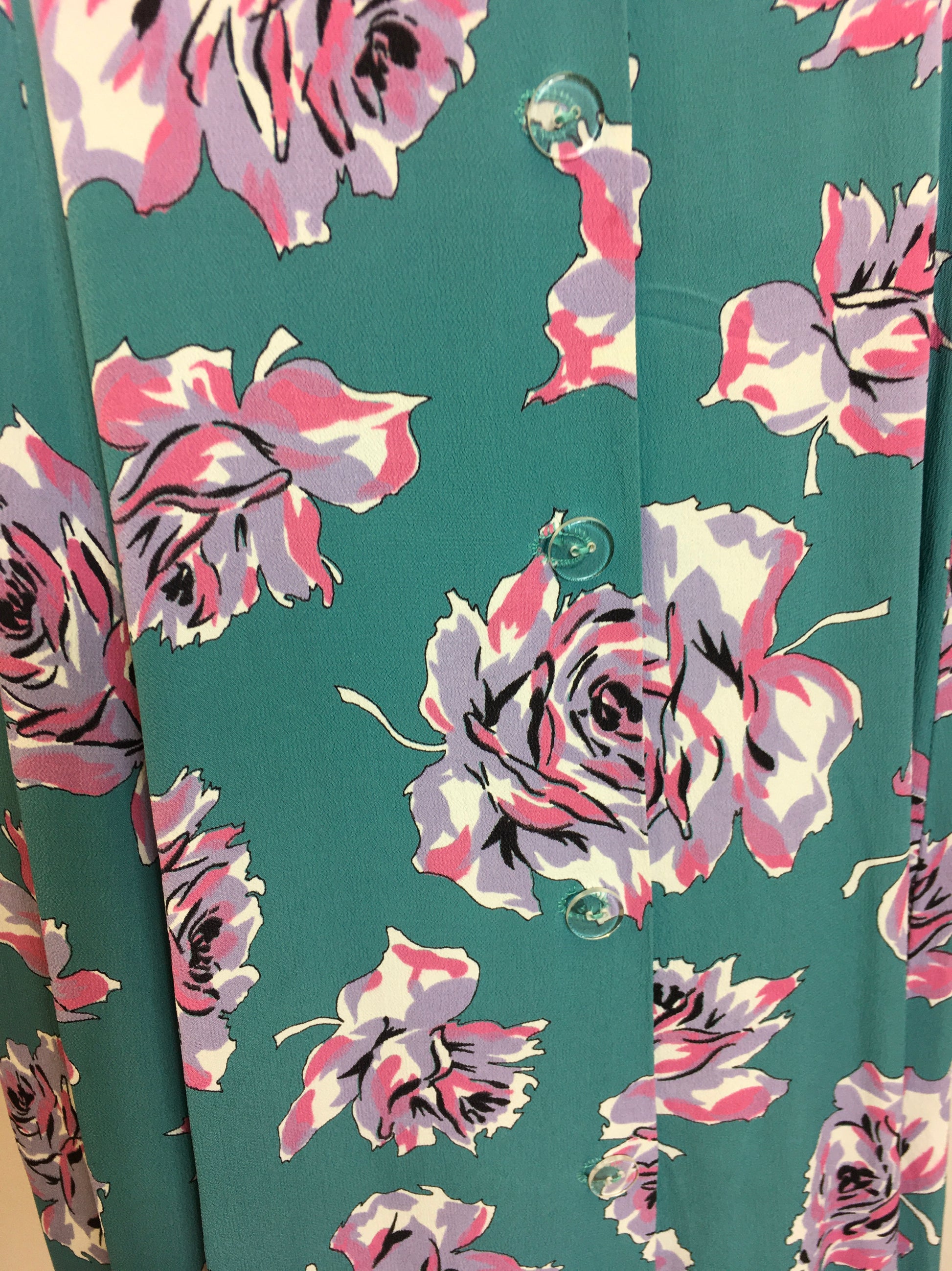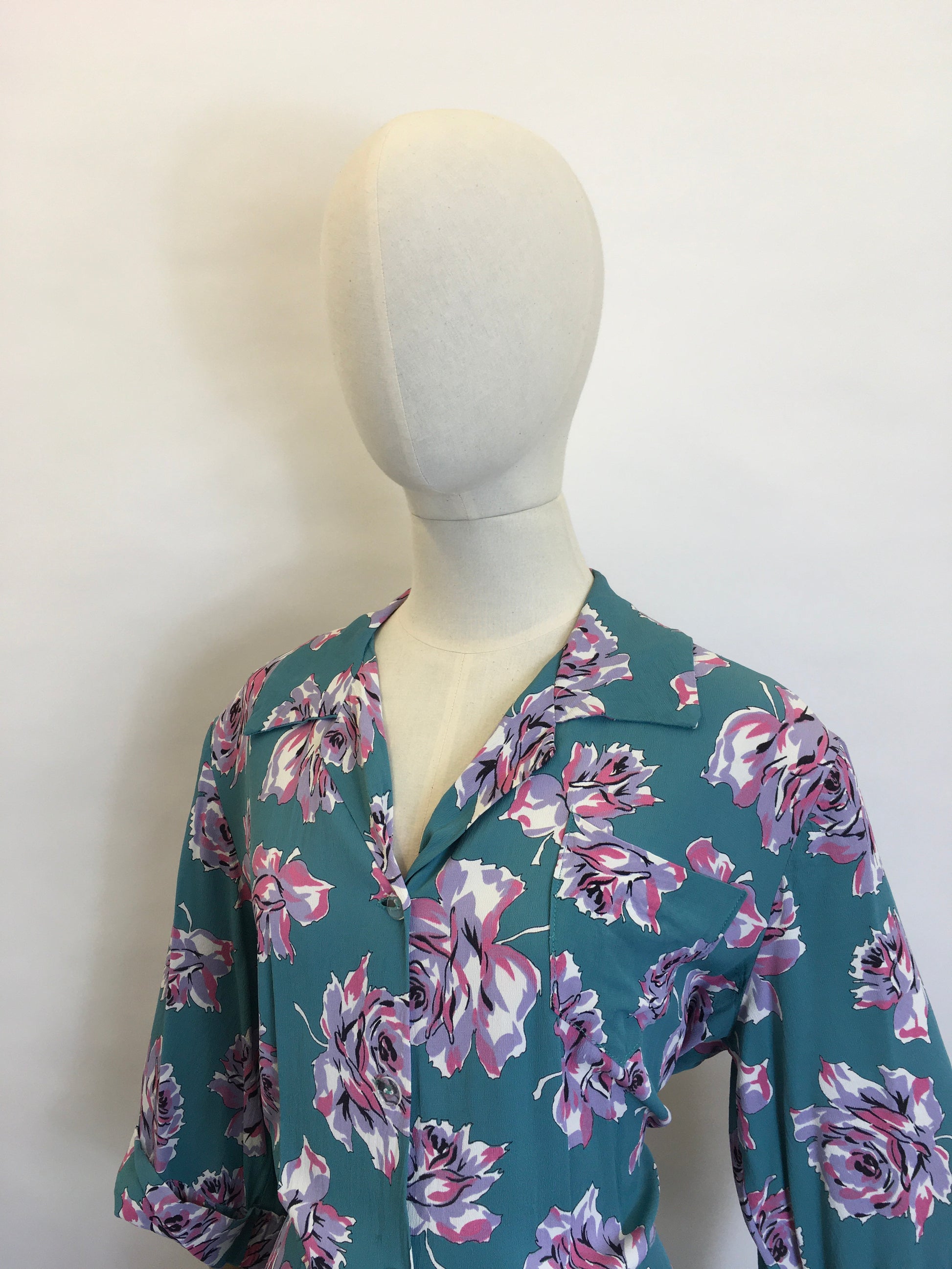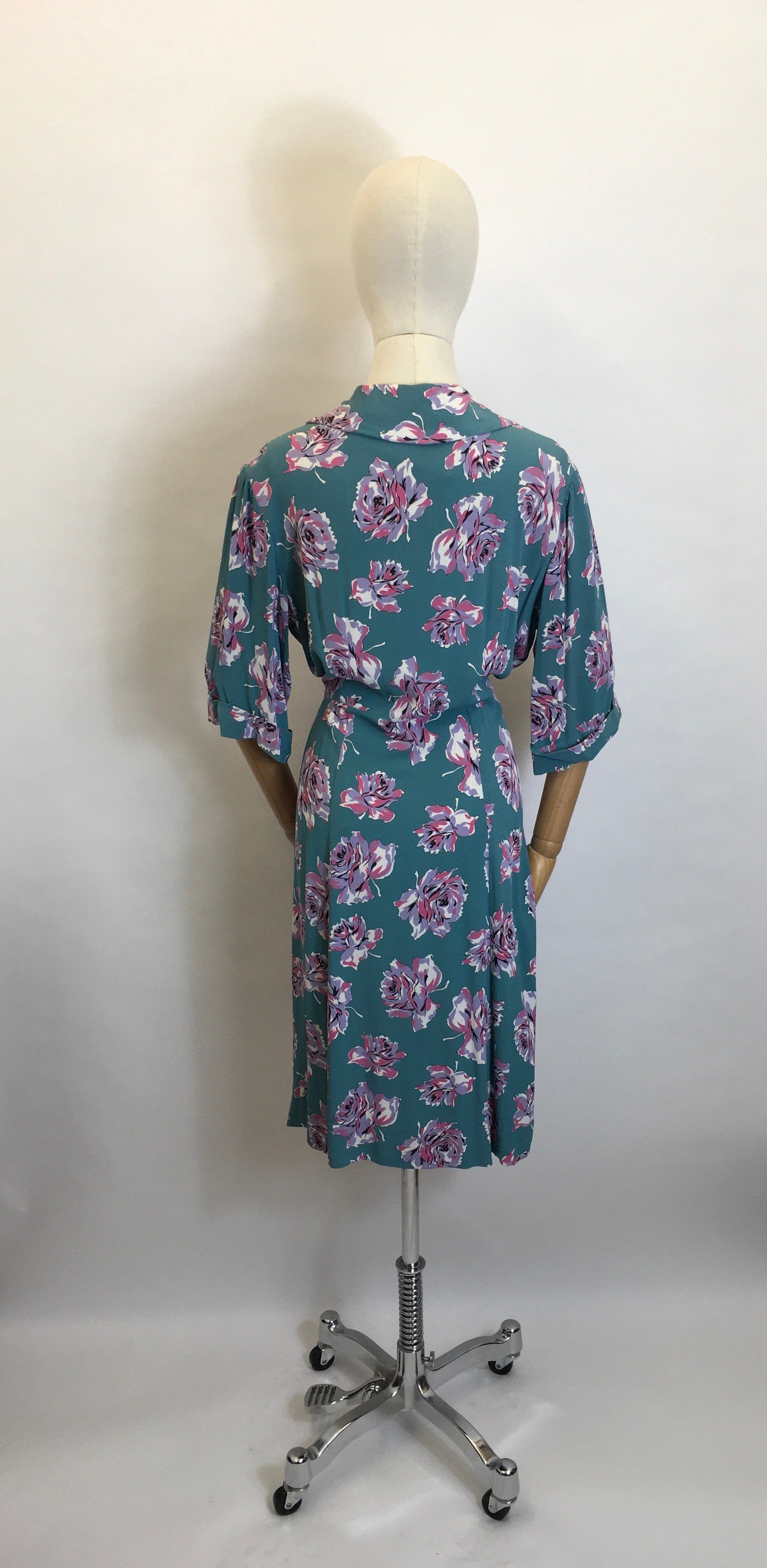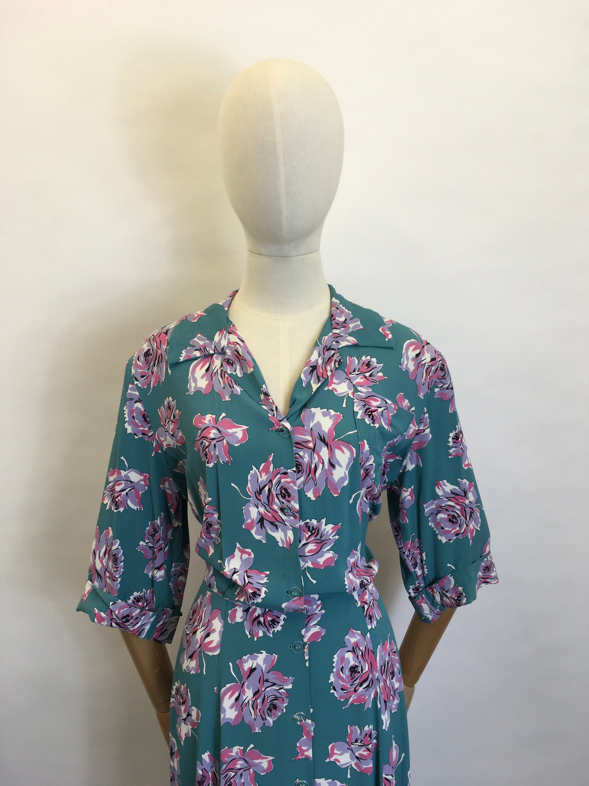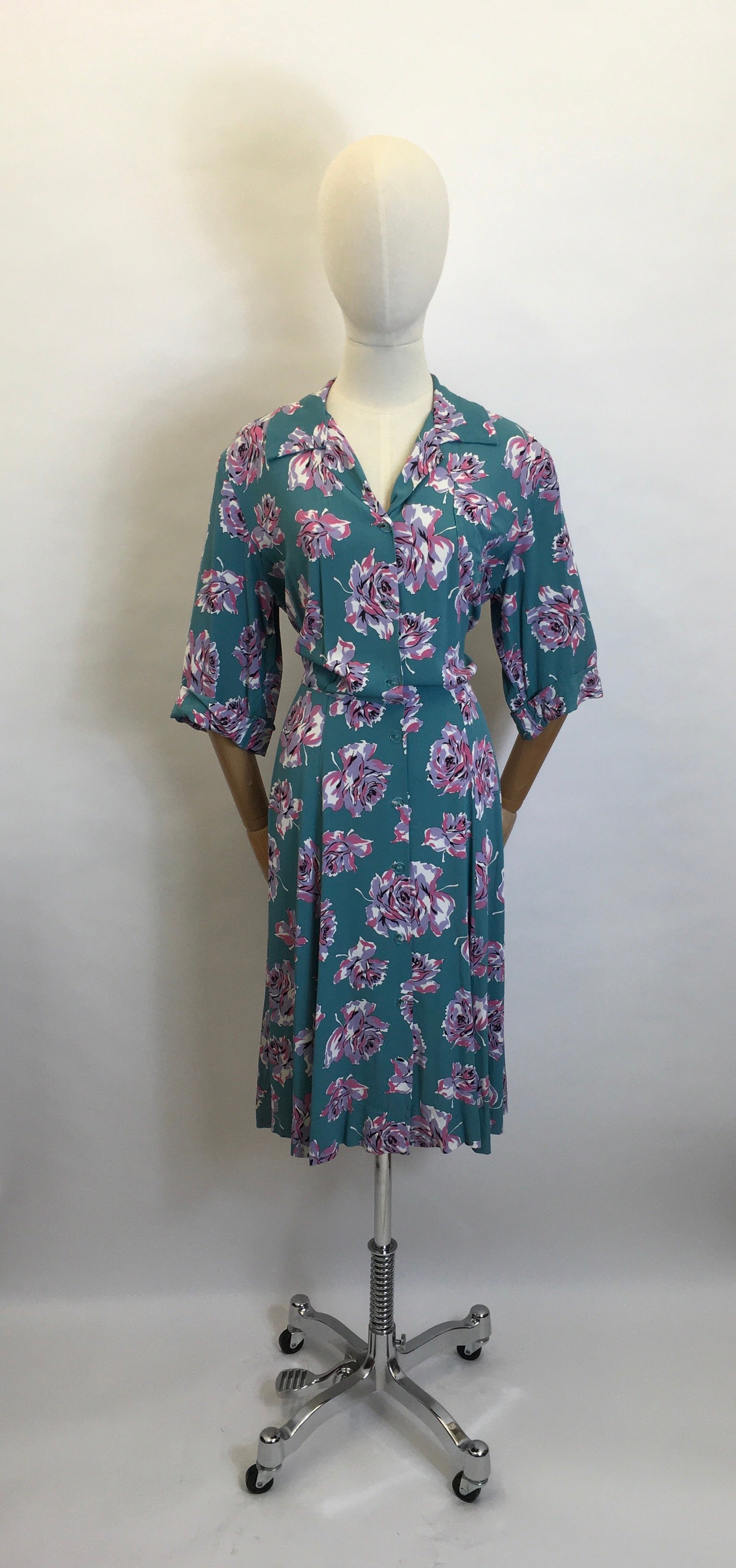 Vintage 1940's VOLUP day dress, which could easily be worn for cocktails in the evening with the correct accessories. Made from a beautiful flowing rayon in a gorgeous floral pattern using a frosted winter berry colour palette of rich turquoise, warm pinks, rich purples and frosted ivories and greys.