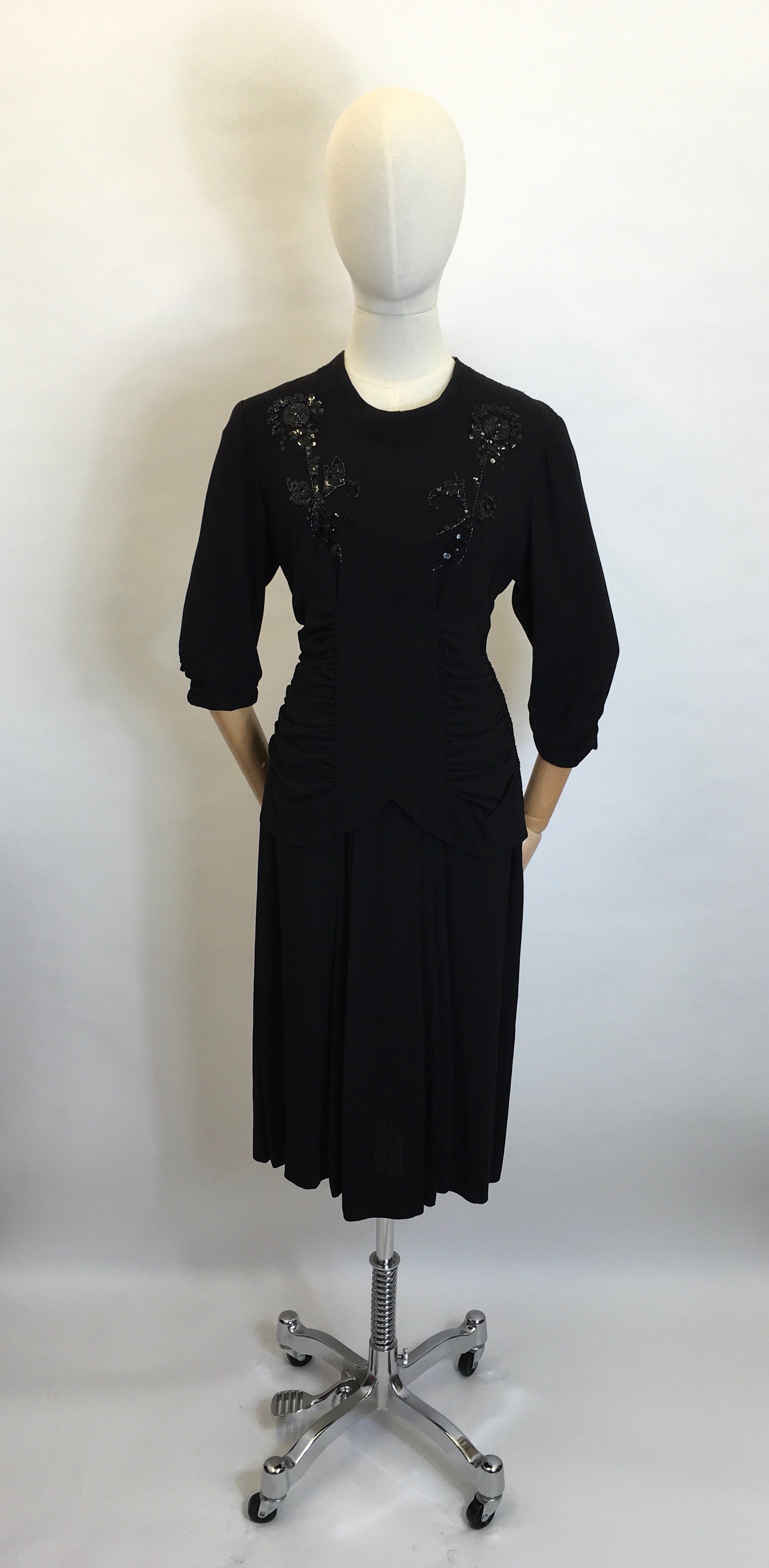 Vintage 1940's cocktail / evening dress. Made from a lovely black crepe this dress has a scoop neckline, nipped in waist, sequin embellished front adornment with ruched panelled side detailing which falls into a loosely pleated skirt. Fastens with a metal side zip and fabric covered buttons to the nape.