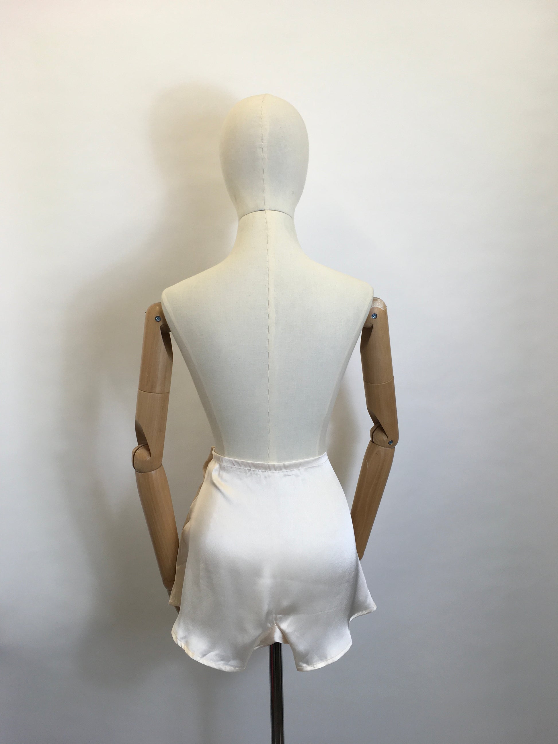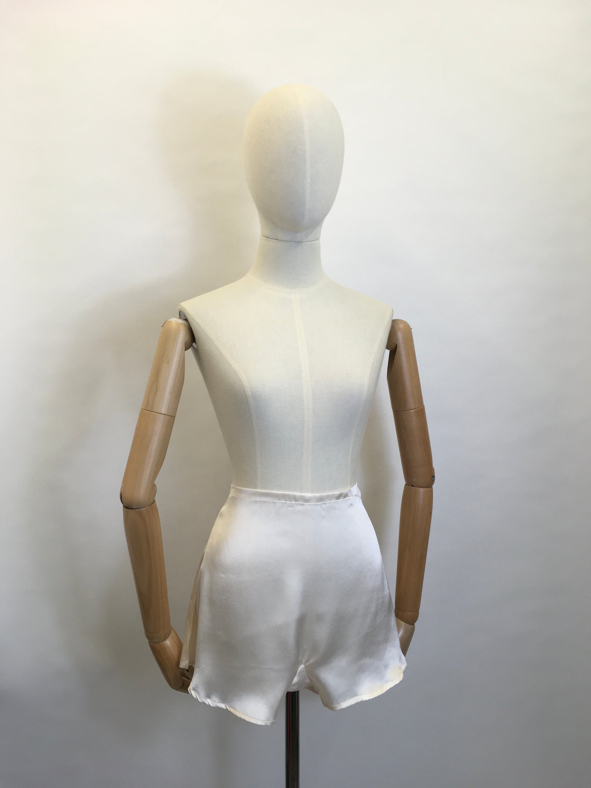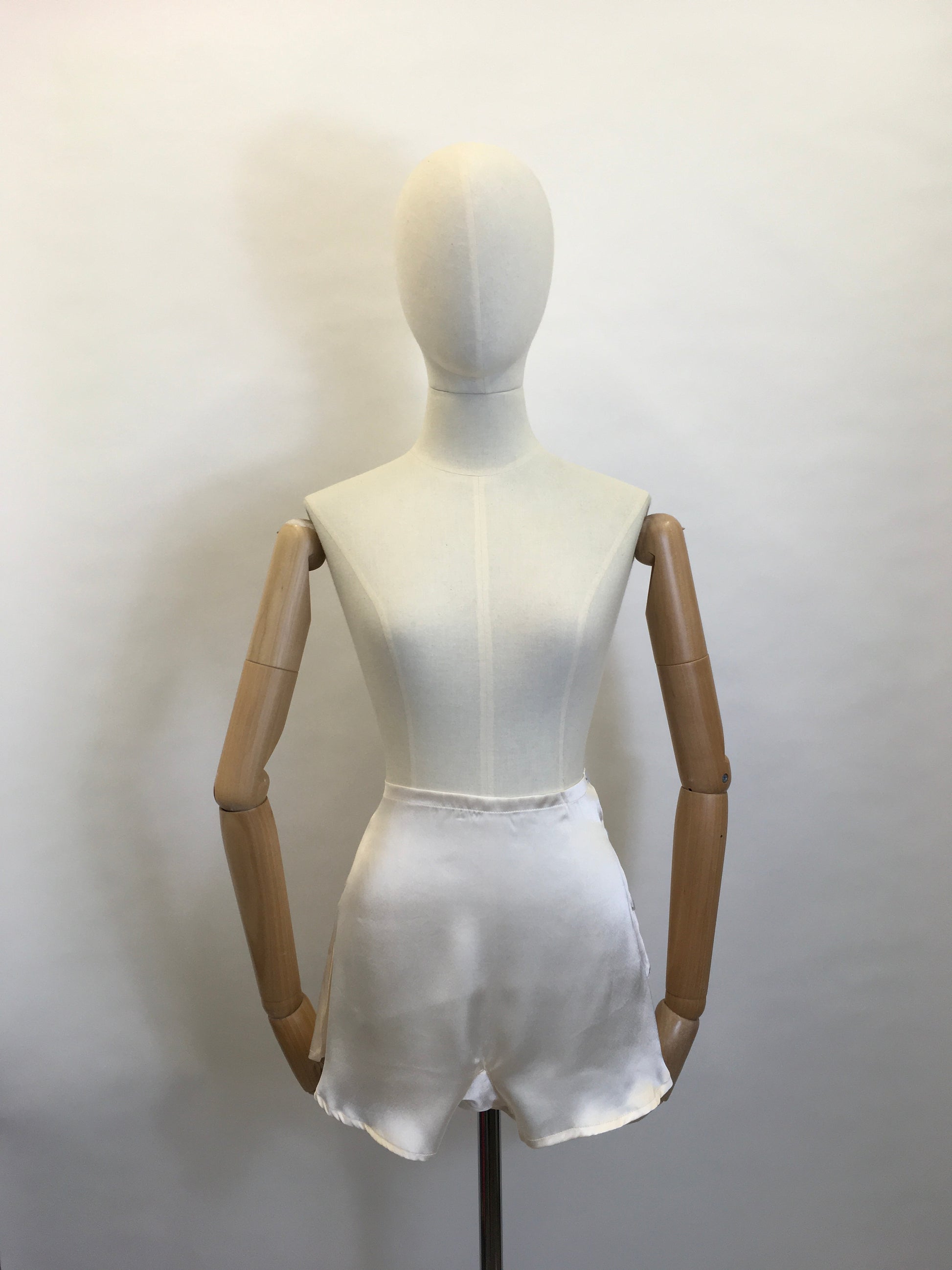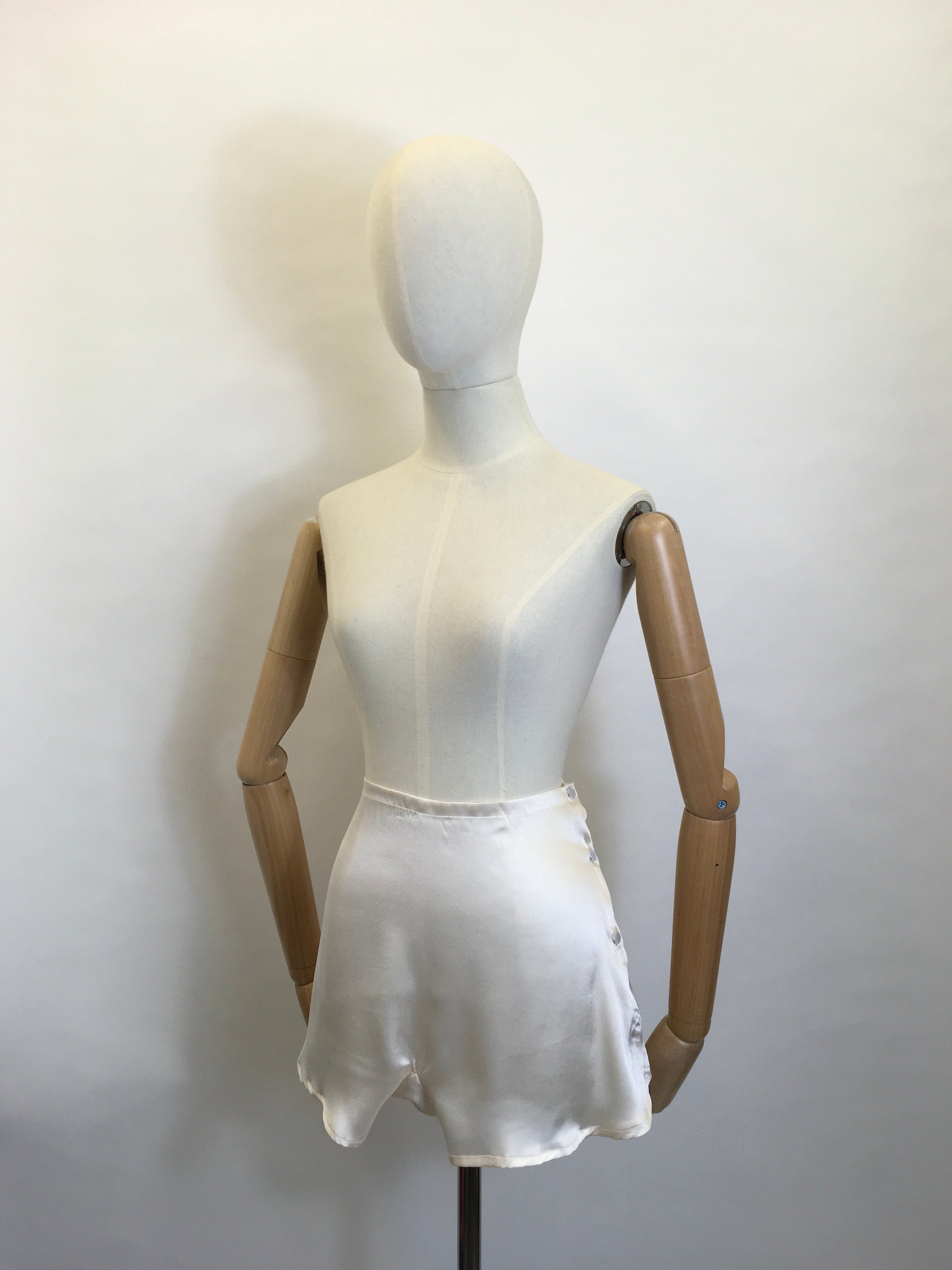 These beautiful 1940's tap pants designed by ' What Katie Did' are incredibly authentic, from the flowing soft satin, to the fit and the fastening. Designed to fit tightly at the waist, before flaring out to skim loosely over the hips and draping over the top of the legs. They fasten with a row of pearlized buttons.